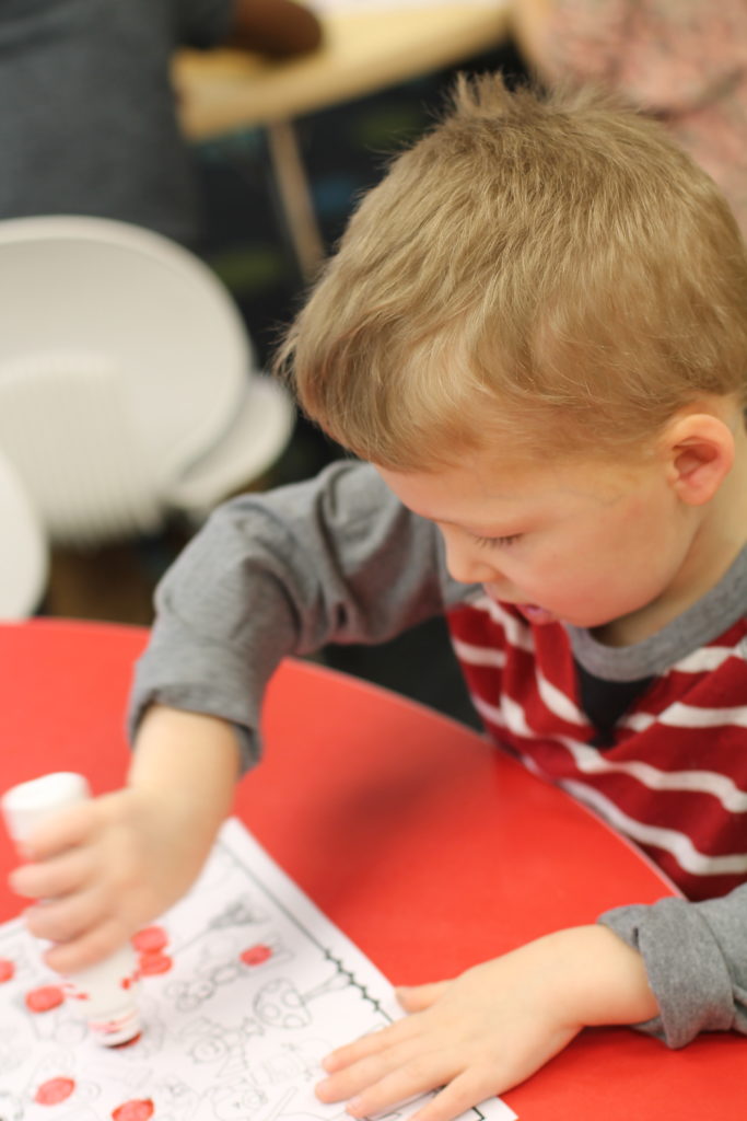 We also do some activities with beginning sounds like this one where we stamped the pictures that started with M using our dot markers.
