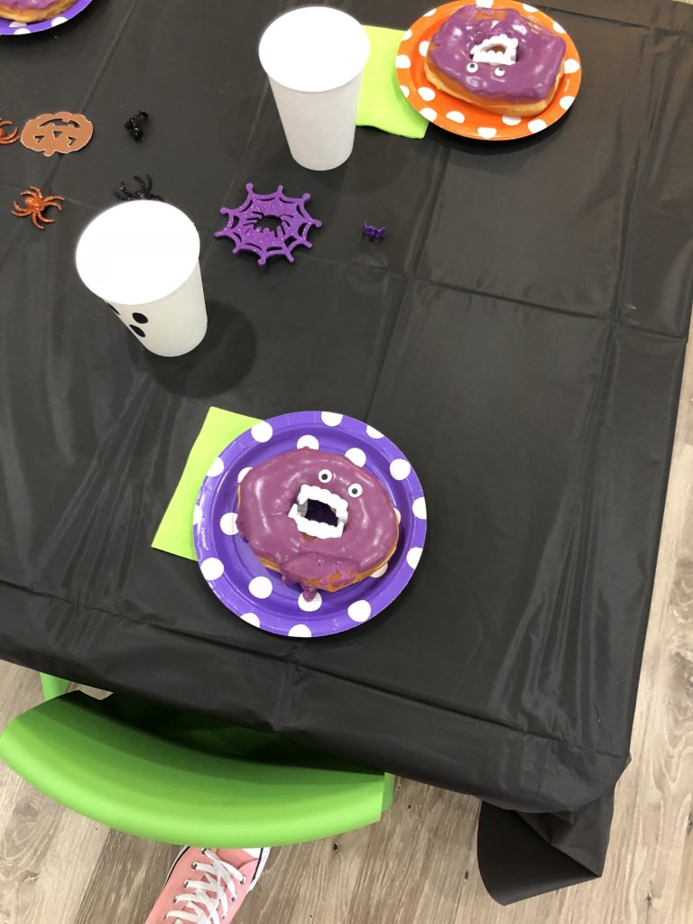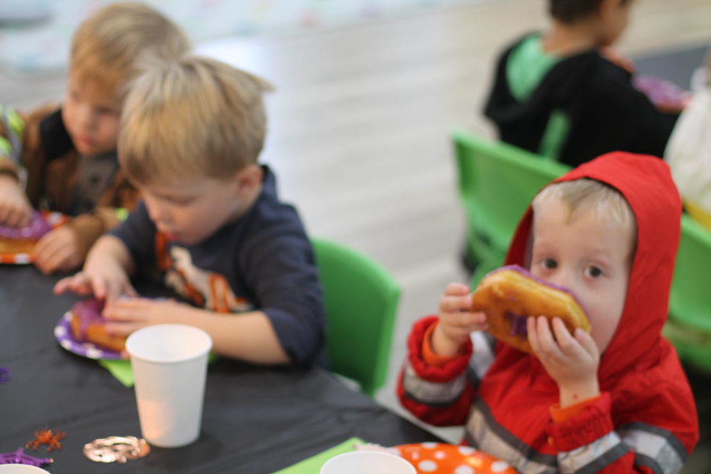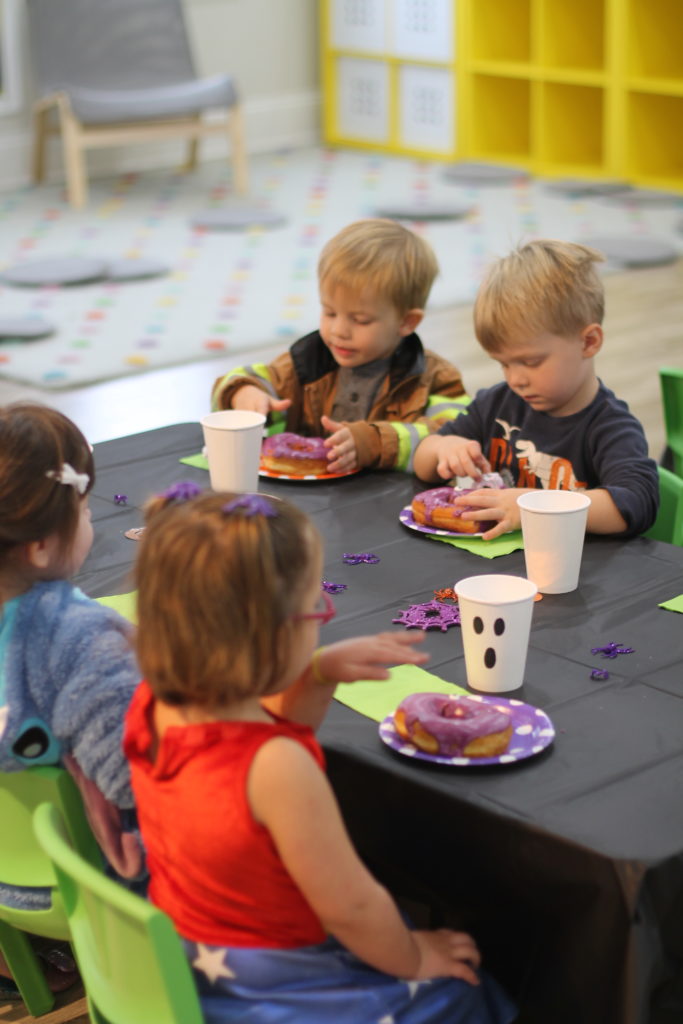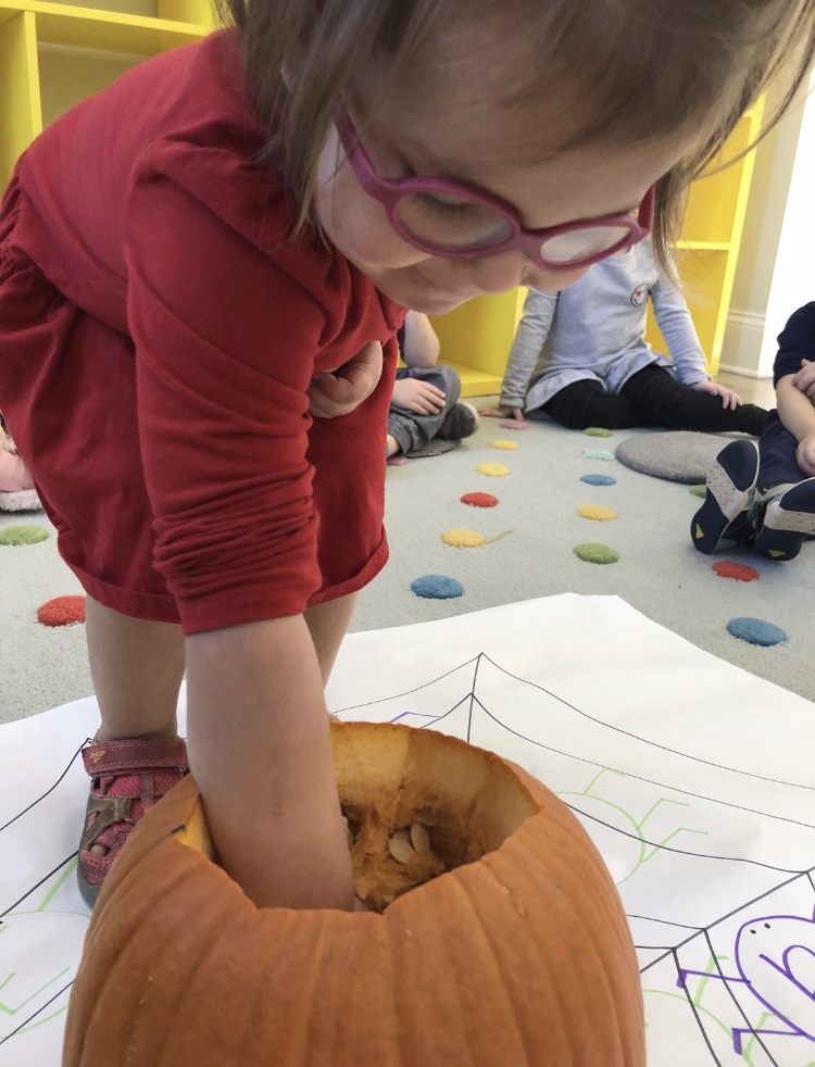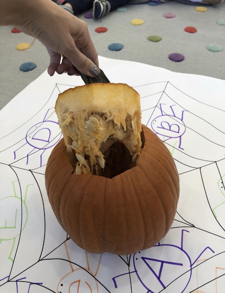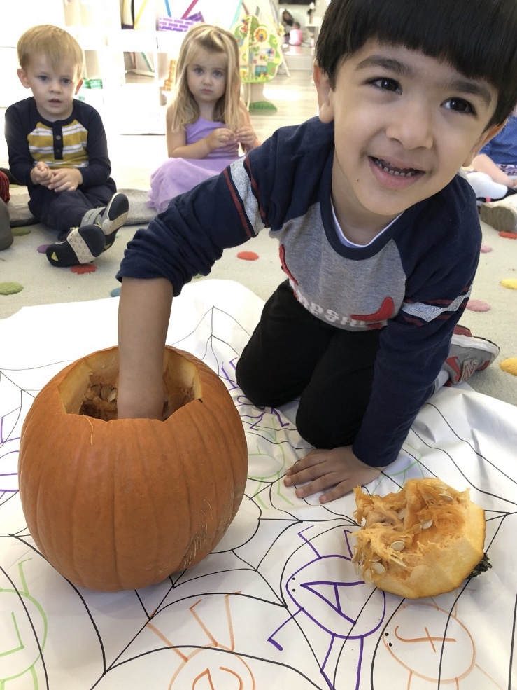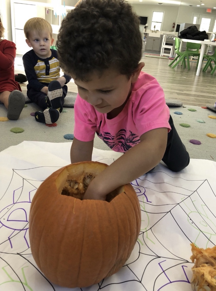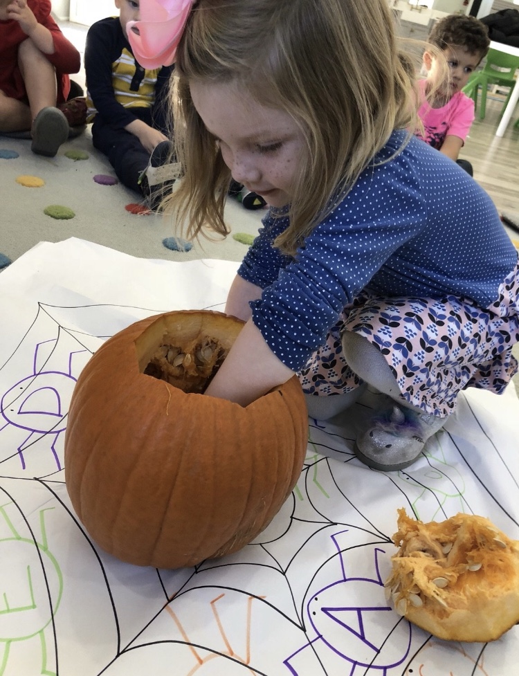 The afternoon preschool class explored a pumpkin this week! We measured it and talked about its characteristics (inside and out) using our 5 senses! The students took turns getting their hands dirty and pulling out some of the pumpkin seeds. We ended up roasting those seeds and eating them for snack!