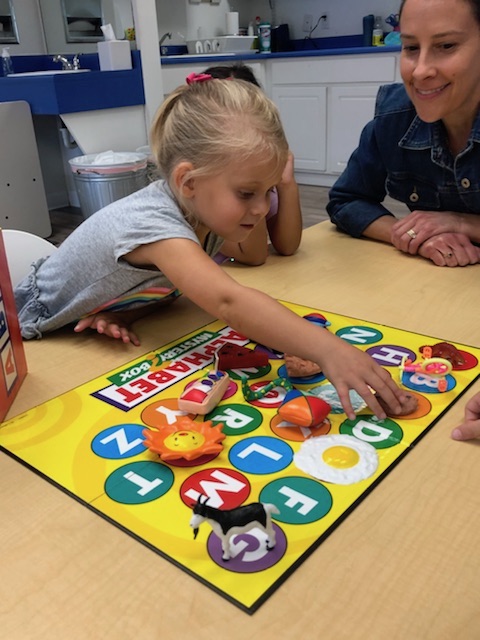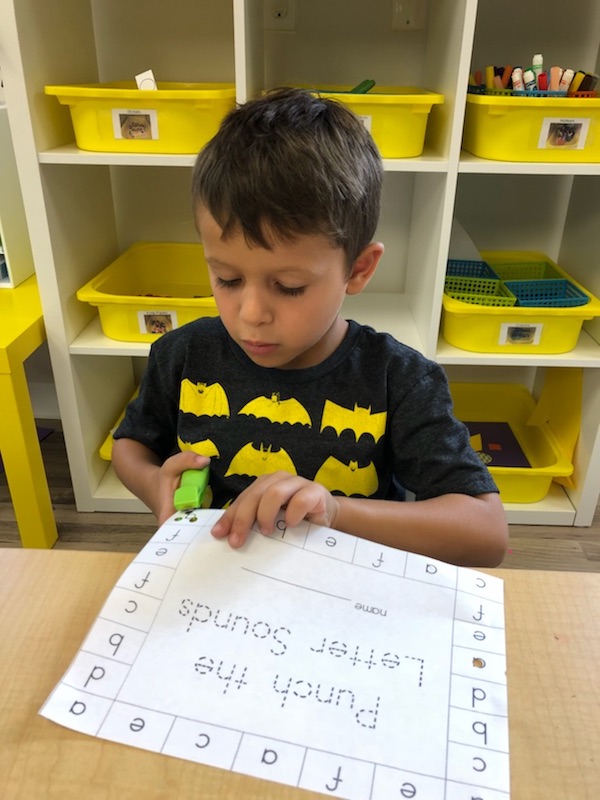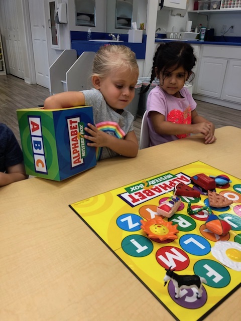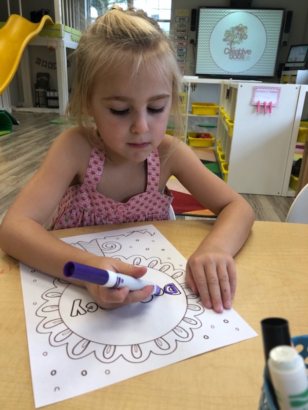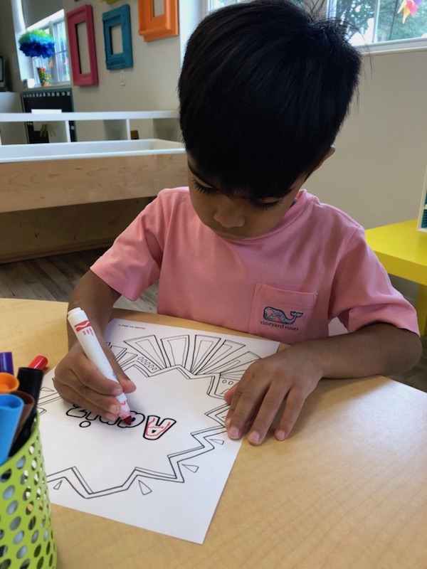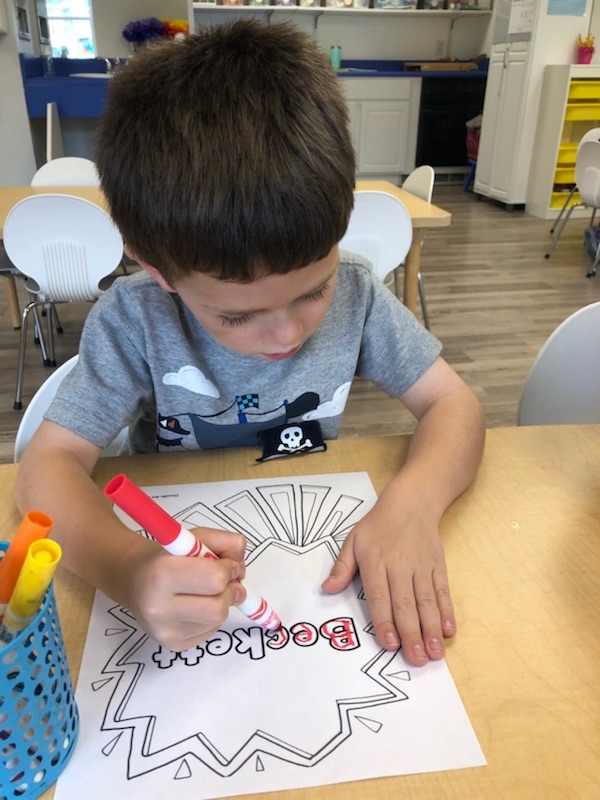 Letter and Word Awareness is the ability to identify individual written letters and words. Once children are able to identify printed letters, they develop the ability to identify entire words. The entire developmental progression from letter awareness to word awareness to fluent reading typically begins around age three with letter awareness and continues through age five, six or seven with fluent reading. Our K Prep class is beginning working on understanding that words are groups of letters separated by spaces on either side. Children’s names are the most important word to them, so what better place to start!