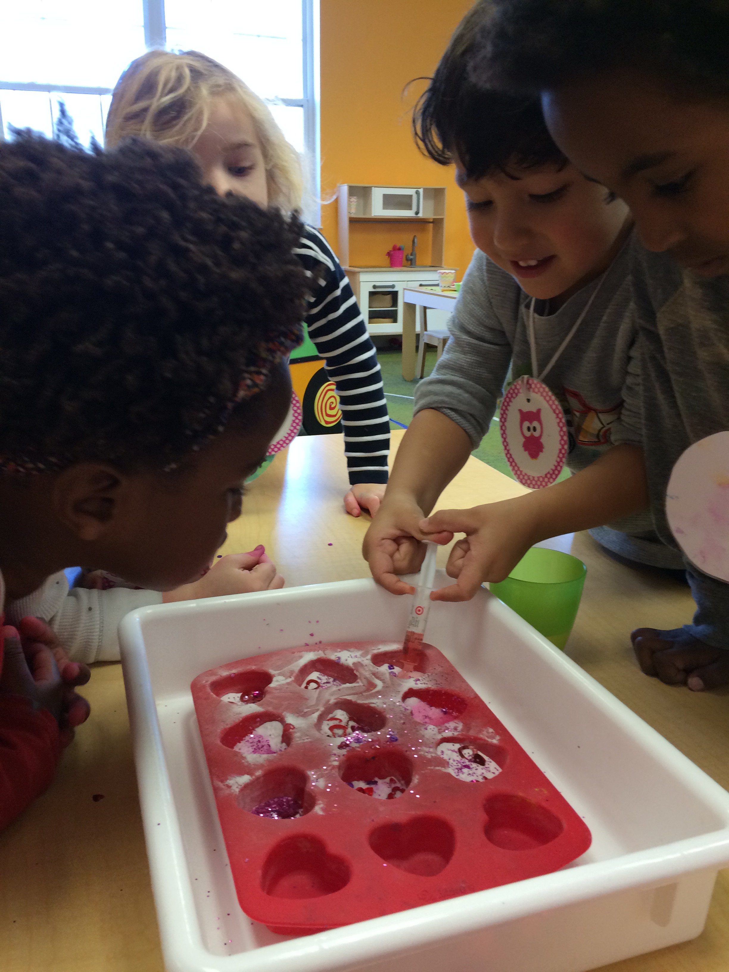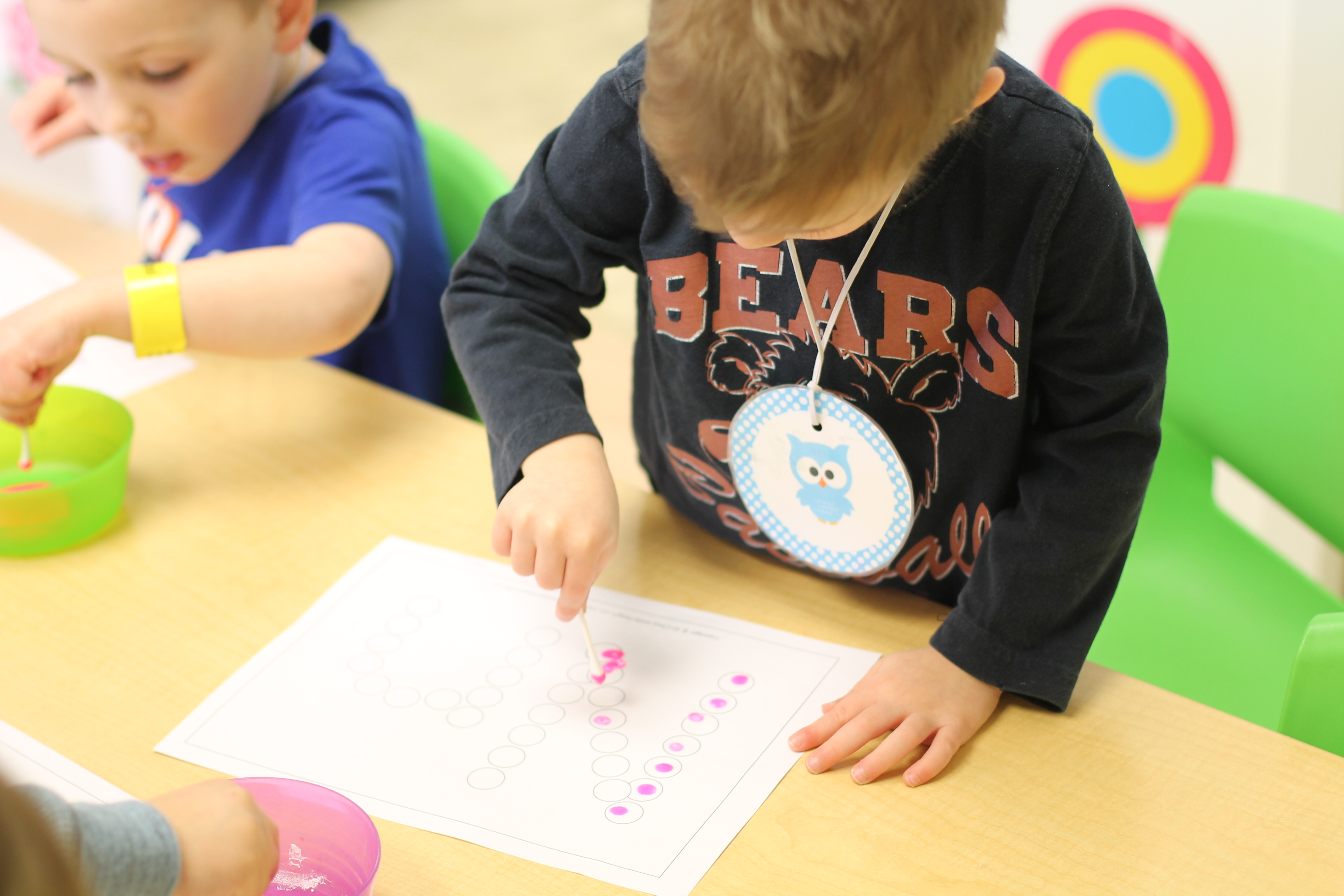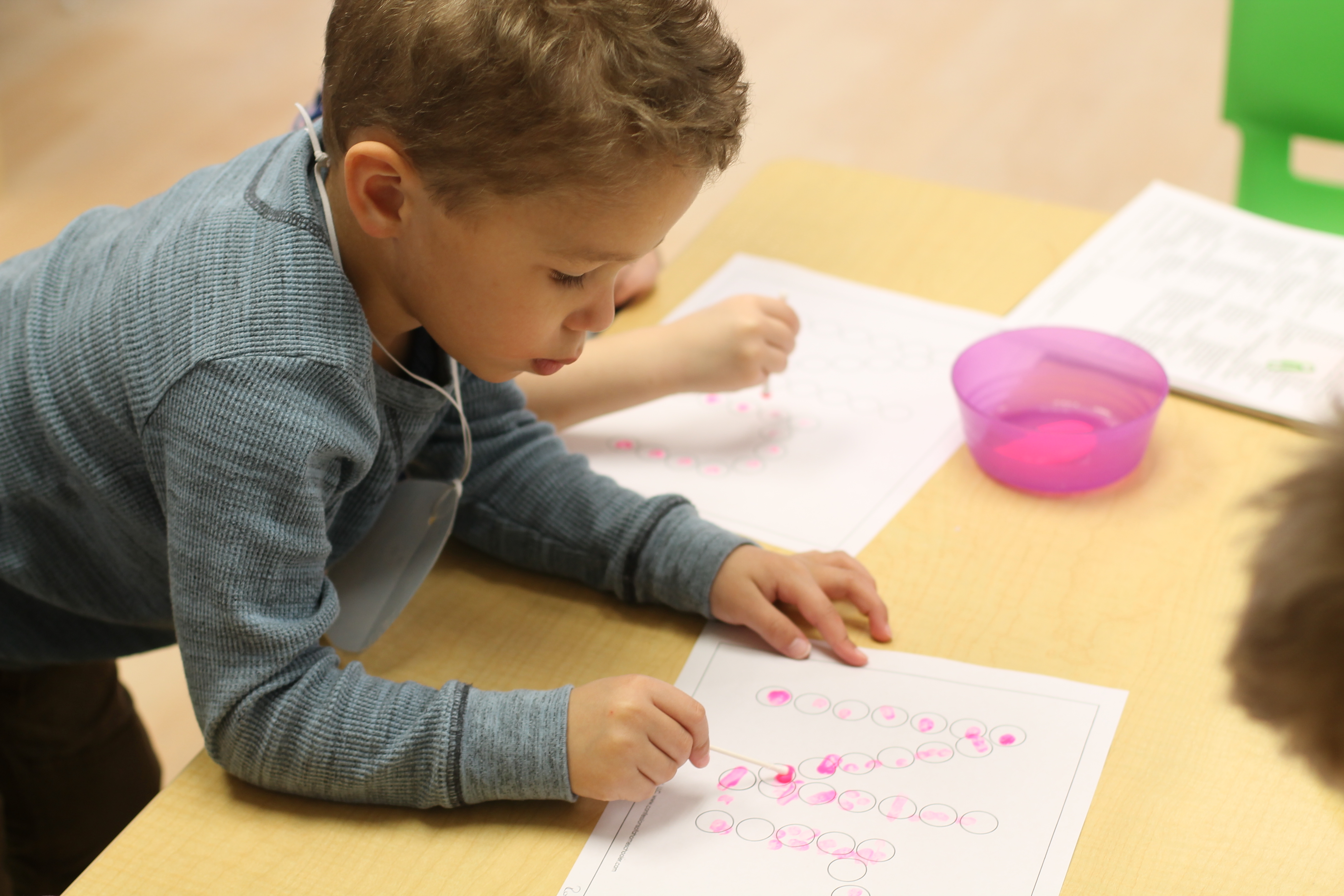 We practiced forming the first letter in our names with paint and Q-tips.