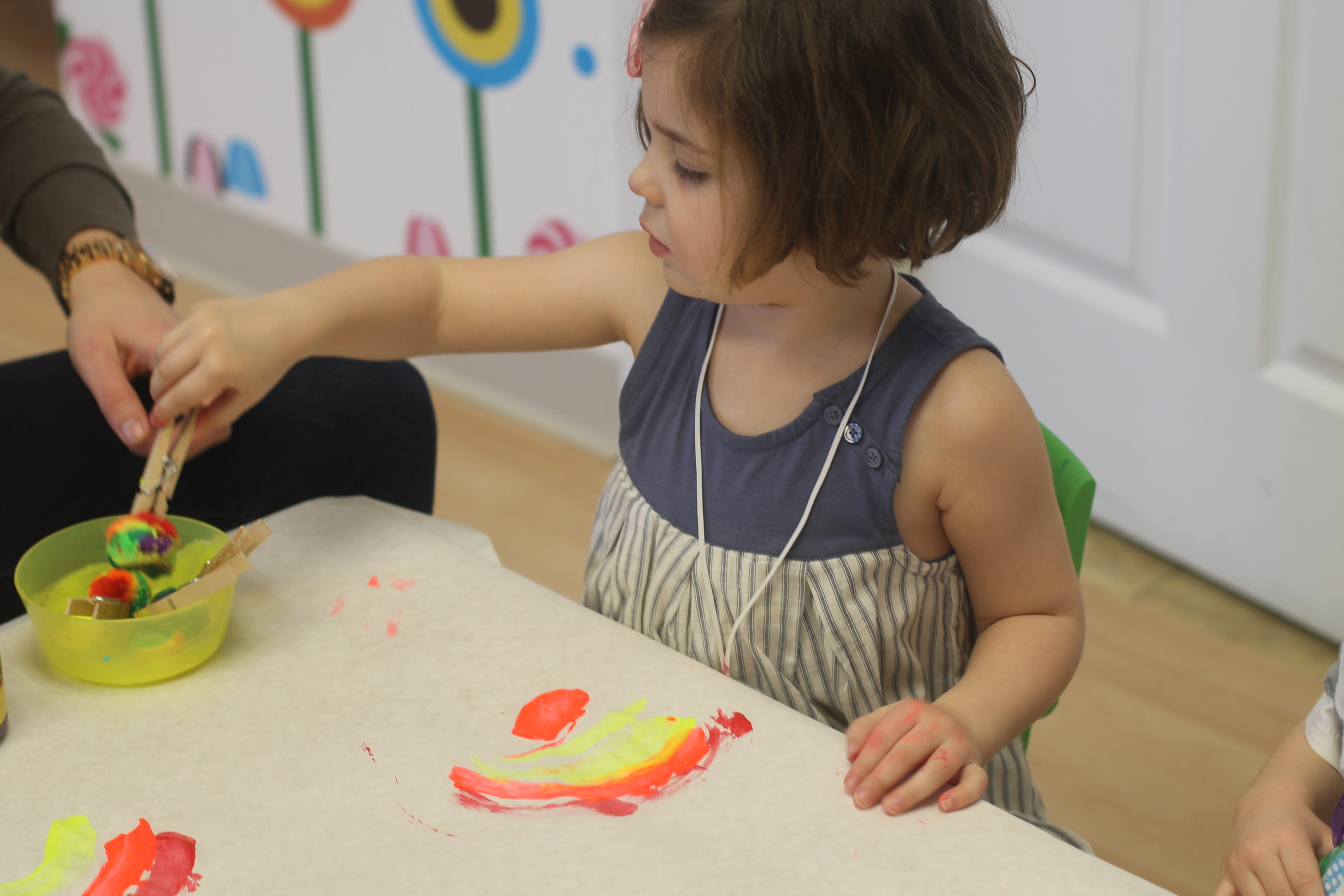 We worked on our fine motor skills and used tongs to move pom poms into each egg in the carton.