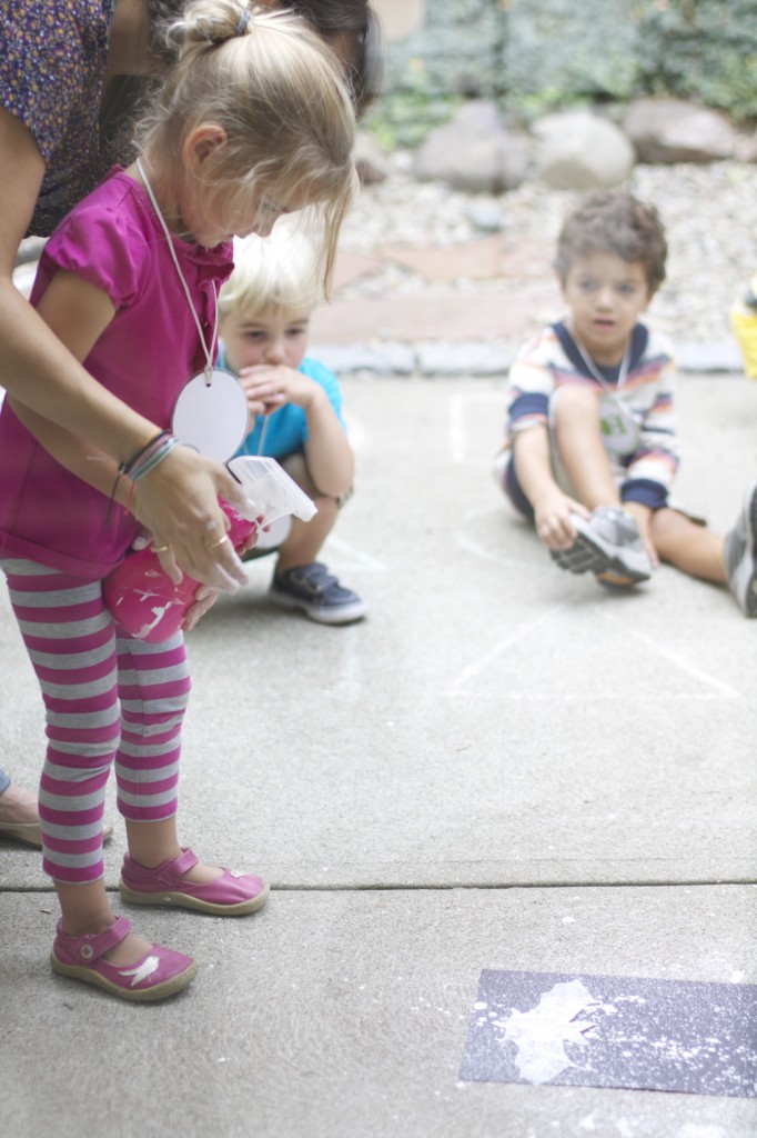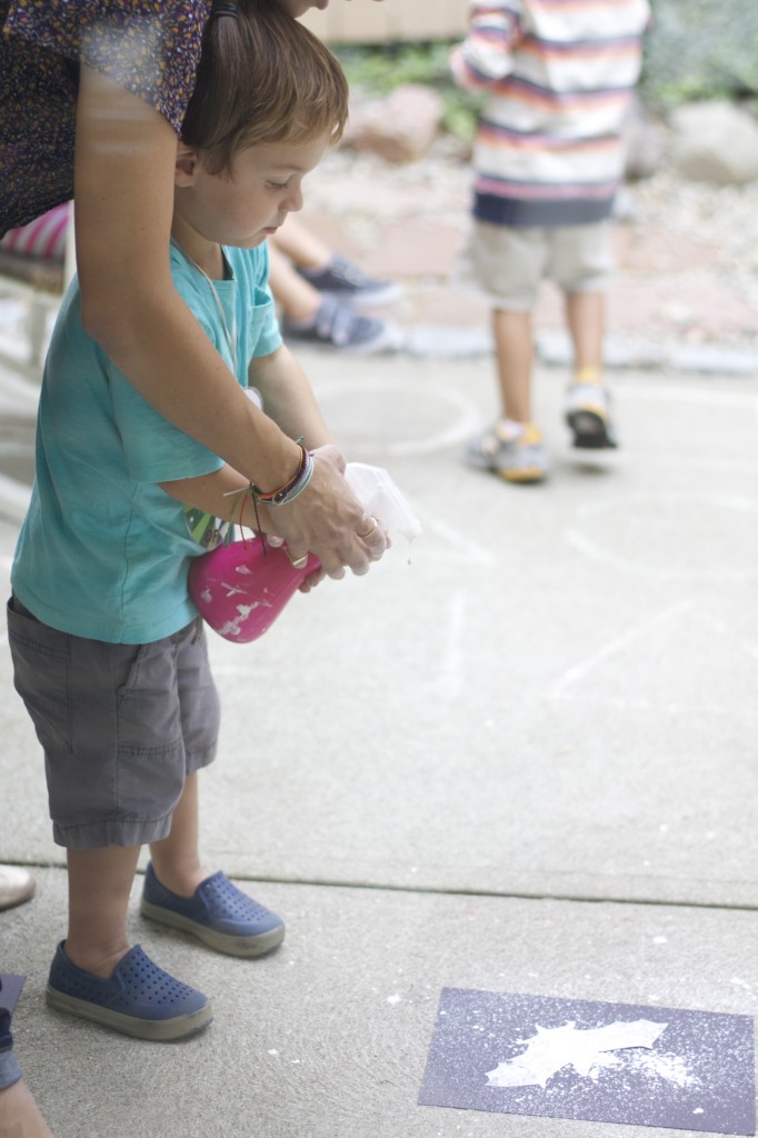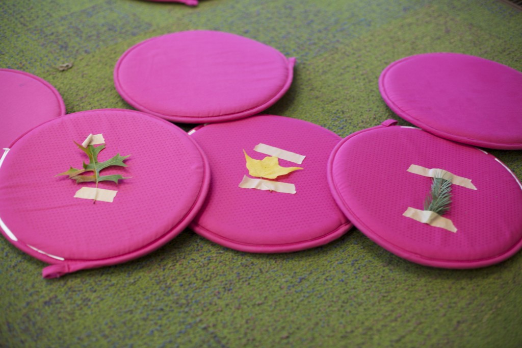 Today during our group time, I talked to the children about our new season: fall! I taped oak and maple leaves and evergreen twigs onto the bottom of the carpet circles that the children sit on. I had each child take a turn flipping over their circle to discover which leaf was under their circle, and they brought it up to me. After I had collected all of the leaves, they helped me sort them. We talked about the leaves vs. the evergreen twigs. To conclude our activity, we read “We’re Going on a Leaf Hunt” by Steve Metzger.