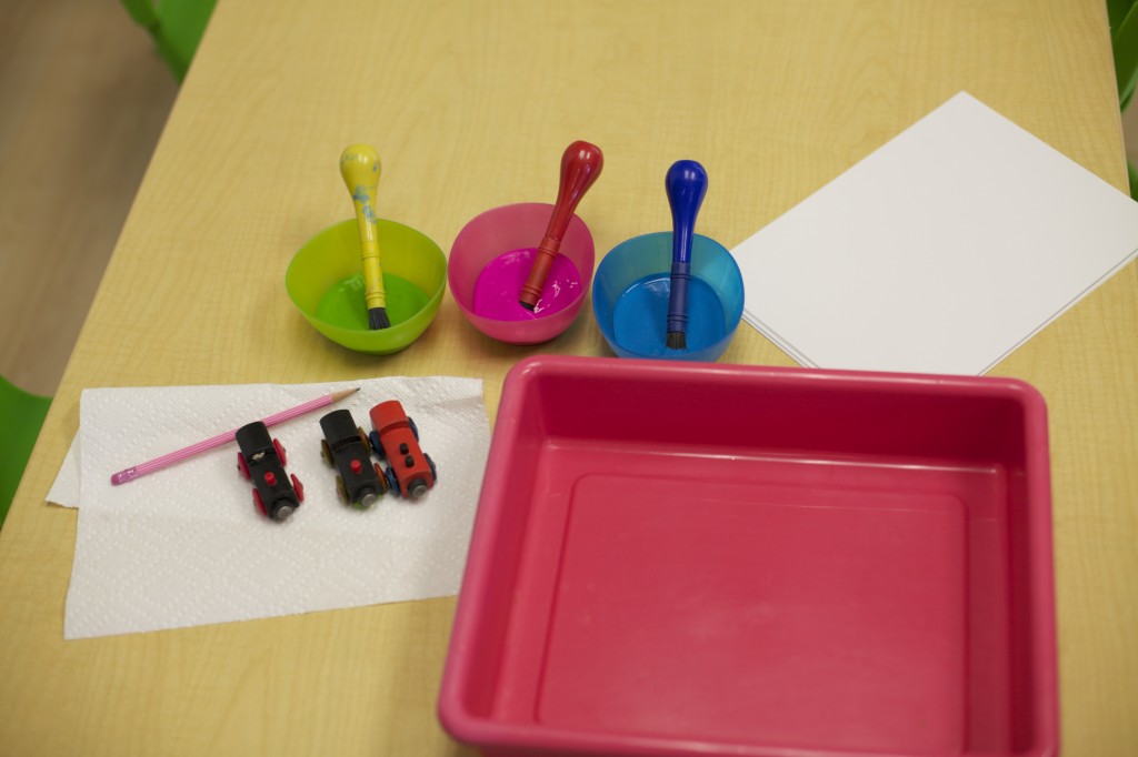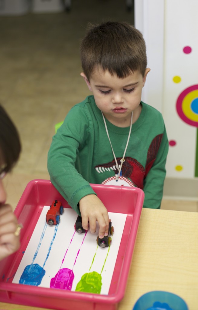 This group focused on our numbers for this month {1 and 2} as well as one-to-one correspondence and fine motor development. The children had to roll the die {which only had one or two dots on each side}, count the dots, and put the corresponding amount of beads into their bowl.