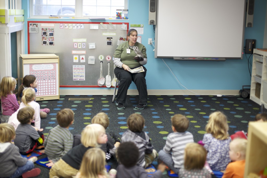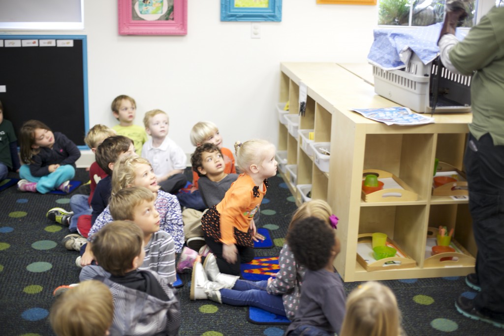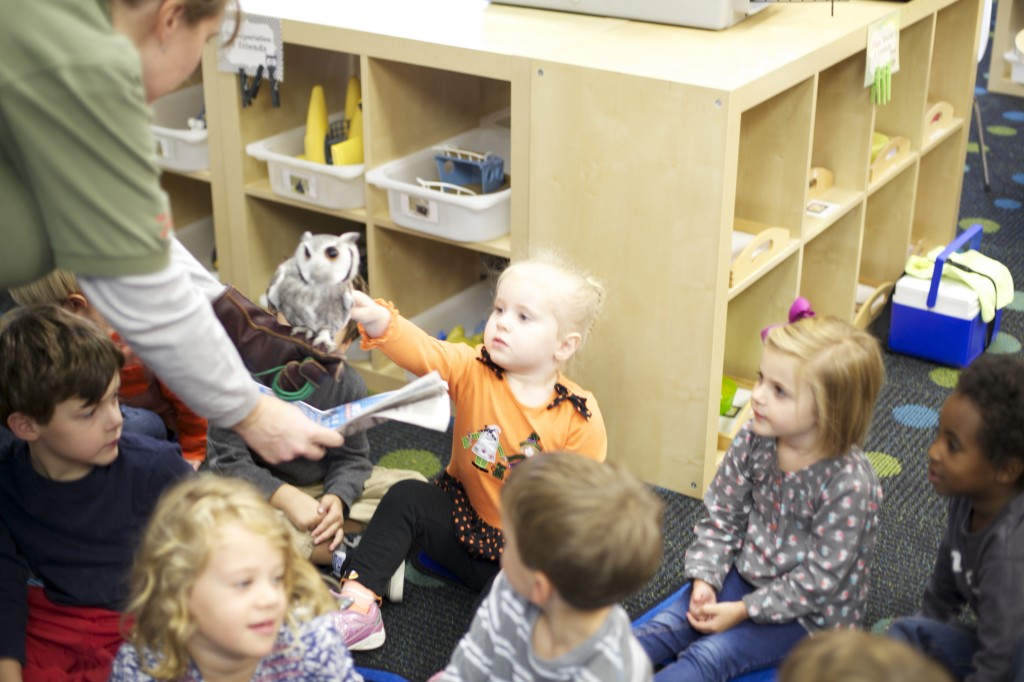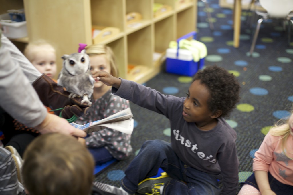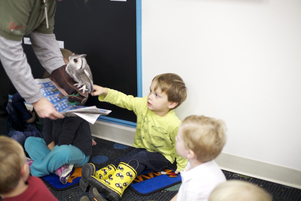 This week the zoo came to our school! A few weeks ago we studied owls, so the children were thrilled to get to meet a real owl! We noticed the owl’s large eyes, ability to turn its head around, its large talons, and its pointy “ears”. The children each had a chance to touch the owl’s soft feathers. These hands-on science lessons build the children’s curiosity and give them a chance to explore the world and creatures around them!