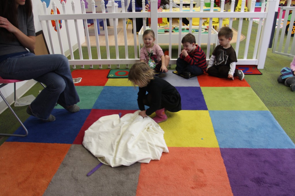 On Friday, we read the story “The Mitten” to go along with our animal theme. The story is about a boy who loses his “snow white mitten.” A variety of winter animals come along and make themselves at home in the mitten. As I read the story, I had pictures of each animal’s face glued on a purple popsicle stick that the children got to stuff in the “mitten.” (I just used a large white sheet as the mitten.) The children loved participating in the story! At the end of the story, the boy finds his very stretched out mitten. We discussed why one mitten was bigger than the other mitten. Definitely a fun group time activity! 🙂