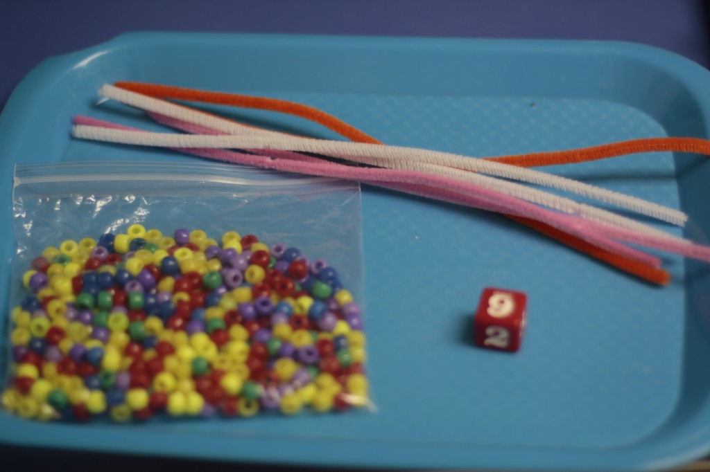 Another fine motor activity with a focus on number recognition. The children rolled the die, and they put the corresponding amount of beads on their pipe cleaner.