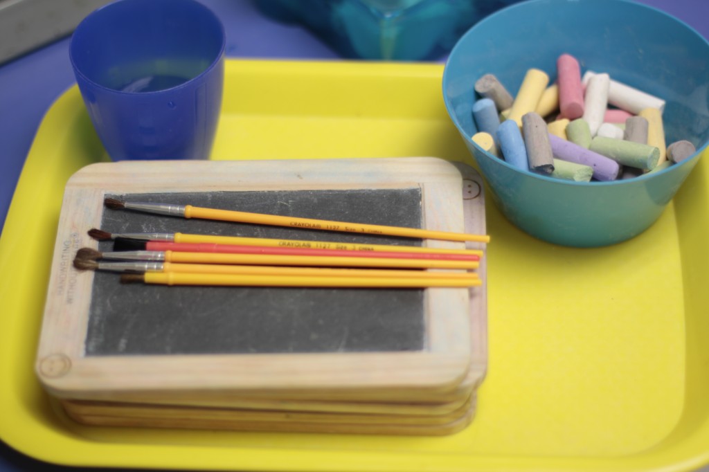 The children each got a chalk board. I wrote their name on their board. They each got a wet paintbrush and “painted” over the letters of their names. This activity helps develop their fine motor skills as they practice writing their names.