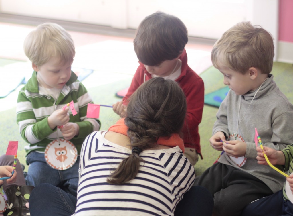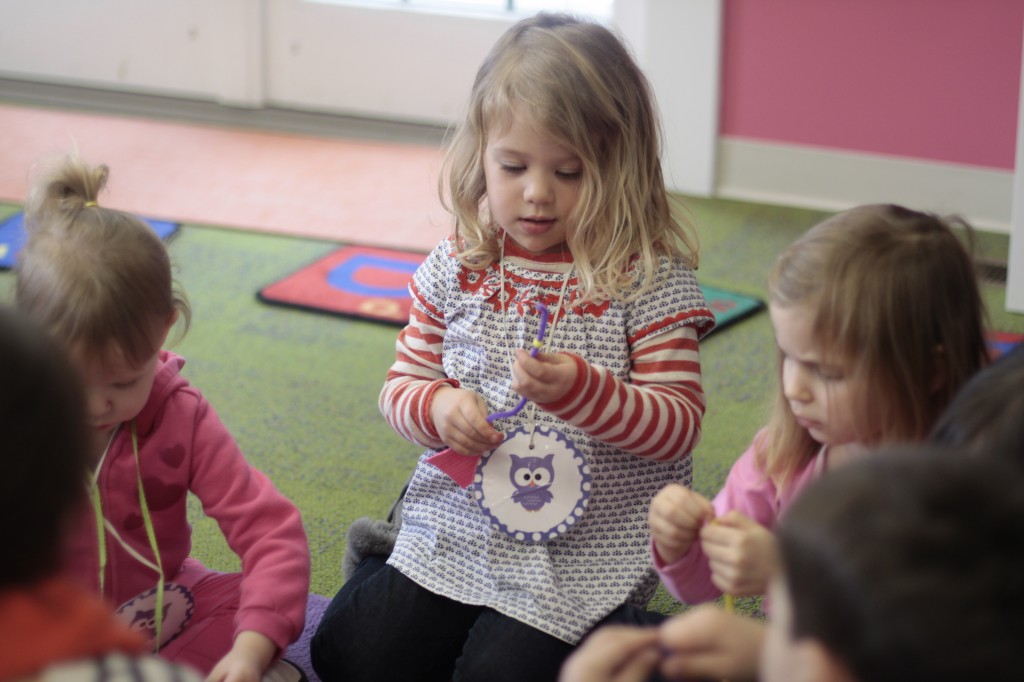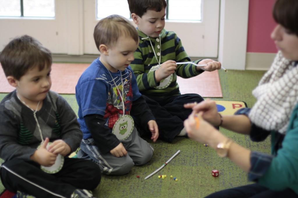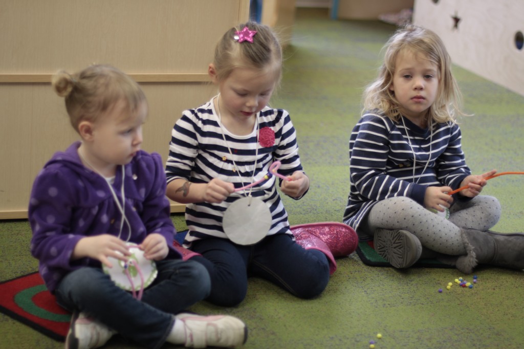 In this group, we practiced our number recognition for numbers 7-10. The children had to identify the number on the top of their pipe cleaner, then string the corresponding amount of beads onto their pipe cleaner. –another good fine motor activity.