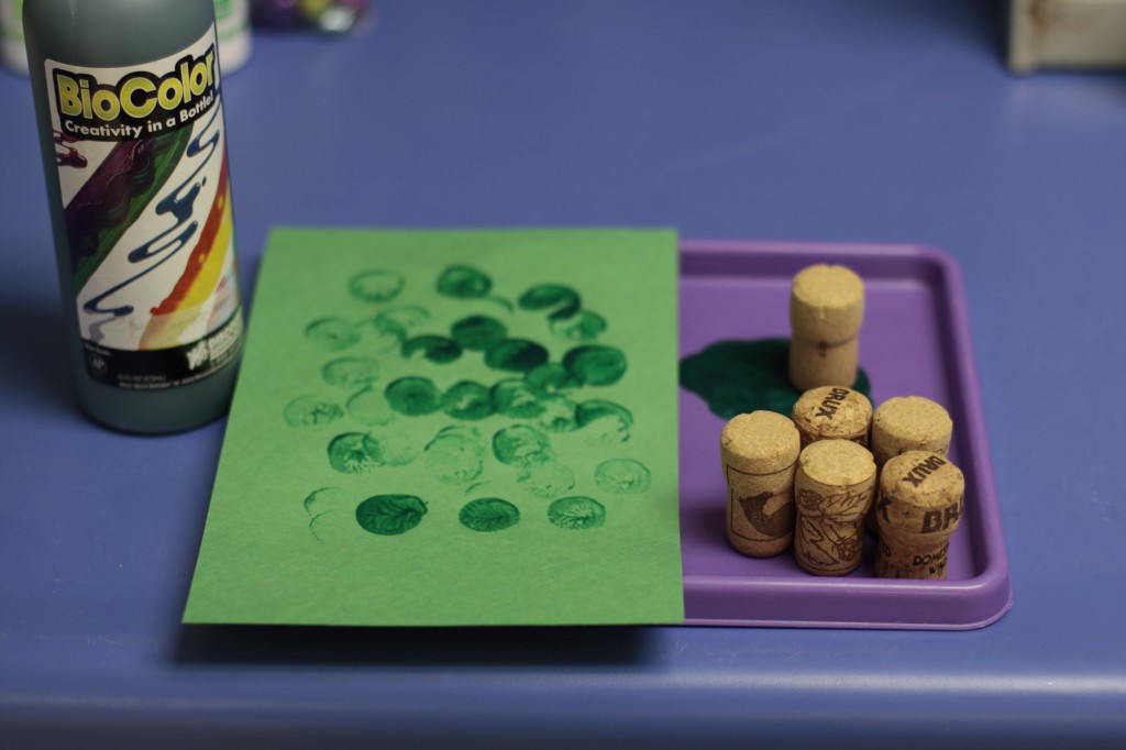 This activity was part of our alphabet book. We made “A” is for “Alligator. “The children used their fine motor skills to grip the corks to stamp green circles onto green paper. Later I cut the paper into the shape of an “A.” …still need to add the eyes and teeth! 🙂