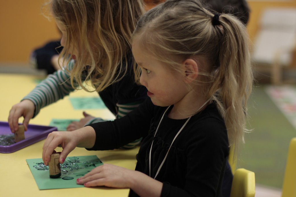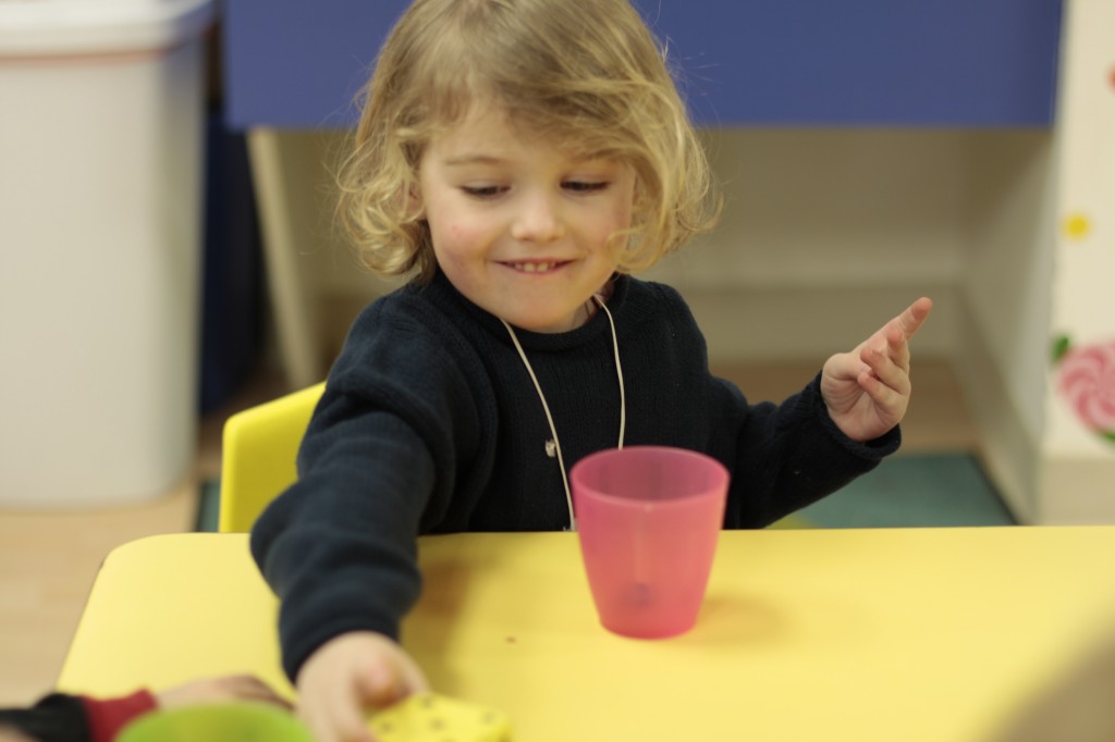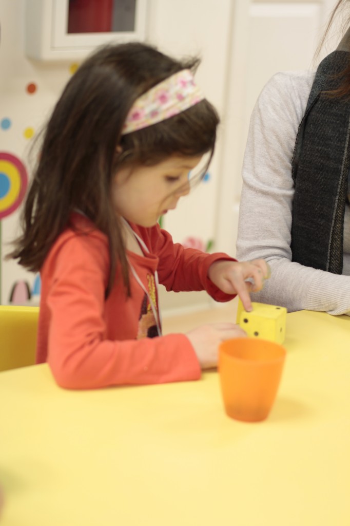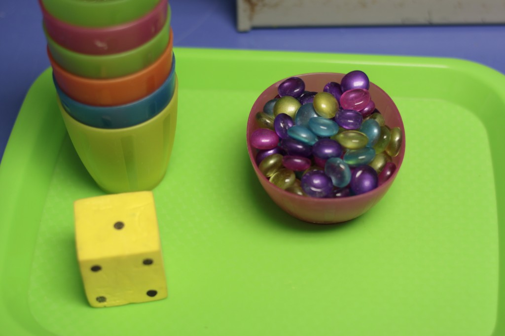This activity promotes one-to-one correspondence and counting. The children rolled the die, counted the dots on the die, then put in the corresponding amount of glass beads into their cup.