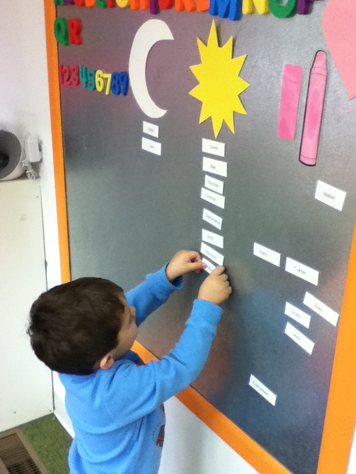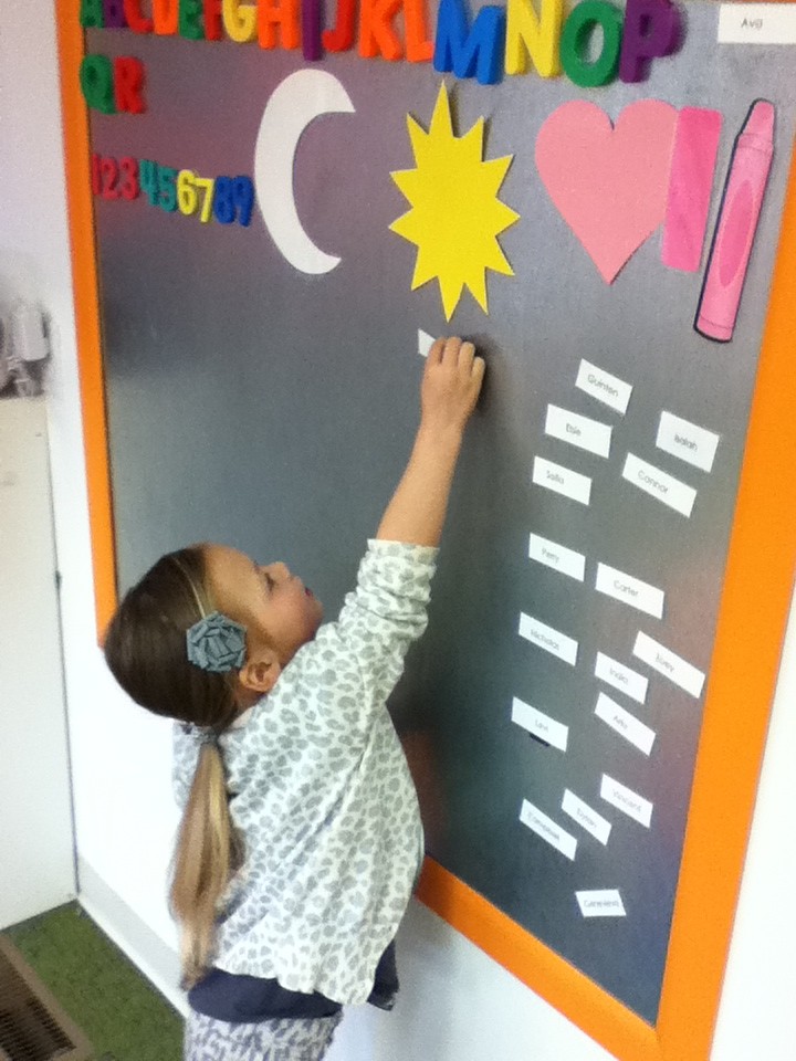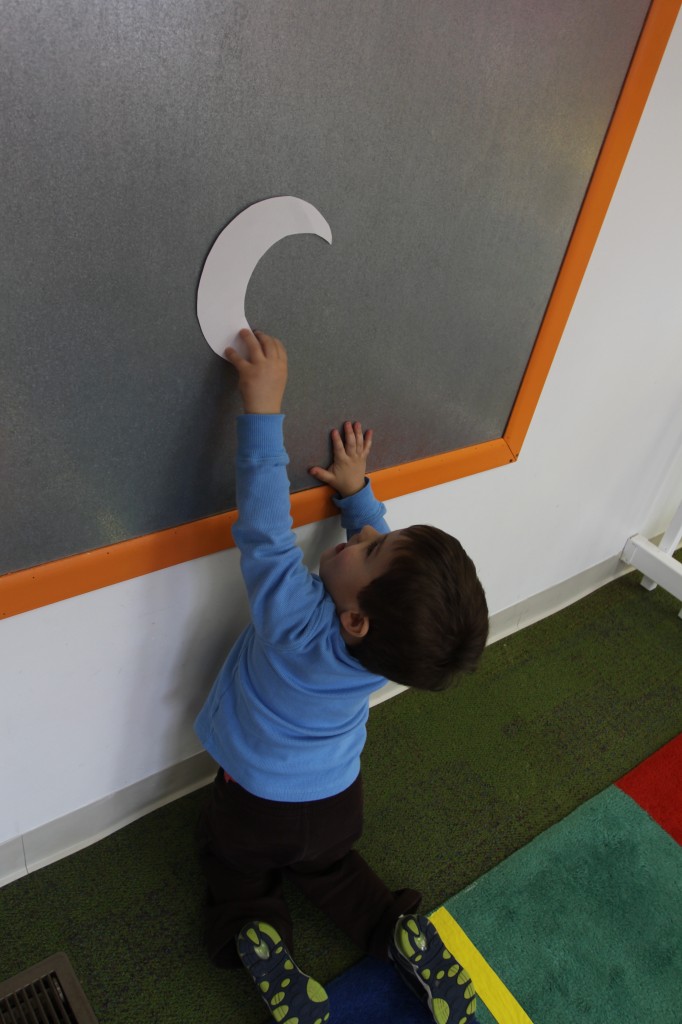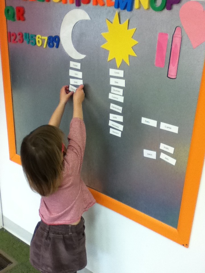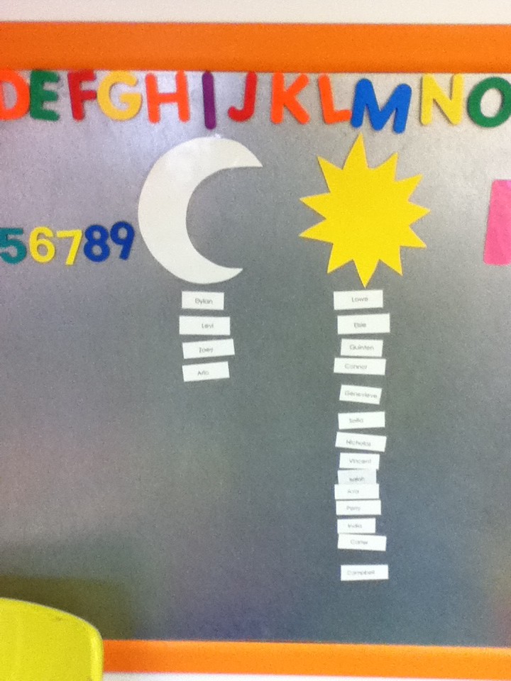 This month, our theme has been “space.” Earlier this week, we read about the moon and looked at real pictures of the moon up close. Today, we read a book about the sun and looked at real pictures of the sun. We followed it up with a discussion about what we love about the sun. Next, I had the children come up to the board, find their name, and choose which one they liked better: moon or sun. The sun was the winner! 🙂