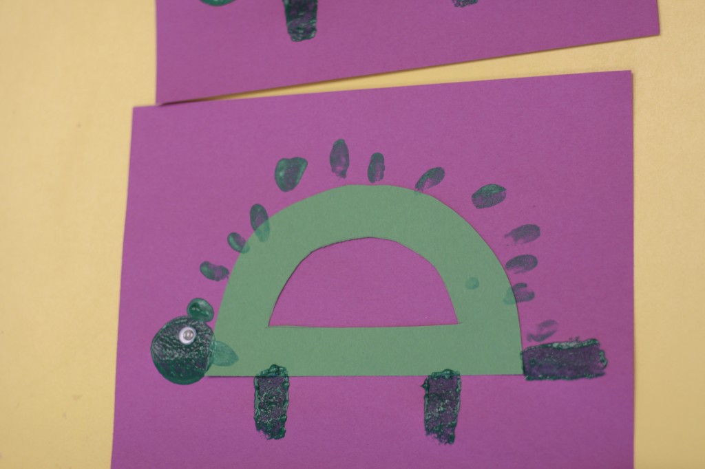 In this group we learned about the letter “D”…by making “D is for Dinosaur.” We painted our fingers then painted “spikes” on the back of our dinosaurs. This was a fun sensory/art experience for the children as we discussed the sound that the letter “D” makes, as well as what words start with “D.”