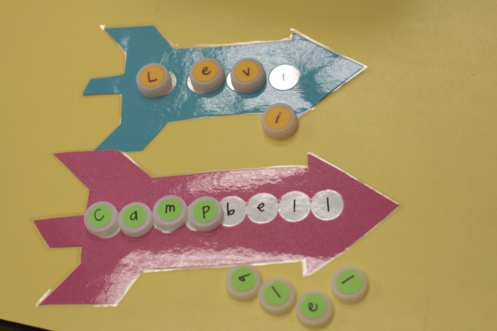 This month, our theme is “Space.” So Ms. Kate made a name activity for the children using bottle caps and space ship cut outs…to go along with our theme. The children had a lot of fun with this new activity.