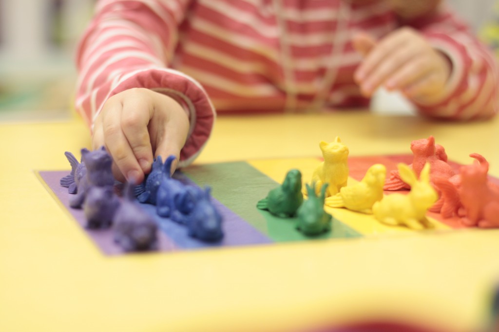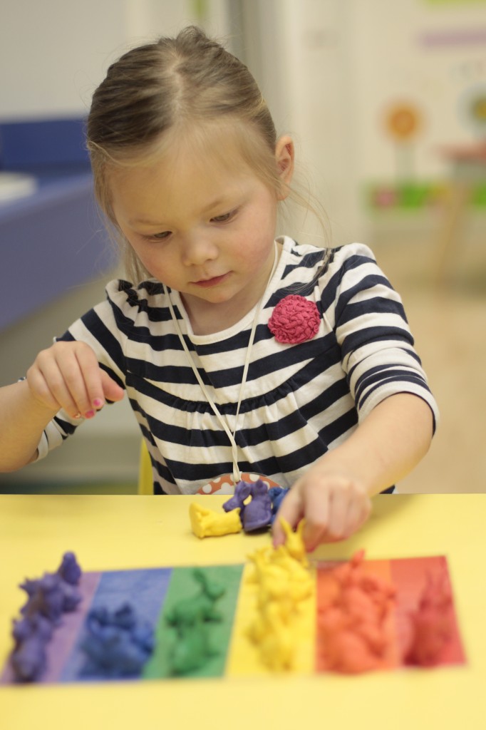 In this group we practiced our matching skills while incorporating the colors (in order) of the rainbow. As an extension, we counted how many animals were on each color. We pretended like we were at a pet shop and had to organize the animals by color.
