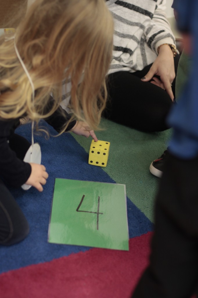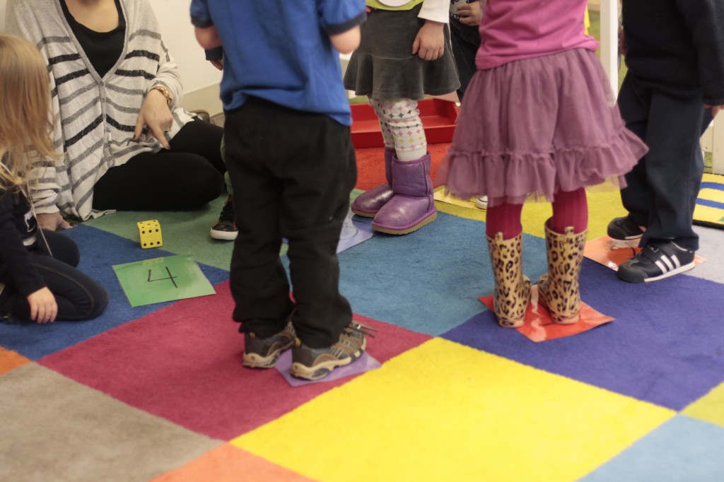 In this group, the children practiced their number recognition by rolling a die then standing on the paper with the corresponding number on it. At the end, they counted how many children were on each number.
