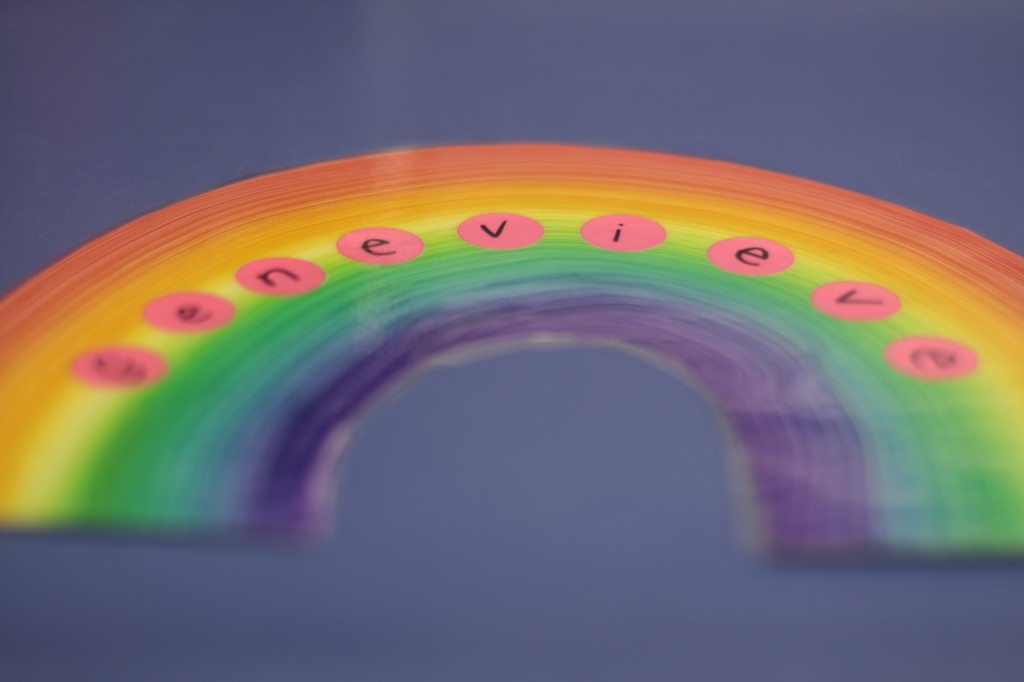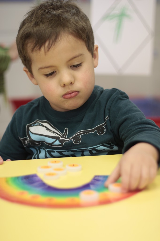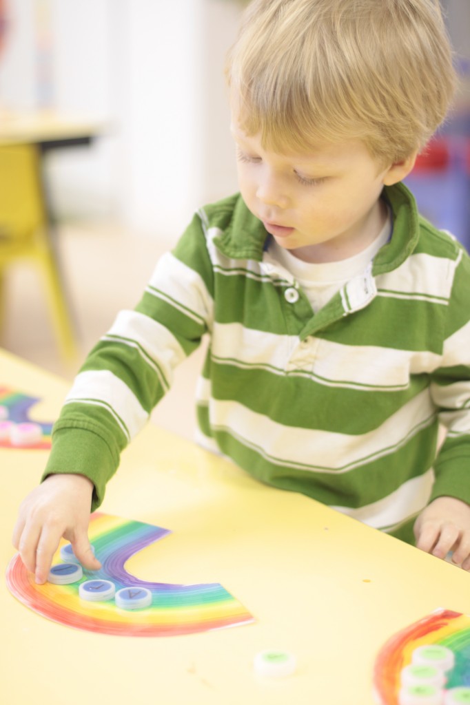 This is our new name activity that the children do when they first come to class. They have to use their fine motor and matching skills to match up each bottle cap with a letter on it to the corresponding letter on the rainbow.
