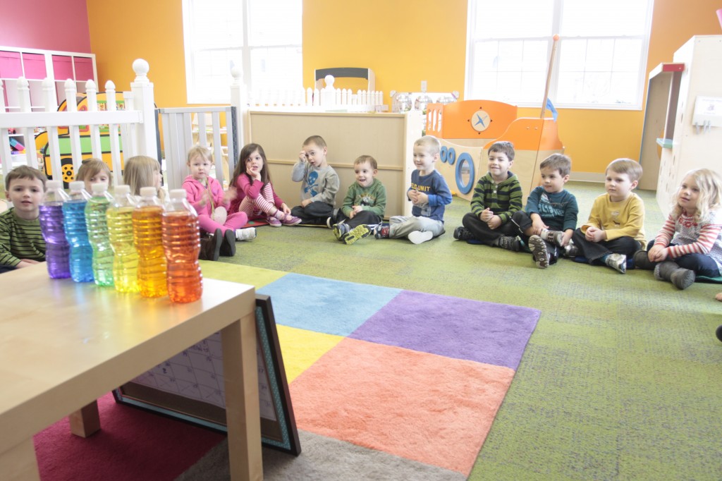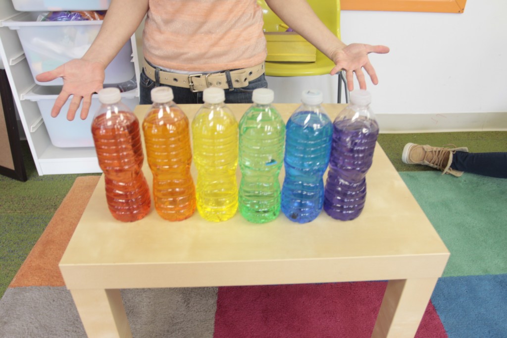 Today we continued our exploration of the rainbow by making our own water bottle rainbow. I had 6 bottles of water on a table. I asked the children to look at the picture of the rainbow in front of the table to tell me which color comes first. They would tell me, then I would put the corresponding color of food coloring into the bottle. The children were VERY interested and engaged in the activity!