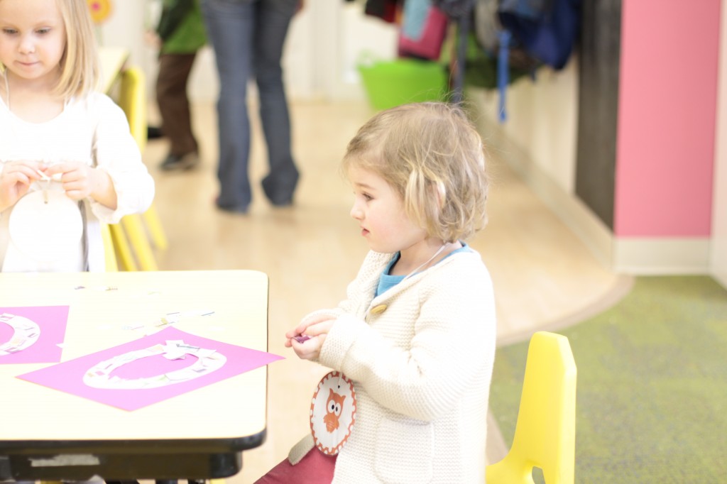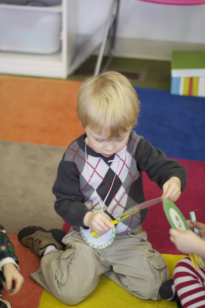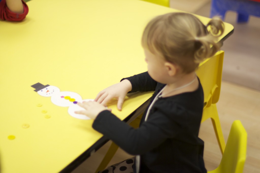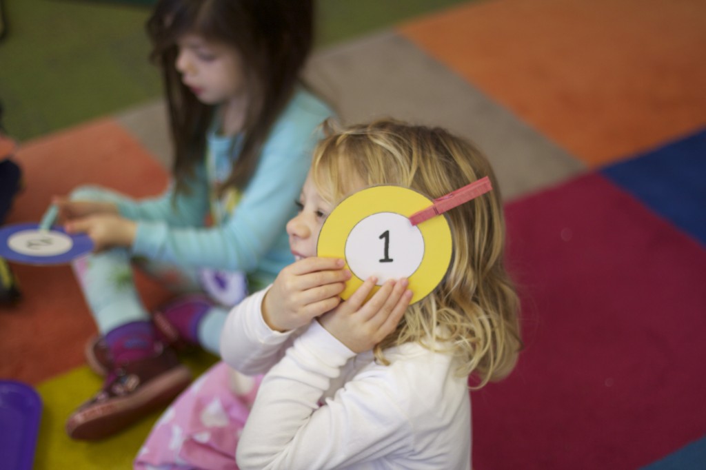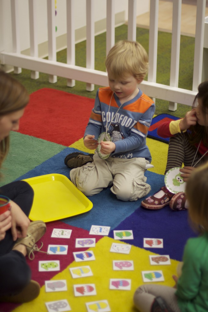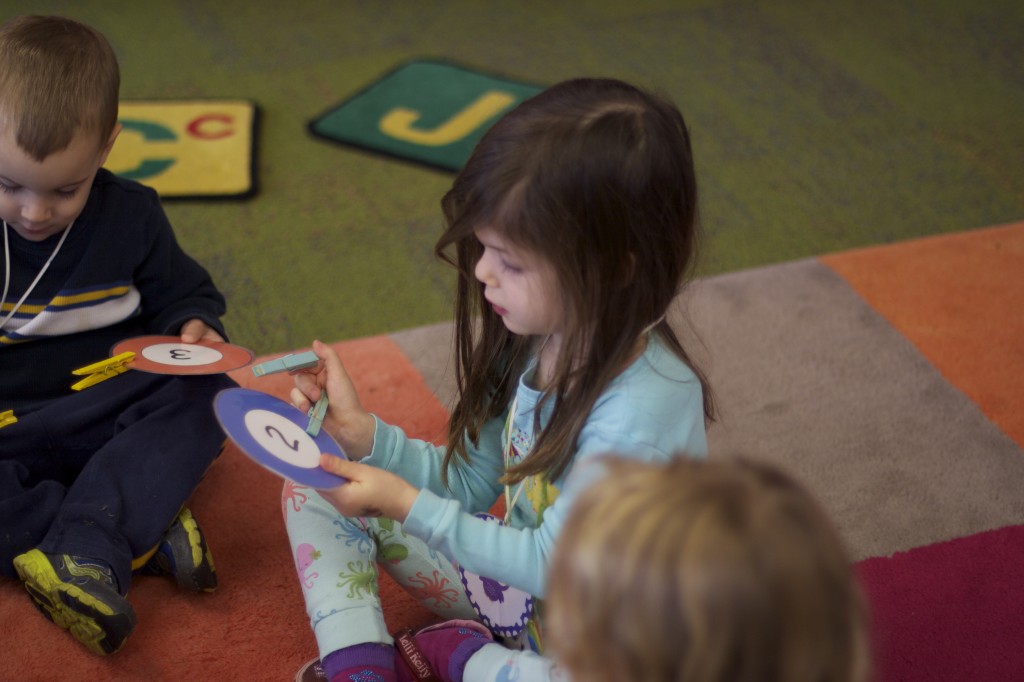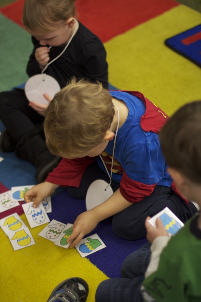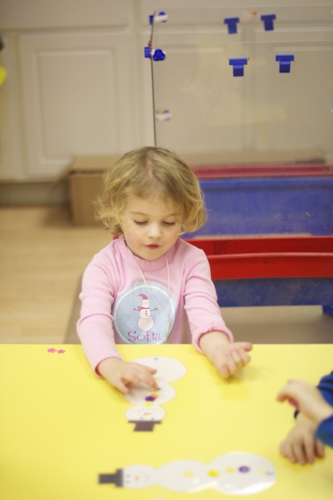 Today we started two new things! 🙂 During whole group time, I introduced the class to the clip system –which is used in the preschool room– for choosing a center. The children are to choose a center, take a clip off of the sign, clip it onto their shirt/dress, and play at that center. When they are finished, they clean up their mess, remove their clip, place it back on the sign, then choose a different center with clips available. This keeps the room calm, and the popular centers are not overcrowded. After I talked about how the system worked, I had the children, who are in the preschool room in the morning, demonstrate how to put on the clip and remove it when they are finished. The preschool children are now my official “teacher’s helpers” –whether it’s helping the younger children with clips or reminding them to use/take off their clips.