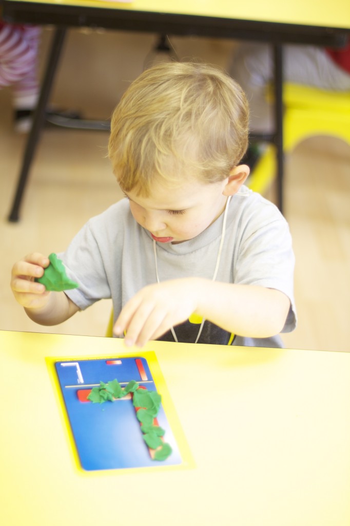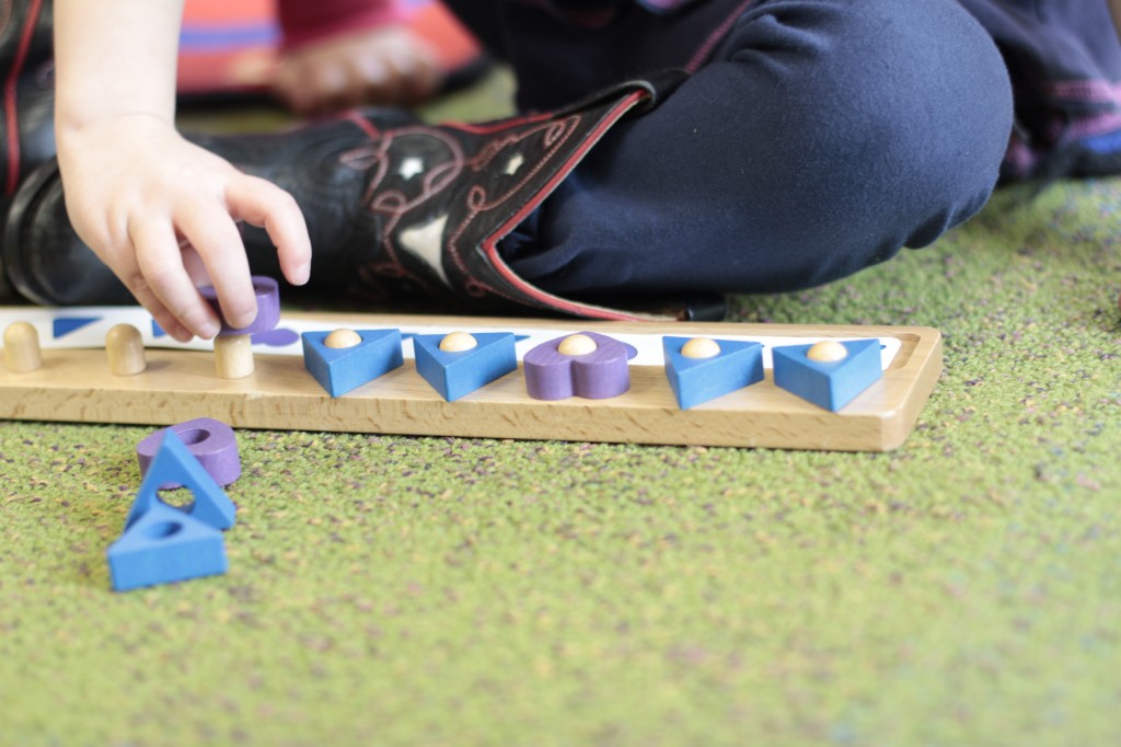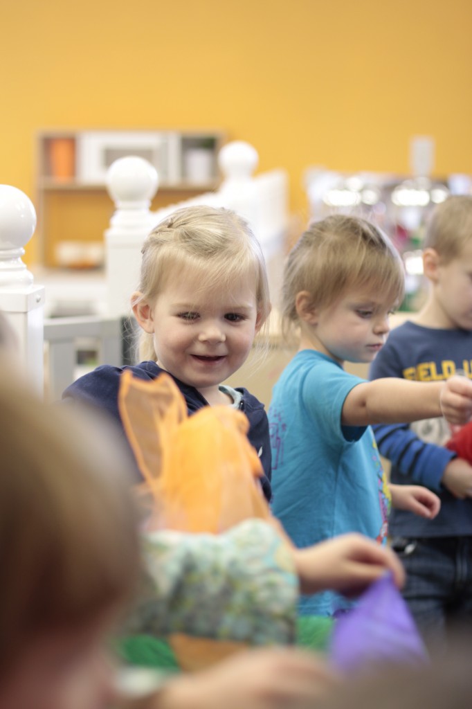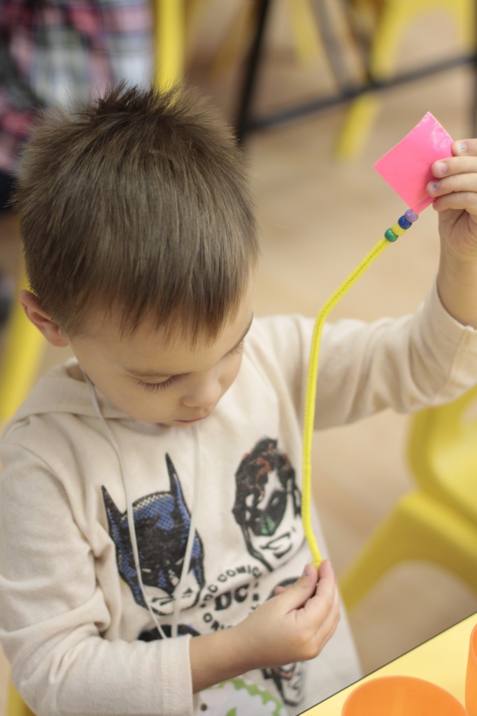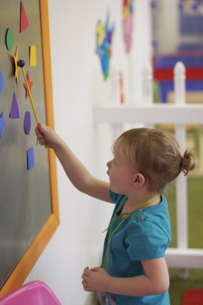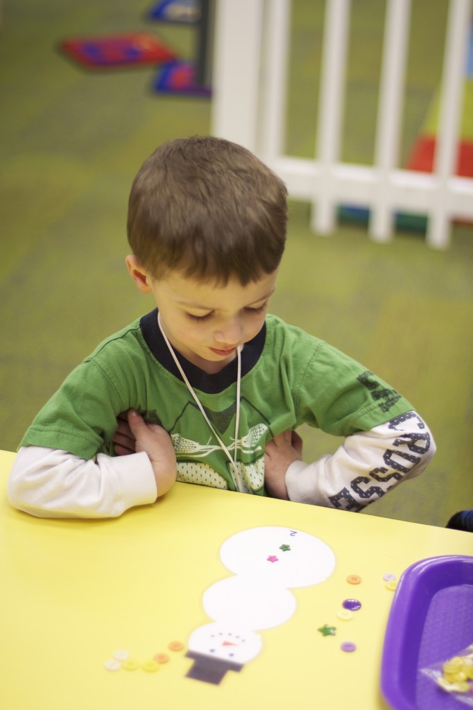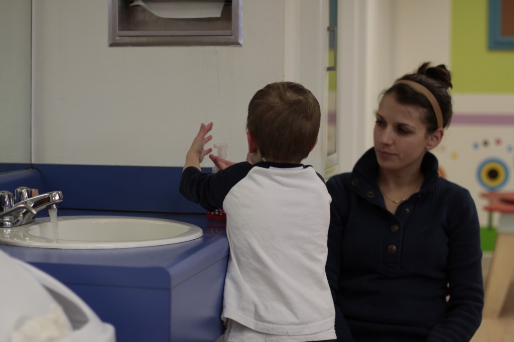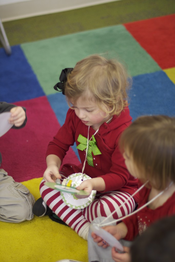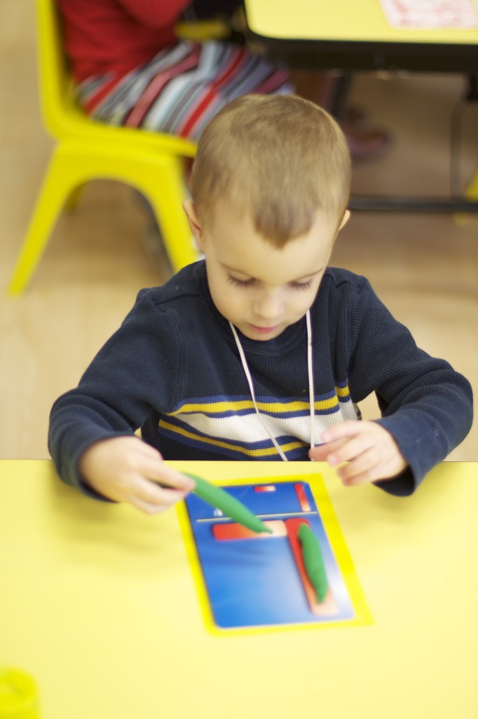 Today we started two new things! 🙂 During whole group time, I introduced the class to the clip system –which is used in the preschool room– for choosing a center. The children are to choose a center, take a clip off of the sign, clip it onto their shirt/dress, and play at that center. When they are finished, they clean up their mess, remove their clip, place it back on the sign, then choose a different center with clips available. This keeps the room calm, and the popular centers are not overcrowded. After I talked about how the system worked, I had the children, who are in the preschool room in the morning, demonstrate how to put on the clip and remove it when they are finished. The preschool children are now my official “teacher’s helpers” –whether it’s helping the younger children with clips or reminding them to use/take off their clips.