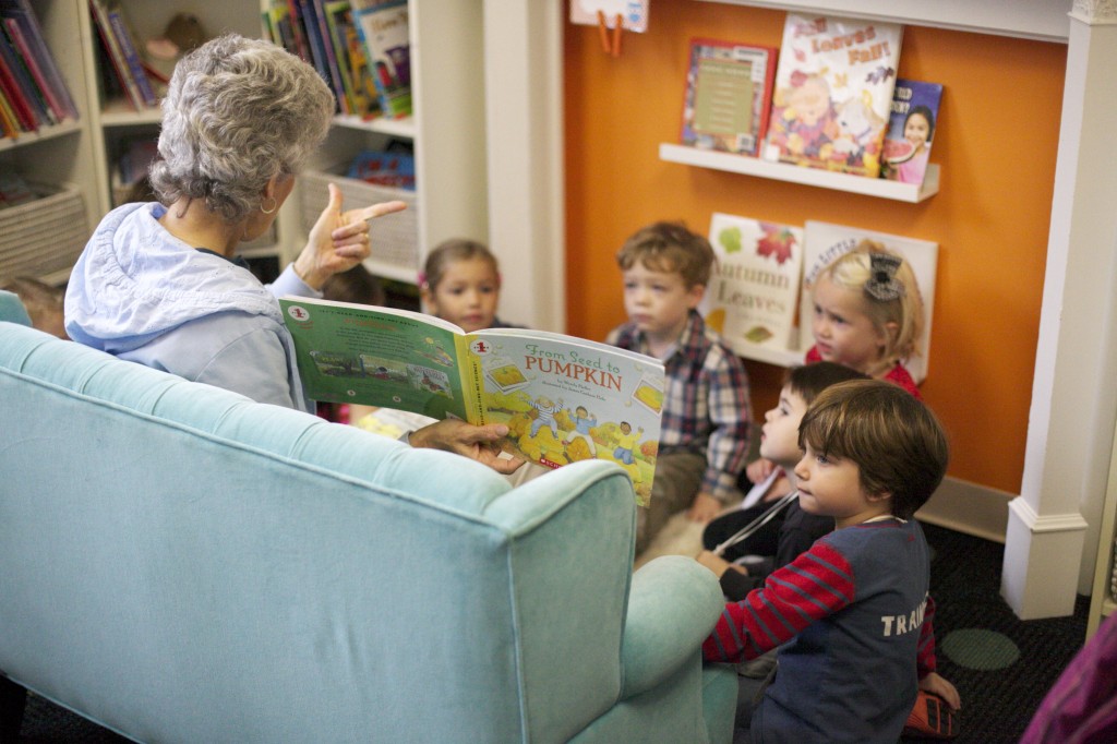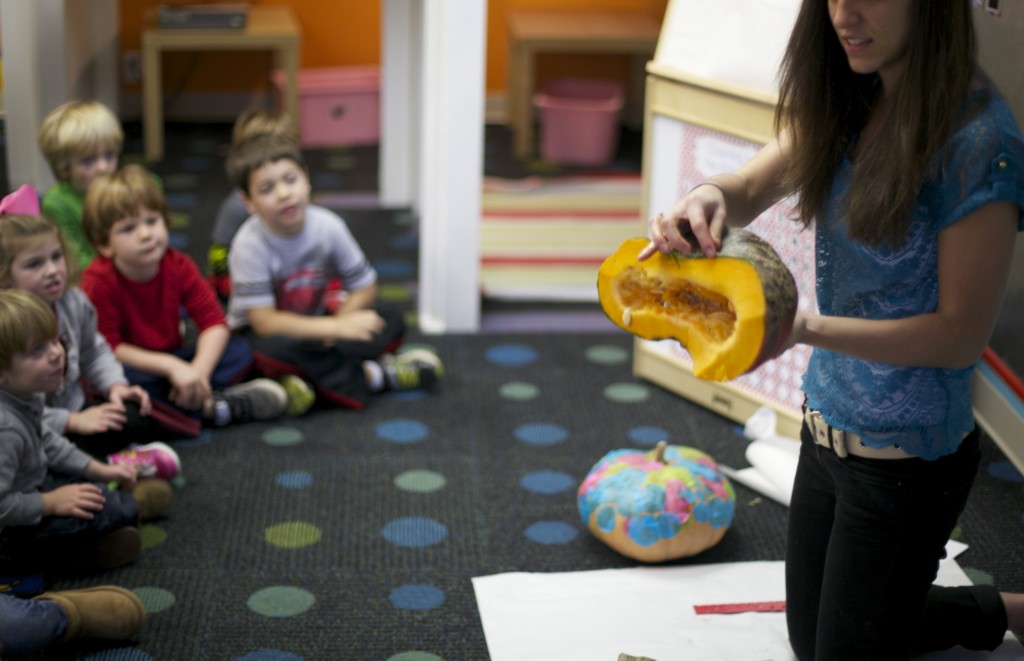We read “From Seed to Pumpkin”, which teaches the children more about how a pumpkin is formed, the steps it takes to become a ripe pumpkin, how the plant makes its own food, and what the pumpkin needs to grow (air, water, sun, etc.).