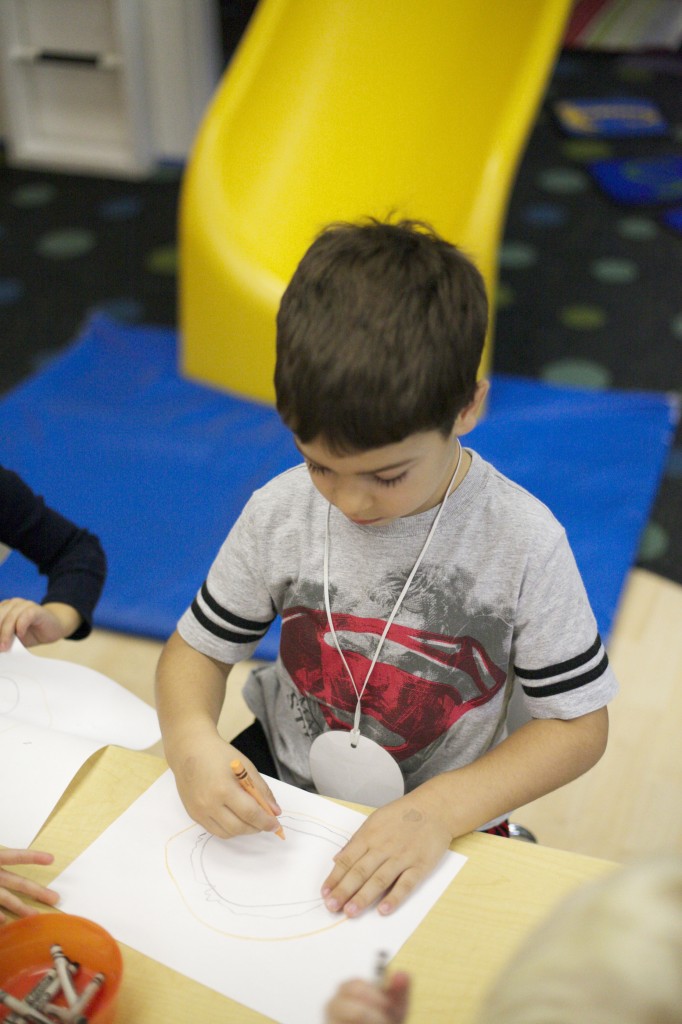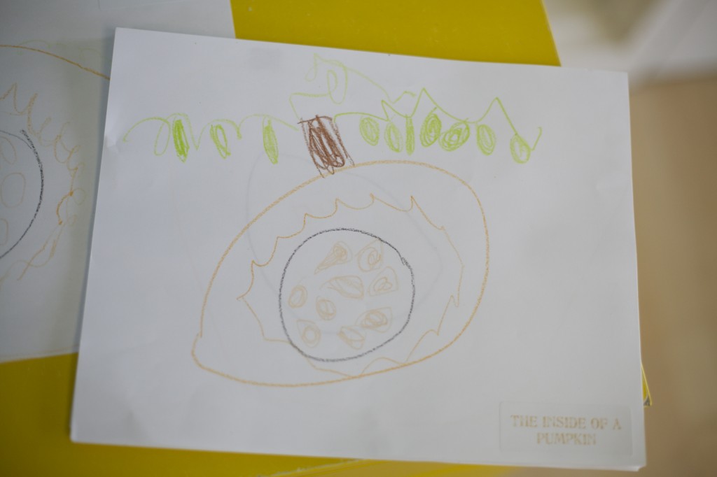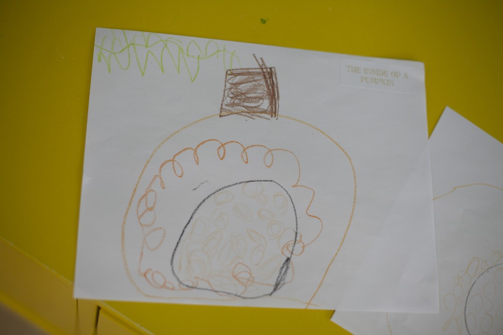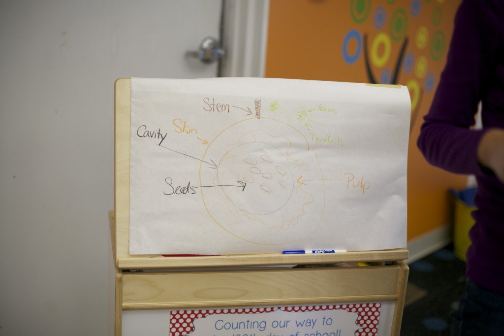 We took the diagram drawn during our group time and made our own diagram. With each step, we talked about the various parts and how a pumpkin looks when we cut it in half.