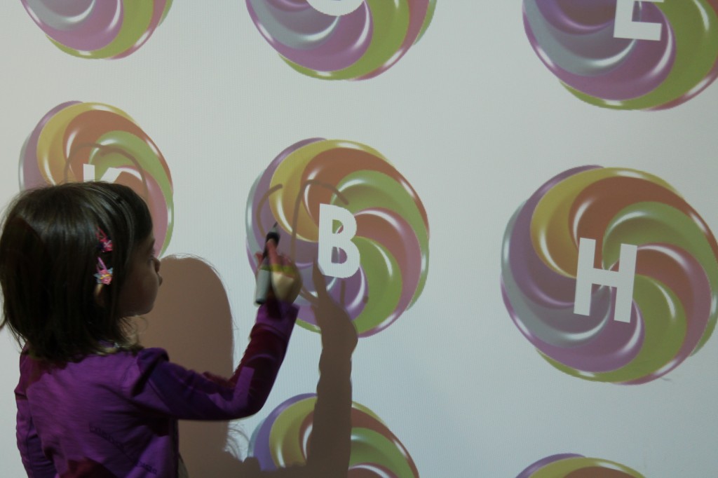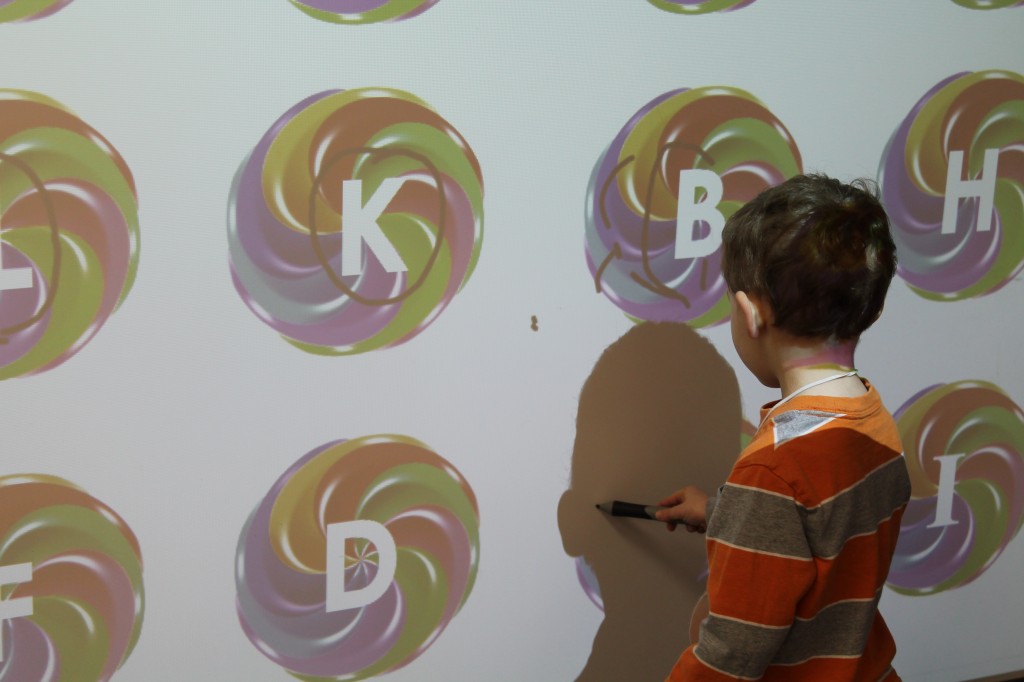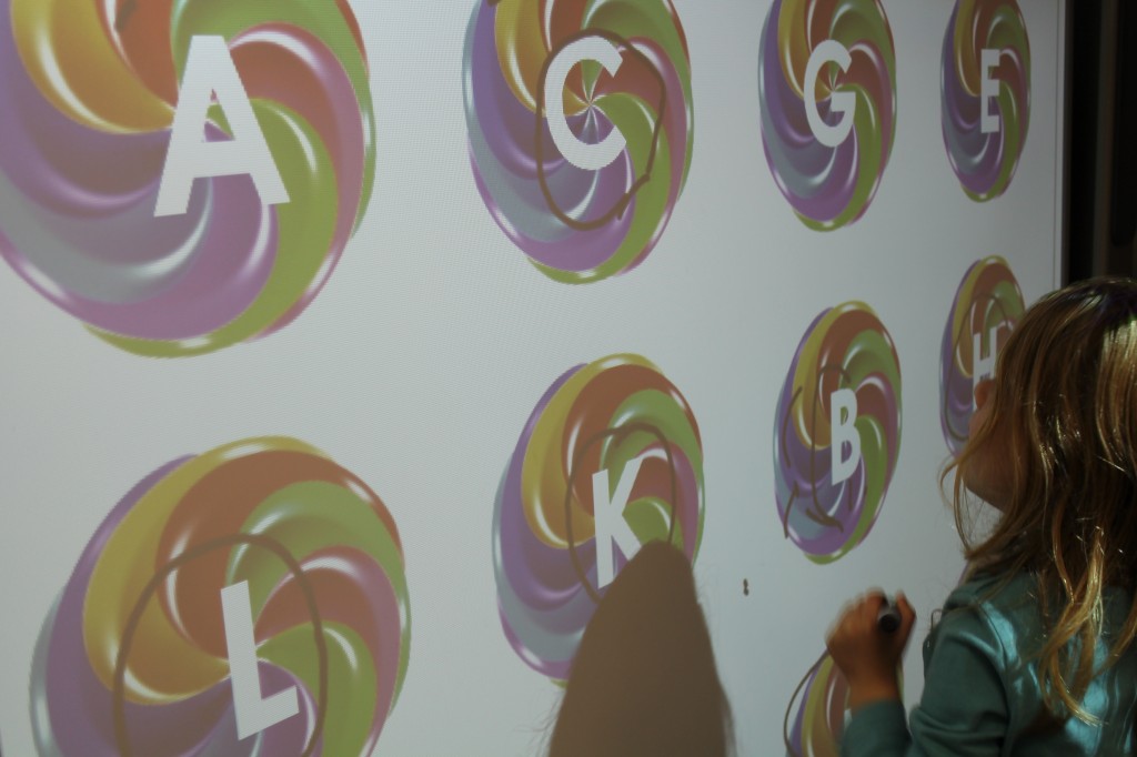 Today we practiced our letter sounds while strengthening our wrist muscles and hand-eye coordination. Writing on vertical surfaces is very important in handwriting development. Training the muscles to work in different ways is great repetition for preschoolers. We identified and circled letter sounds on the smartboard today.