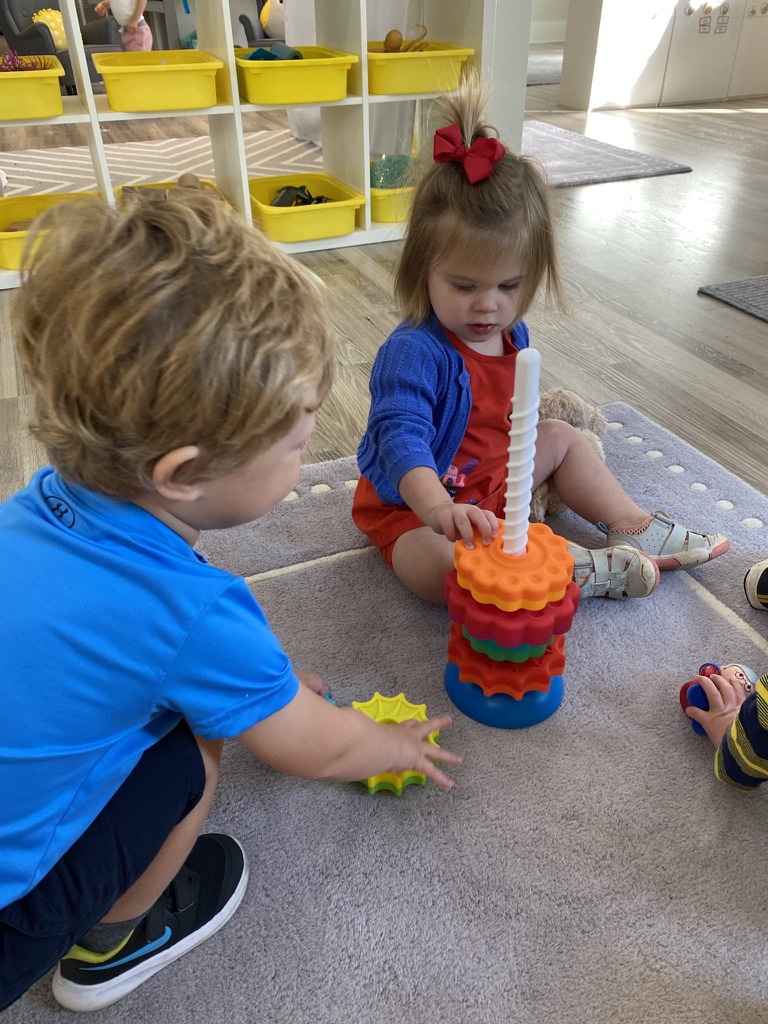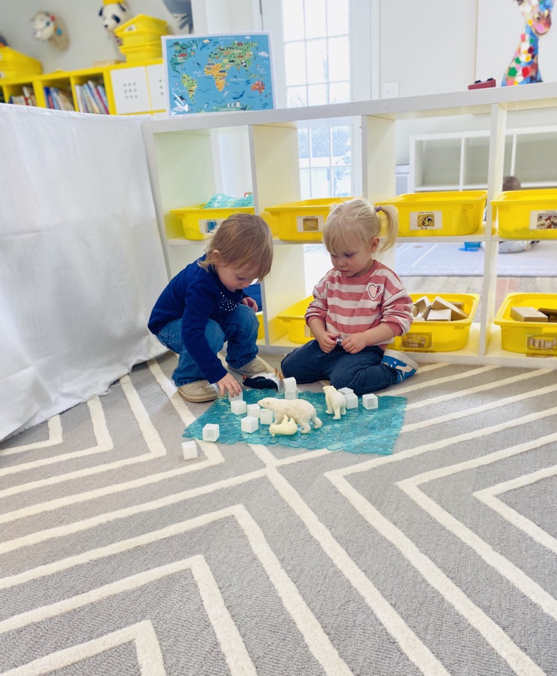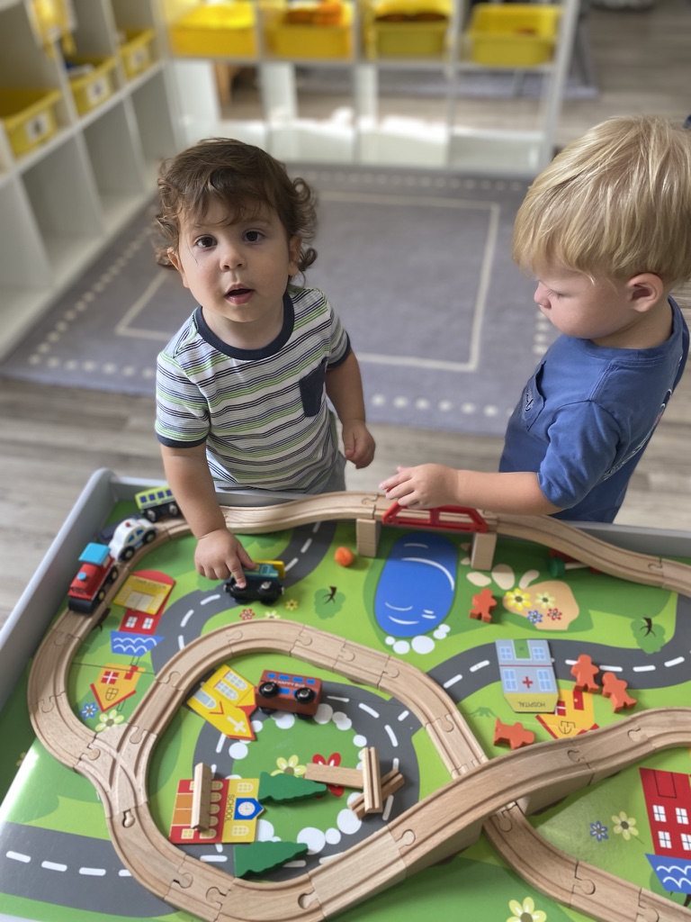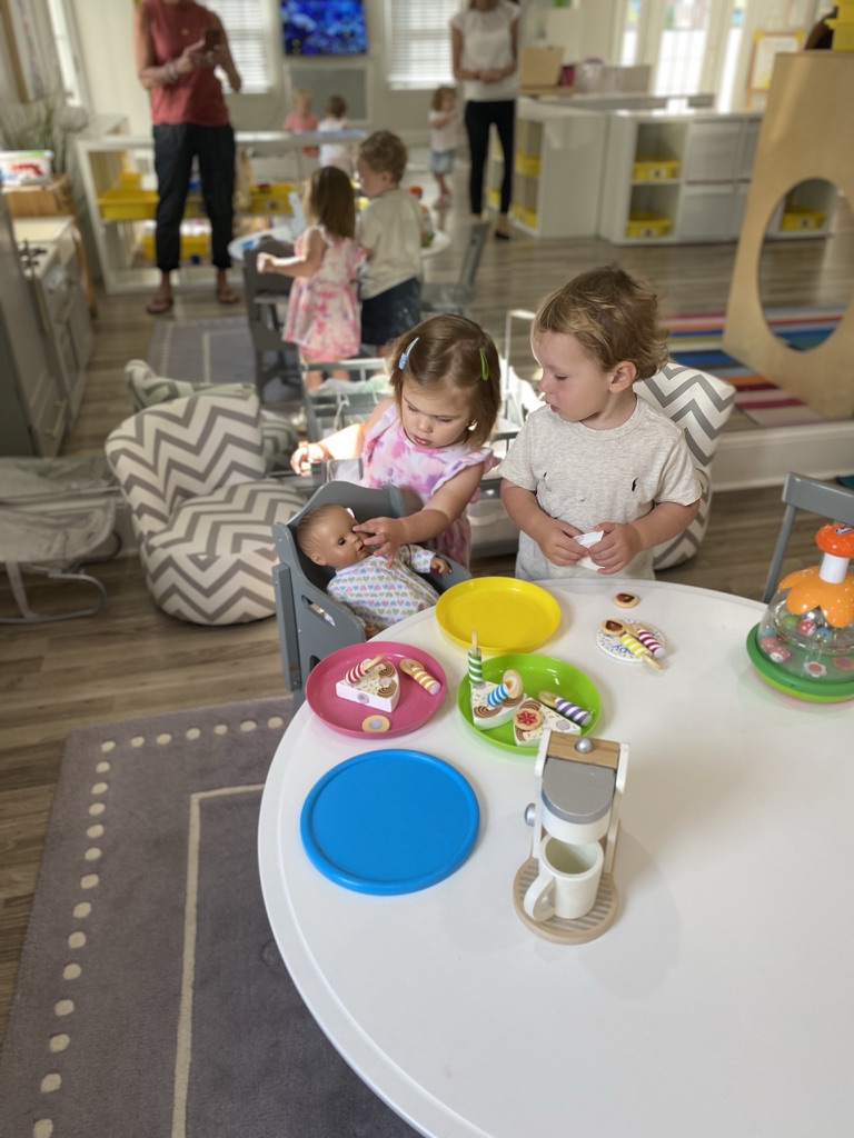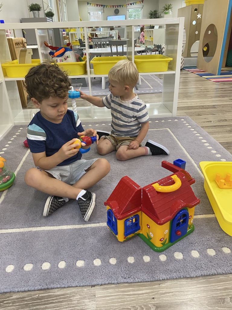 The studio toddler class has taken the month of September to explore our environment, learn routines, and adjust to being away from parents for the first time but it is also a time of socialization and making new friends.  Socializing with other children  is an excellent way to foster a toddler’s social and emotional development.  We set up our environment for purposeful play and social experiences.  Children begin to mimic during parallel play and then start to communicate with peers. They learn vocabulary and appropriate ways to express themselves through pretend play, free choice centers, and games.  As teachers, we facilitate the environment and activities and then gently guide the toddlers to use words, solve problems, take turns, and have fun through play.  The result is a classroom full of new friends!