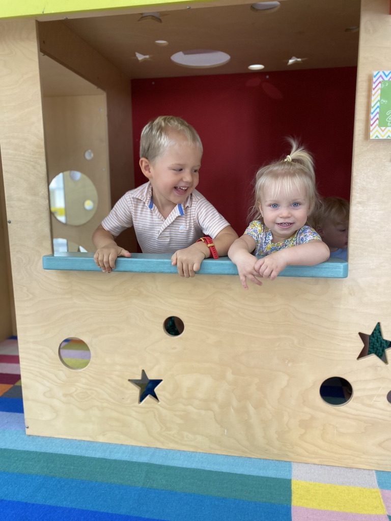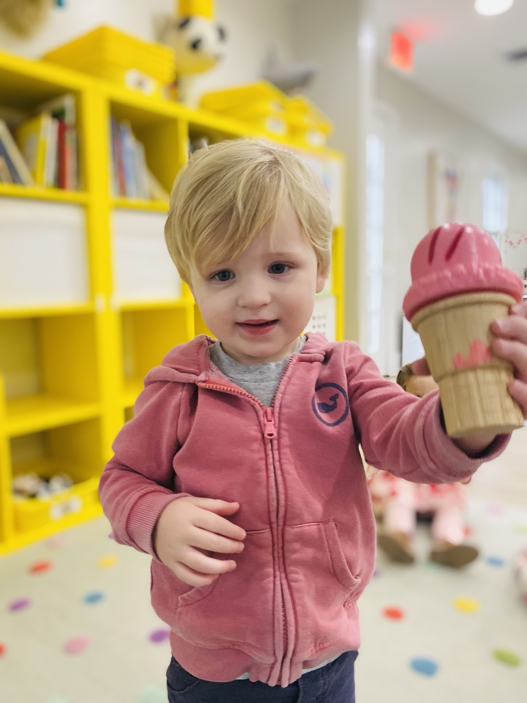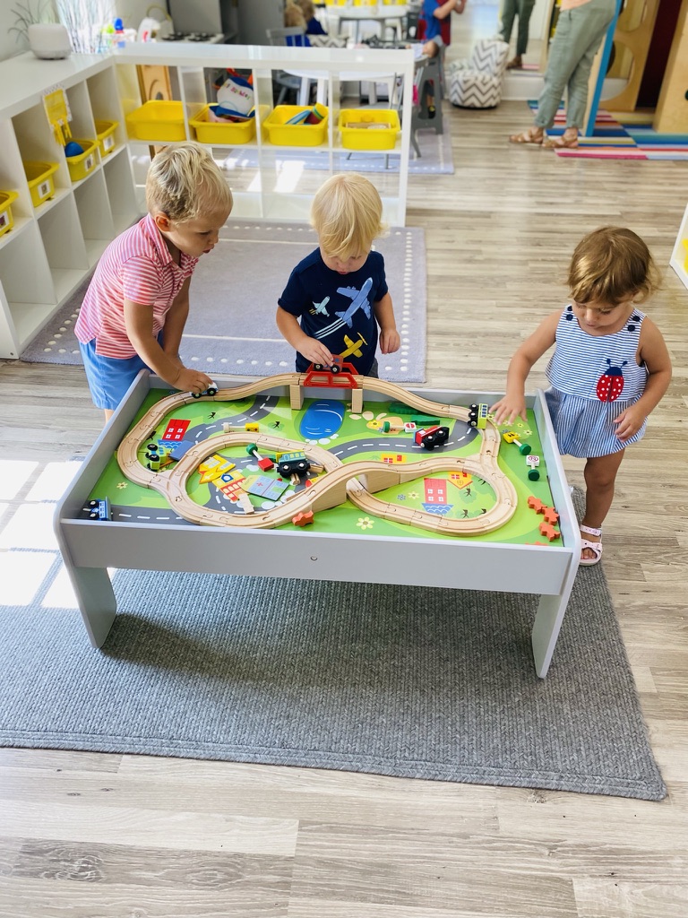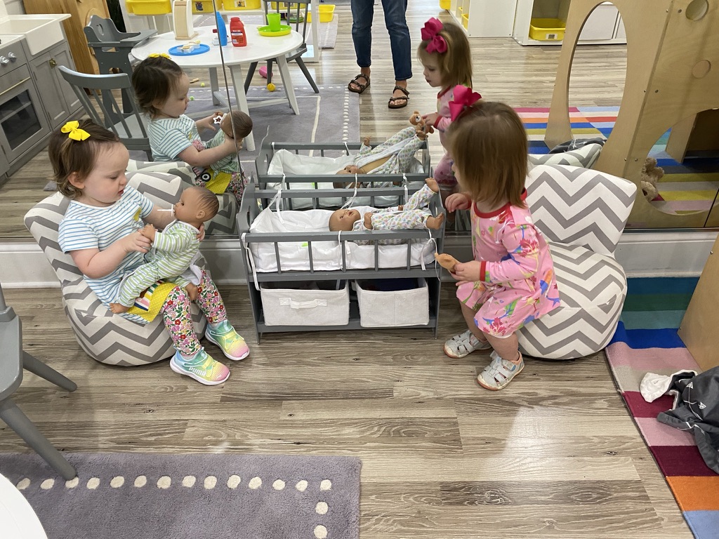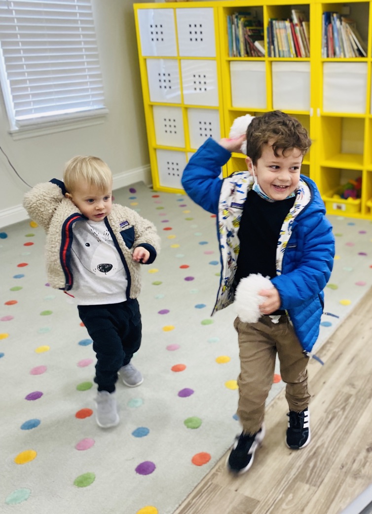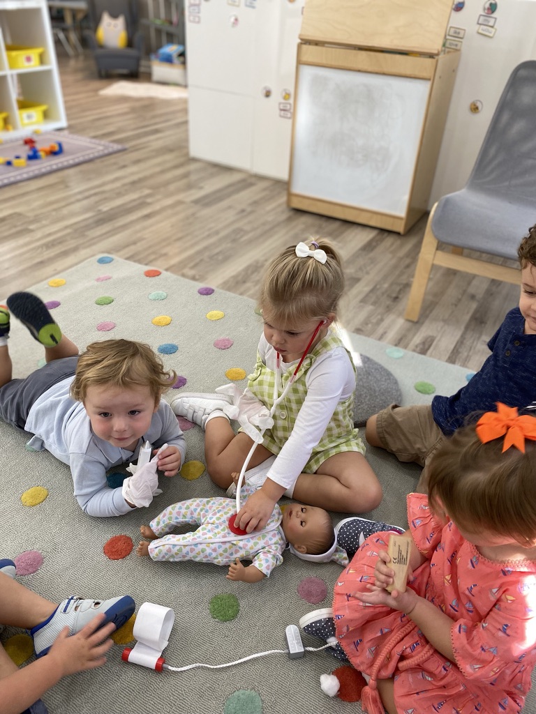 The studio toddler class has taken the month of September to explore our environment, learn routines, and adjust to being away from parents for the first time but it is also a time of socialization and making new friends.  Socializing with other children  is an excellent way to foster a toddler’s social and emotional development.  We set up our environment for purposeful play and social experiences.  Children begin to mimic during parallel play and then start to communicate with peers. They learn vocabulary and appropriate ways to express themselves through pretend play, free choice centers, and games.  As teachers, we facilitate the environment and activities and then gently guide the toddlers to use words, solve problems, take turns, and have fun through play.  The result is a classroom full of new friends!