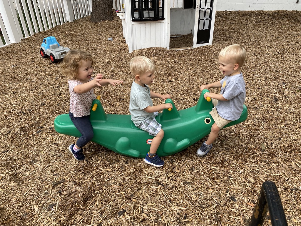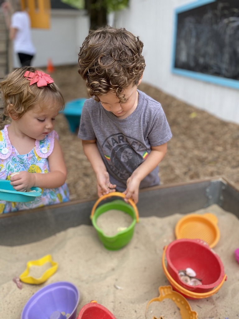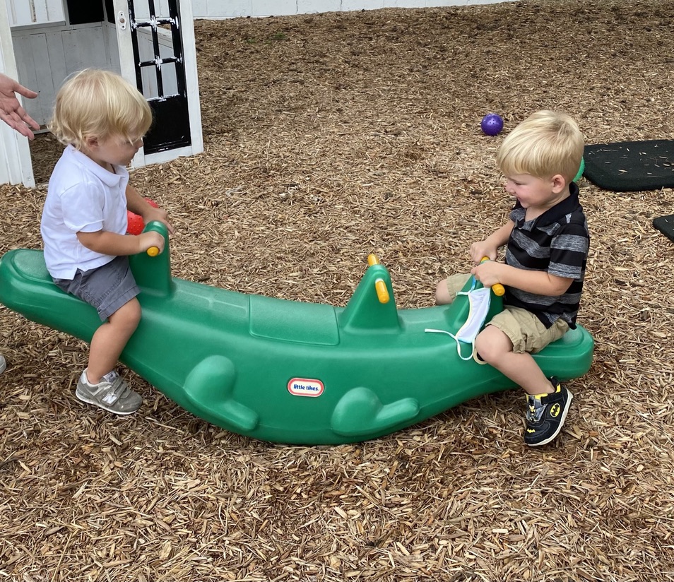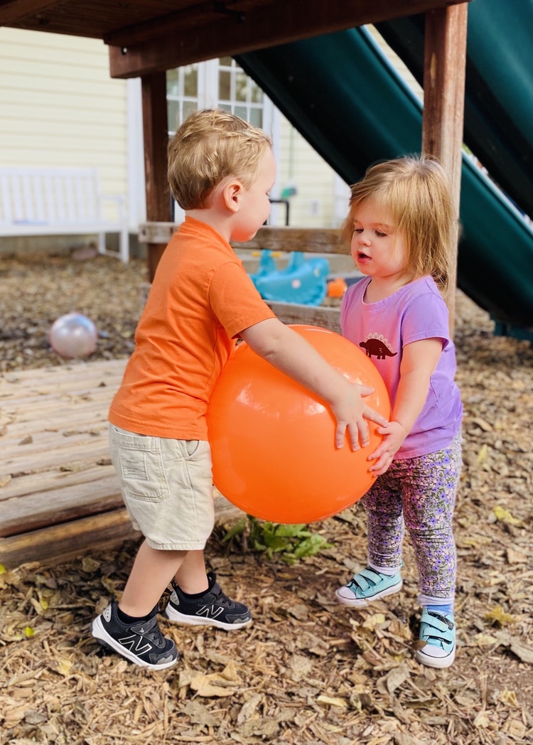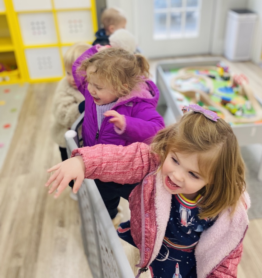 The studio toddler class has taken the month of September to explore our environment, learn routines, and adjust to being away from parents for the first time but it is also a time of socialization and making new friends.  Socializing with other children  is an excellent way to foster a toddler’s social and emotional development.  We set up our environment for purposeful play and social experiences.  Children begin to mimic during parallel play and then start to communicate with peers. They learn vocabulary and appropriate ways to express themselves through pretend play, free choice centers, and games.  As teachers, we facilitate the environment and activities and then gently guide the toddlers to use words, solve problems, take turns, and have fun through play.  The result is a classroom full of new friends!