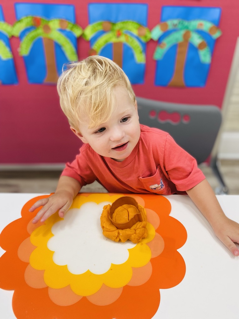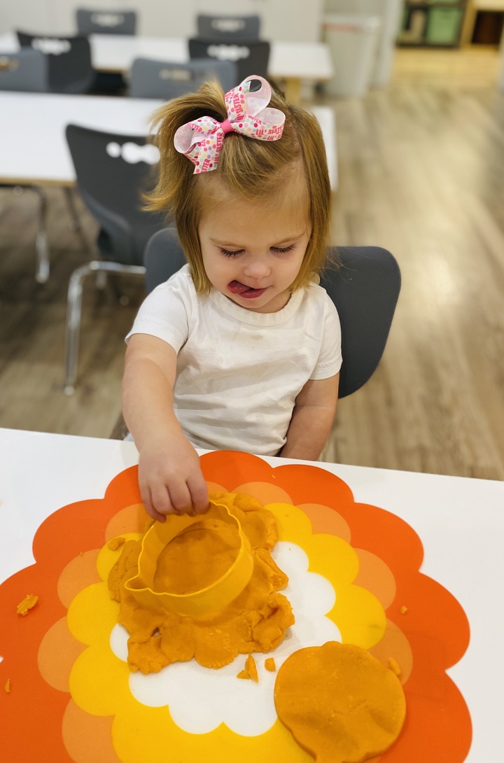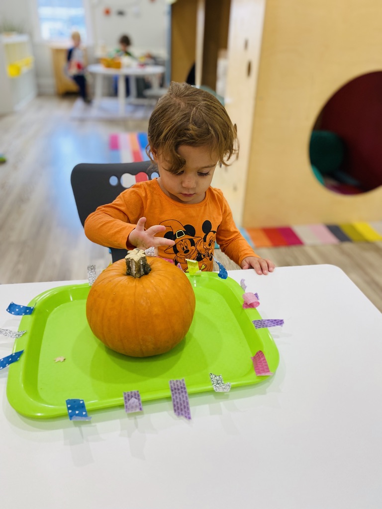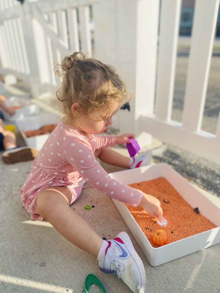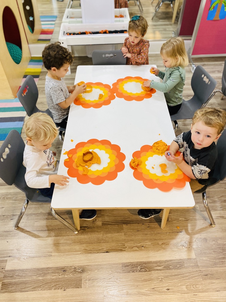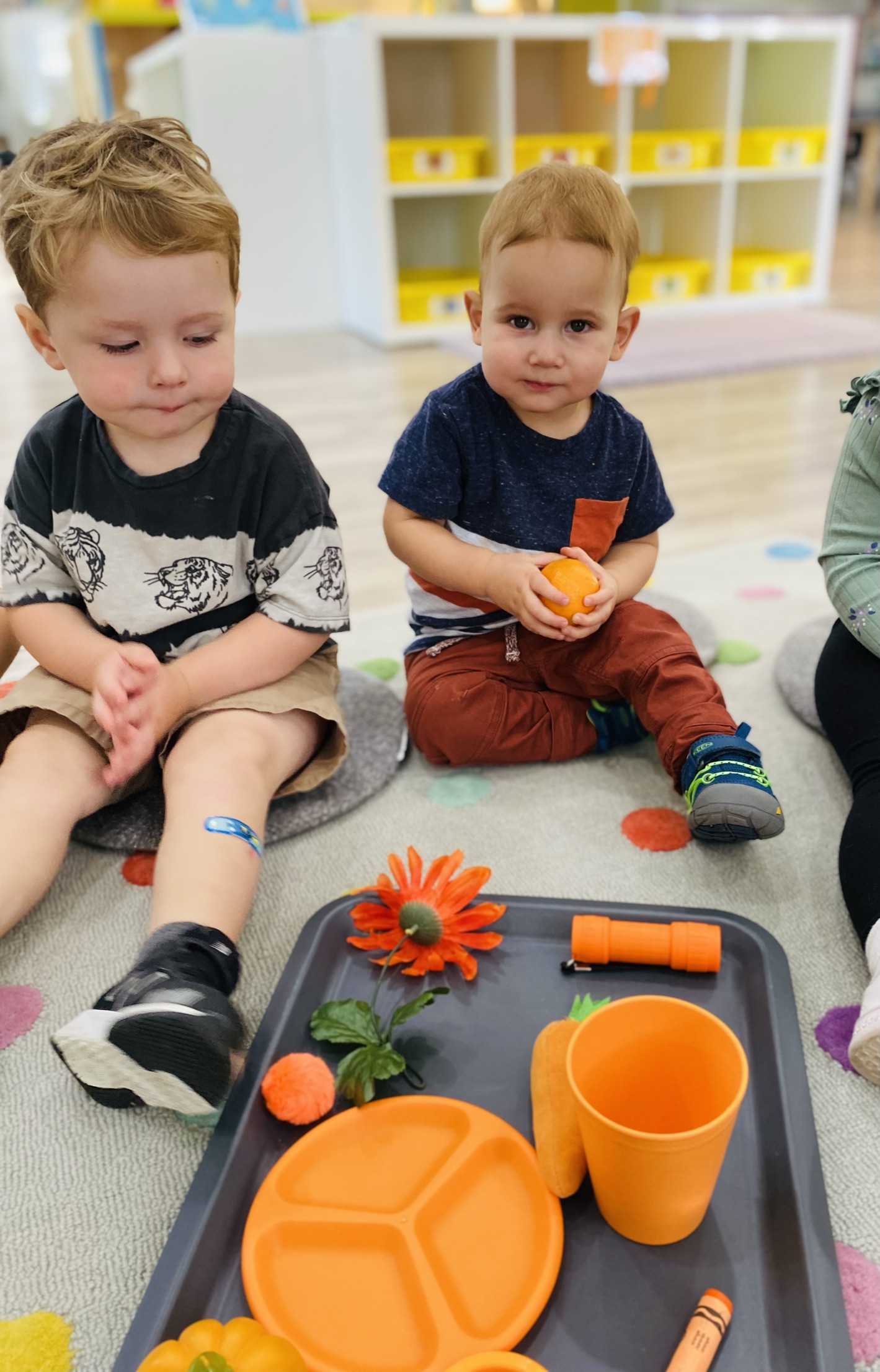 Orange is the focus color for the month of October!  So many fun purposeful play experiences to immerse the toddlers in all things orange.  Pumpkins, paint, playdough, discovery bins, fine motor skills, large motor skills, new vocabulary, songs, games, and more have kept our class busy learning through play.