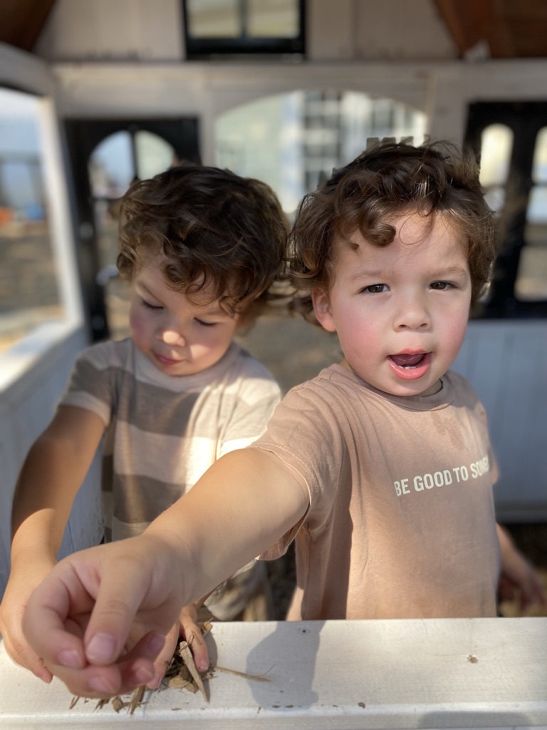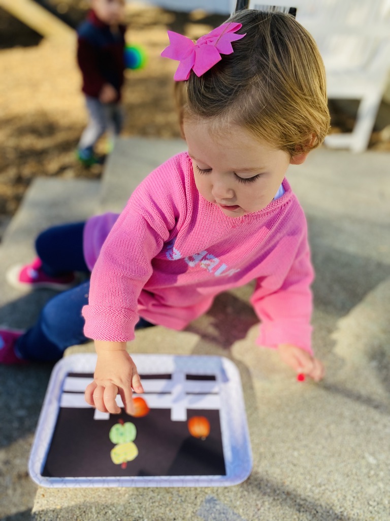 The toddlers are enjoying a fabulous fall full of squirrel songs, apple sorting /peeling, rectangle scarecrows, and name building with fall leaves.   Our centers this month are designed to give the toddlers the opportunity to explore farm animals, farm books, farm puzzles, new textures in the sensory bin,  and “cooking apple pie” in the dramatic play center.  We have milked a “cow”, sorted leaves, and continue to enjoy the season through purposeful play.