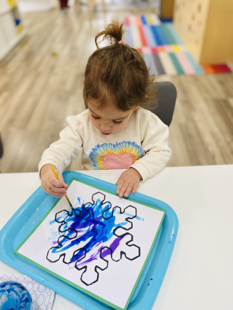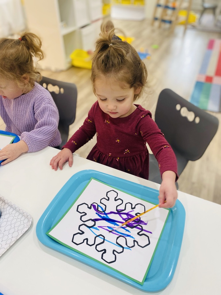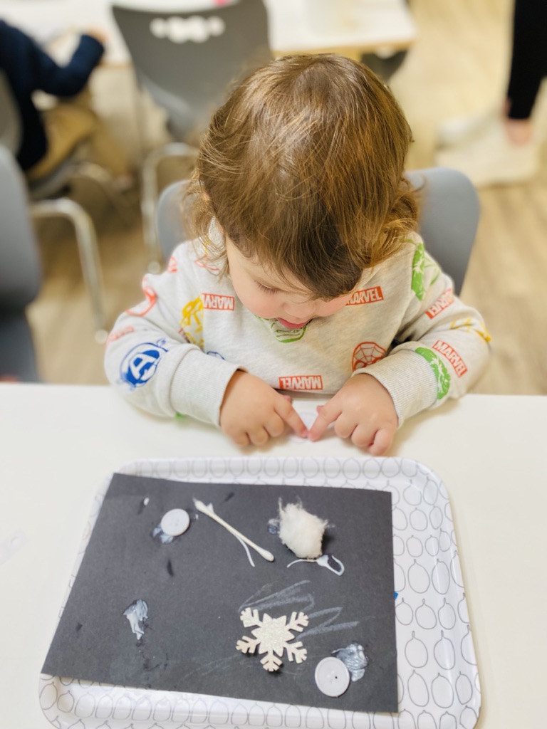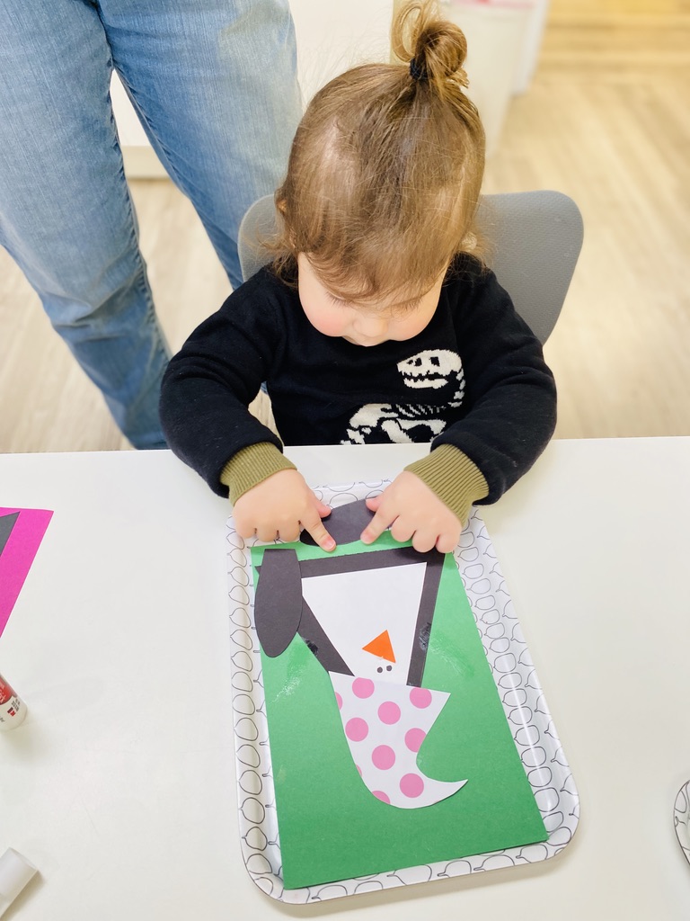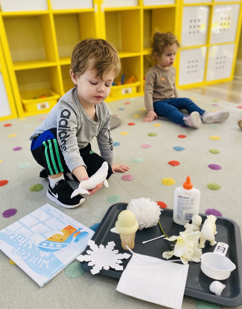 Happy New Year from the studio toddler room!  The weather has kept us busy indoors this month but we have filled our days with crafts, discovery bins, winter centers, stories, dancing, and learning through play.  Our color focus is white and our shape is the triangle so we incorporated these focus targets into most of our centers, small groups, whole group and purposeful play.