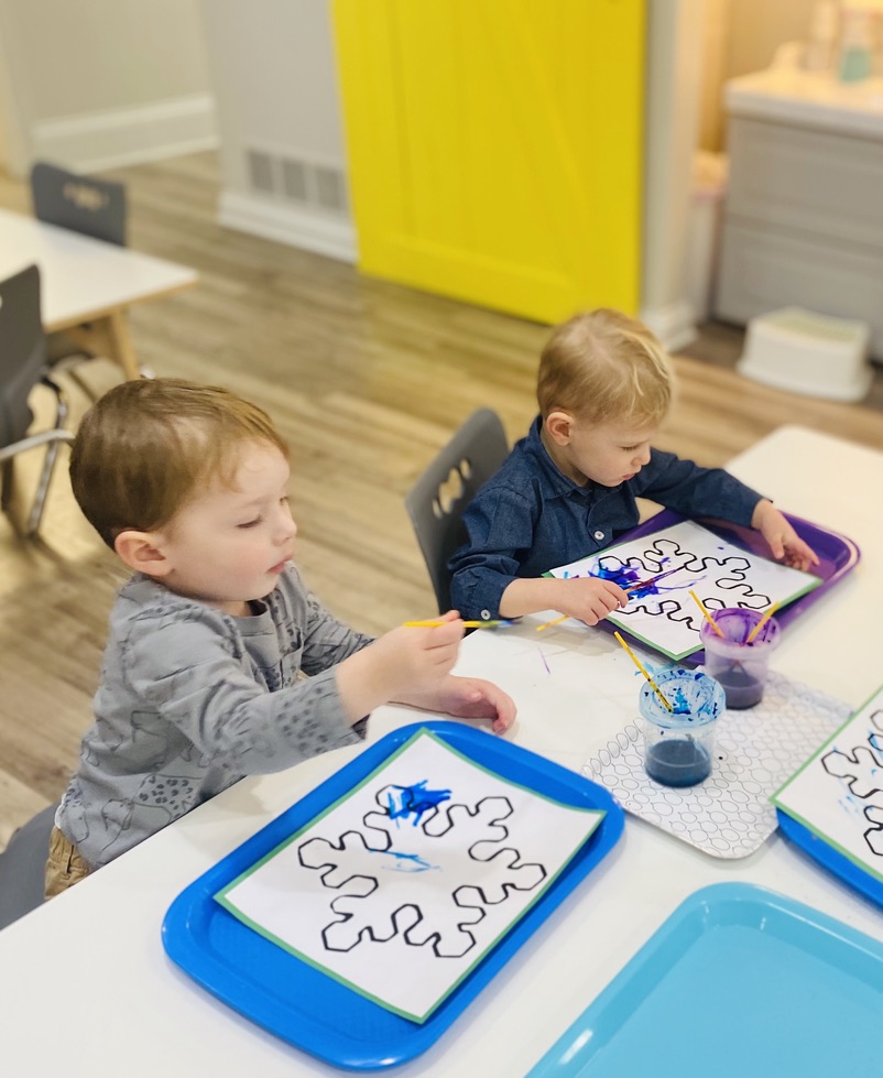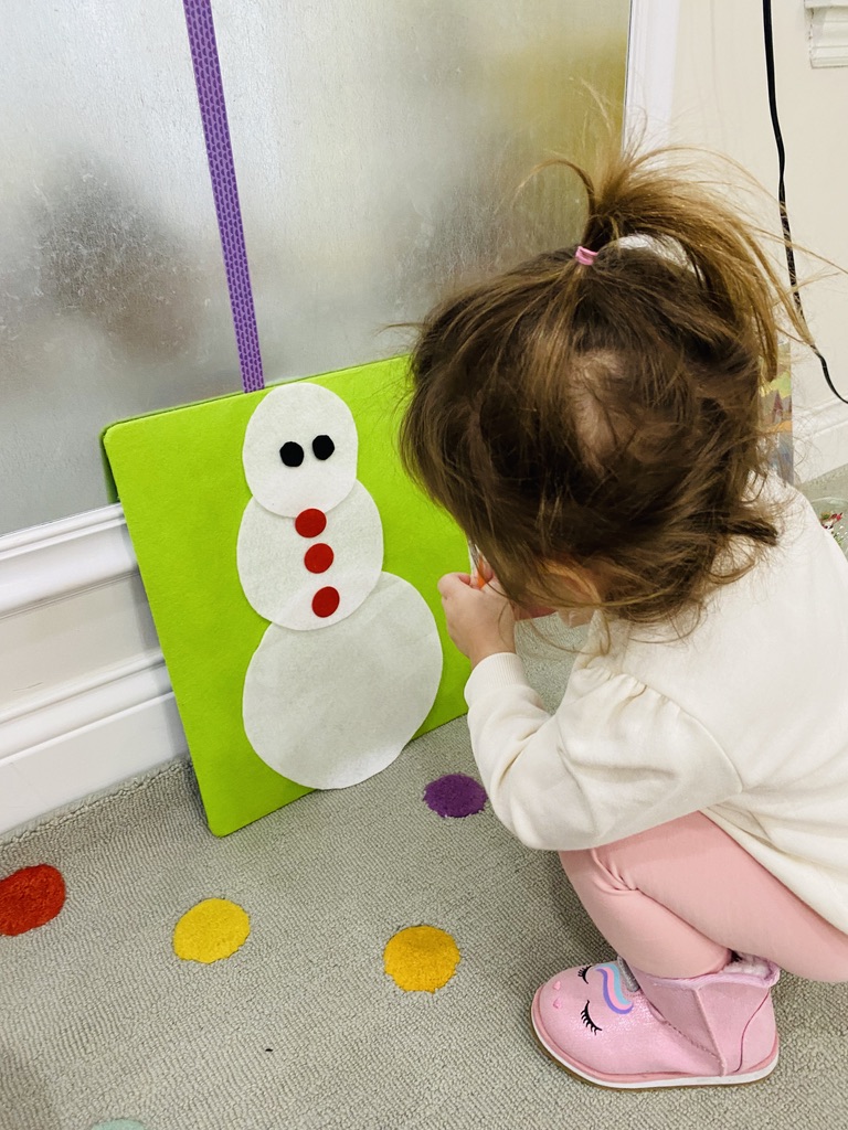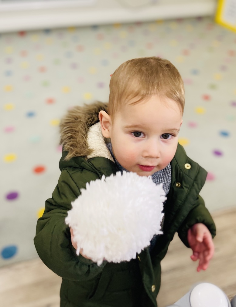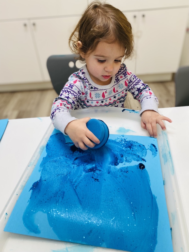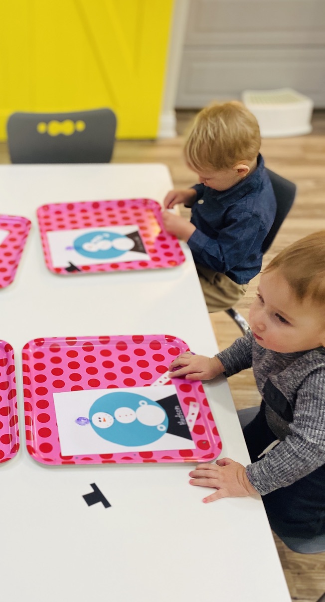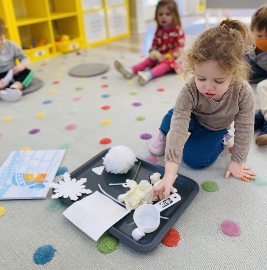 Happy New Year from the studio toddler room!  The weather has kept us busy indoors this month but we have filled our days with crafts, discovery bins, winter centers, stories, dancing, and learning through play.  Our color focus is white and our shape is the triangle so we incorporated these focus targets into most of our centers, small groups, whole group and purposeful play.