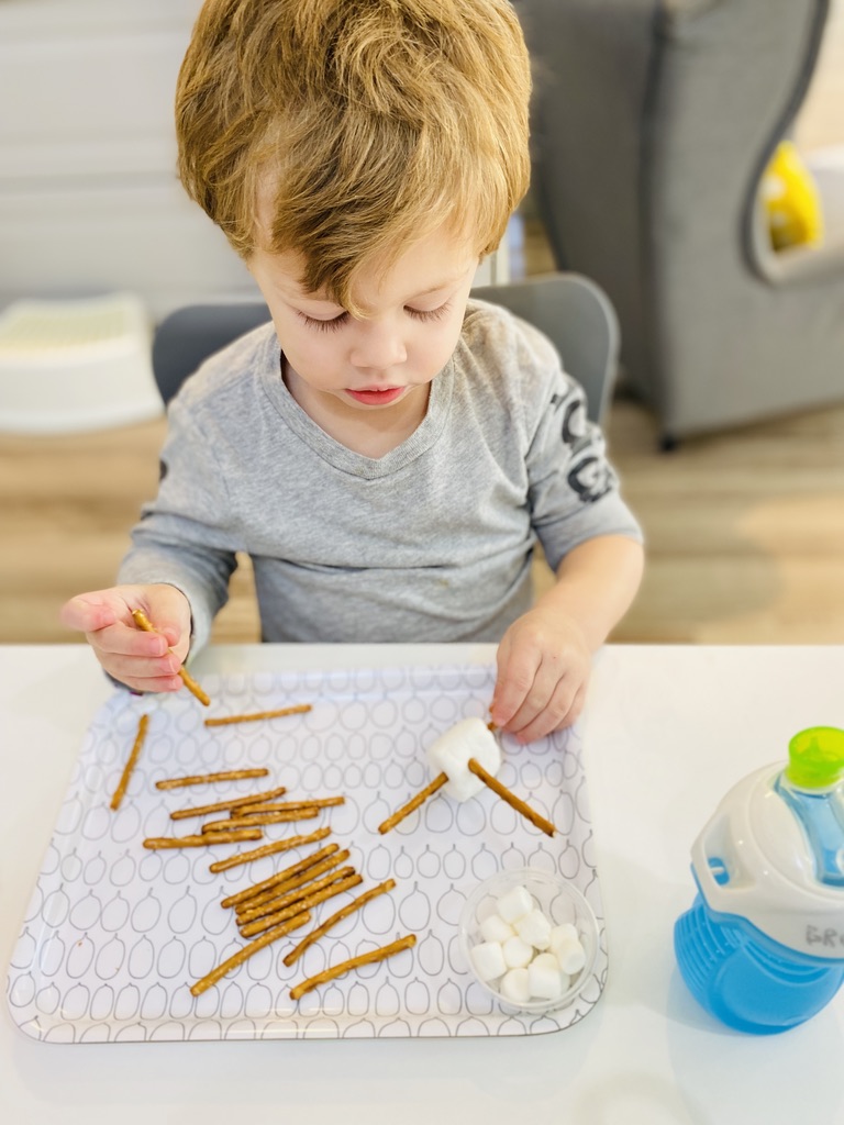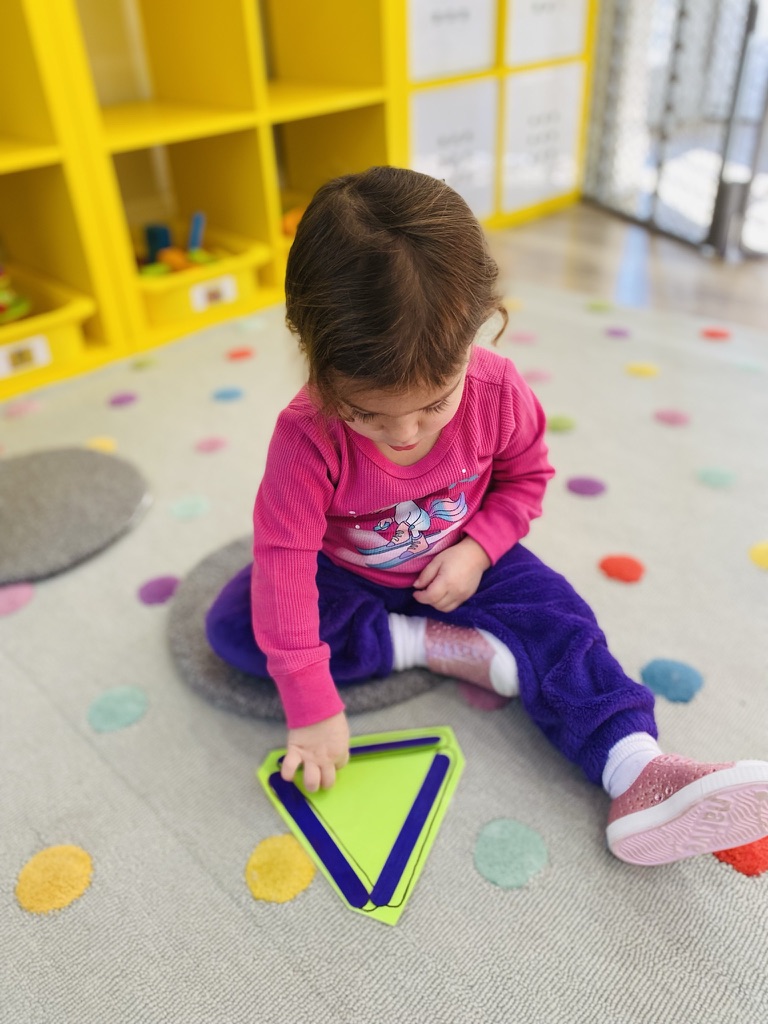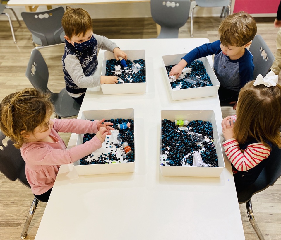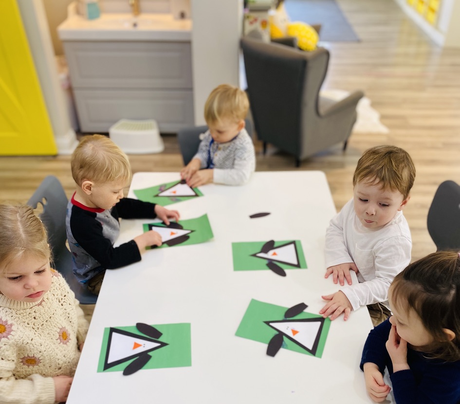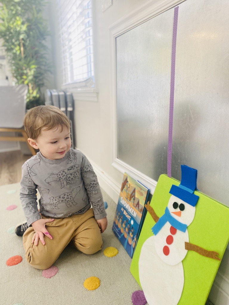 Happy New Year from the studio toddler room!  The weather has kept us busy indoors this month but we have filled our days with crafts, discovery bins, winter centers, stories, dancing, and learning through play.  Our color focus is white and our shape is the triangle so we incorporated these focus targets into most of our centers, small groups, whole group and purposeful play.