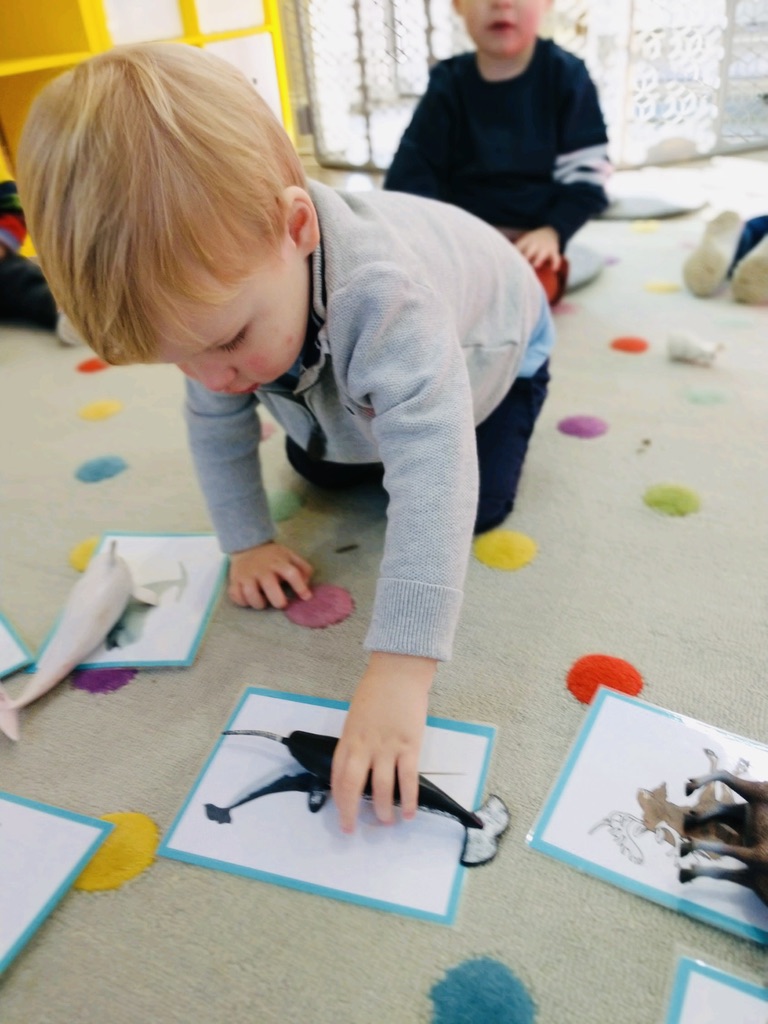 Our little learners reviewed all of the shapes they’ve learned throughout the year with some hands on shape activities. One was finding the bug hiding under the shapes. They had to pick the shape I asked them to find and see if the bug was hiding underneath it! They also matched shapes to the underwater animal puzzles. We finished off with a shape collage. We glued each shape one by one as a group.