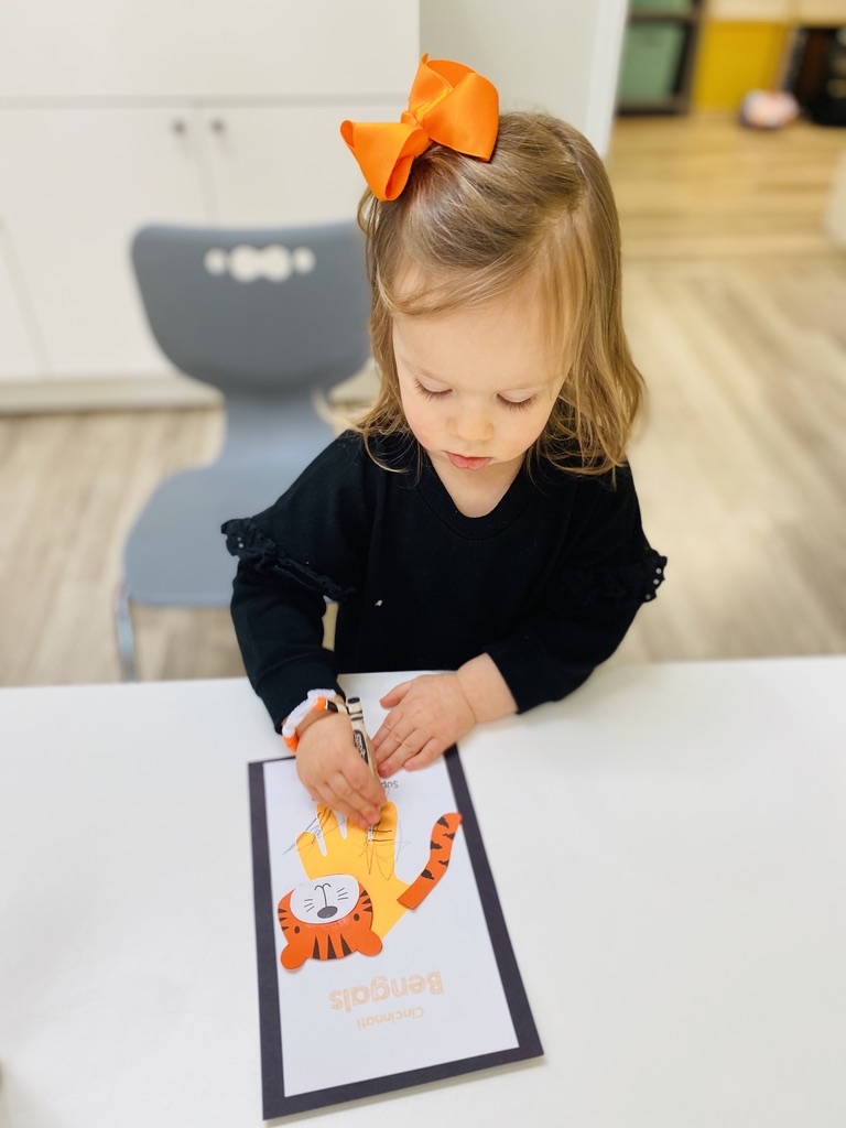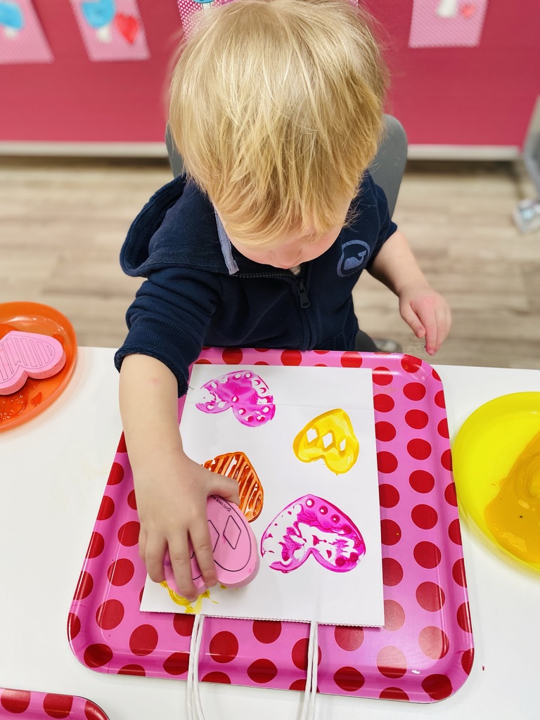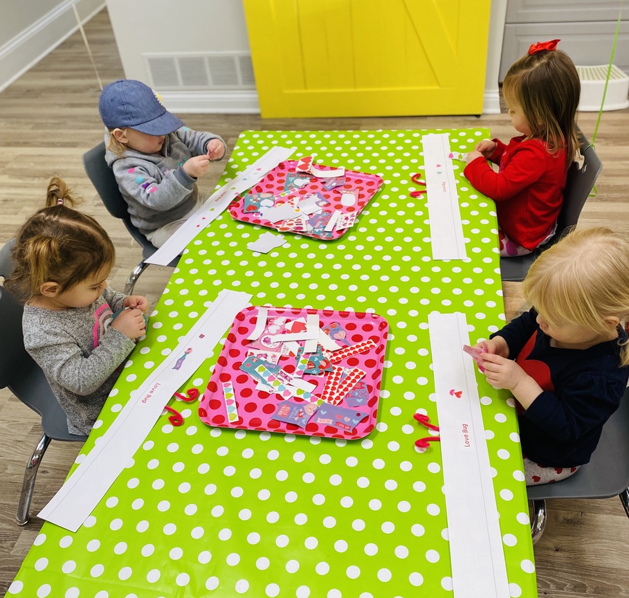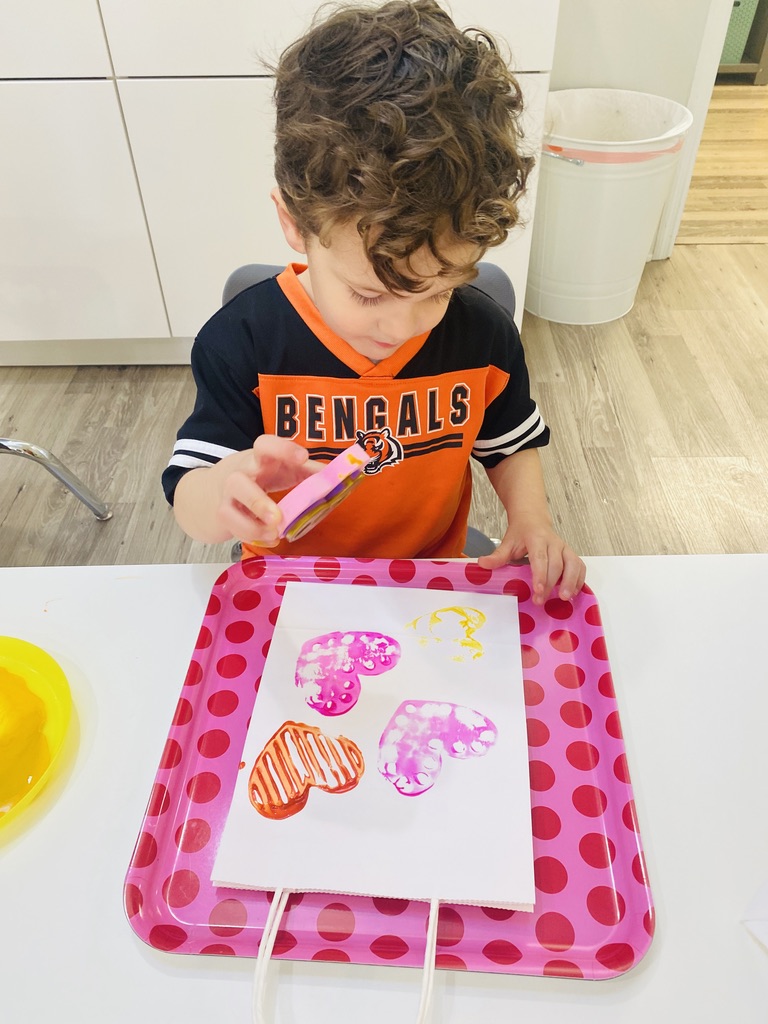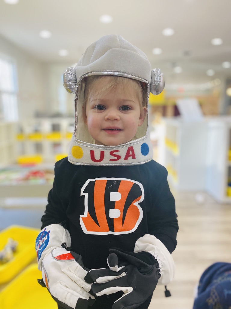 The studio toddlers had a fantastic February.  We focused on the color pink and heart shape in honor of Valentine’s Day.  Pink hearts were repeated during games, finger plays, crafts, sensory bins, songs, stories, and more.  The toddlers practiced fine motor skills making love bug hats, lacing hearts, and  painting bags during our Valentine’s Day party.  We also incorporated purposeful play throughout our study of space.  The toddlers loved dressing up as astronauts, blasting off rockets, an astronaut obstacle course, stamping letters to spell their names on rockets, puzzles, books and scooping in our space sensory bins. The Bengals heading to the Super Bowl was all the rage in Cincinnati so we had a class pep rally learning about Bengal tigers and creating a keepsake craft.  A fun February for all!