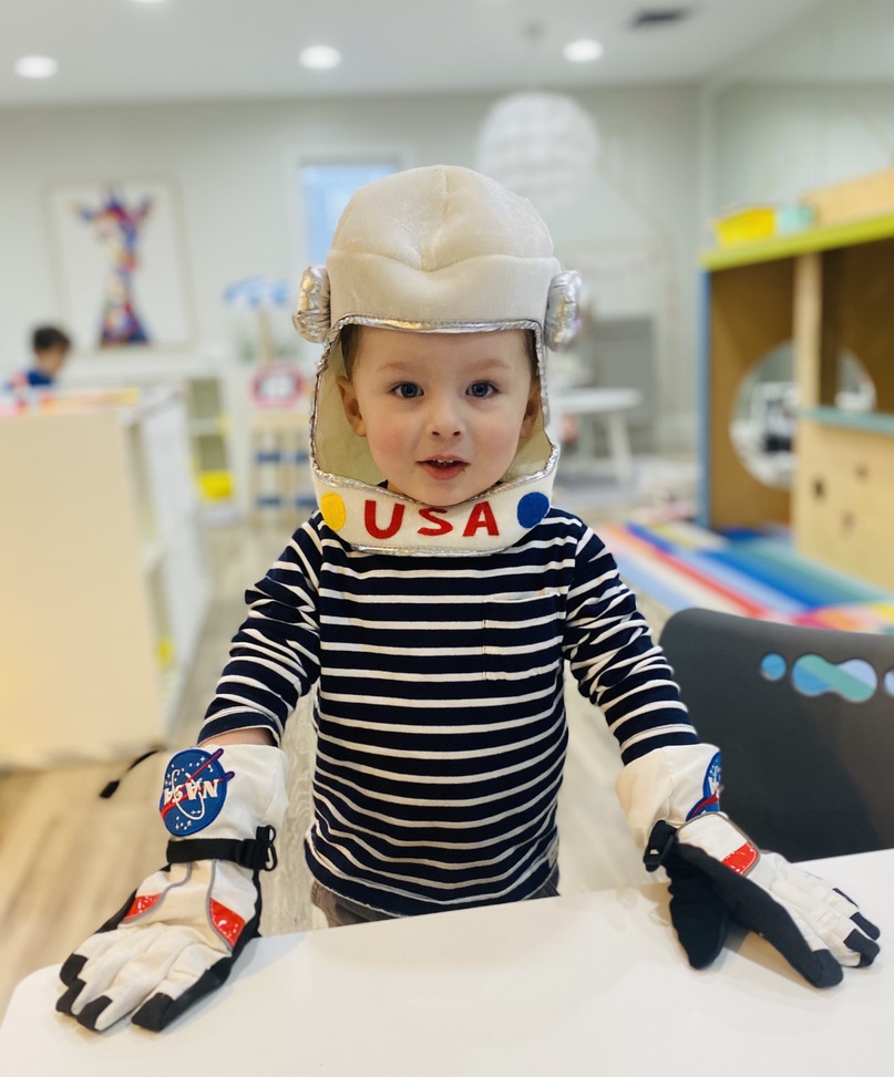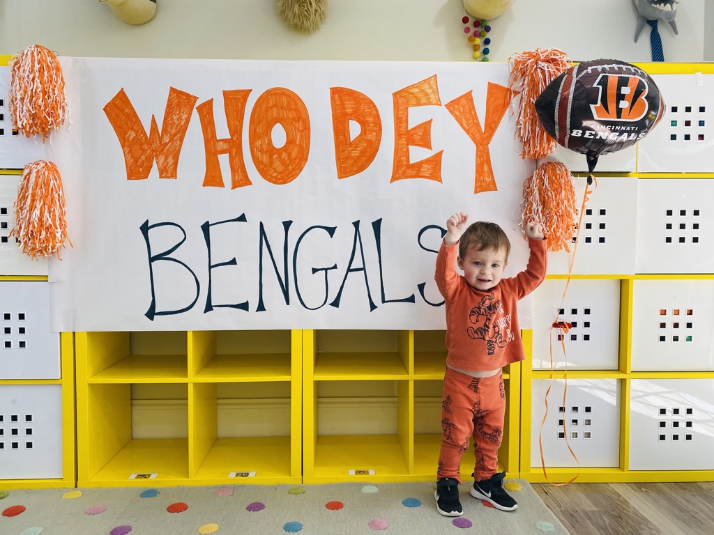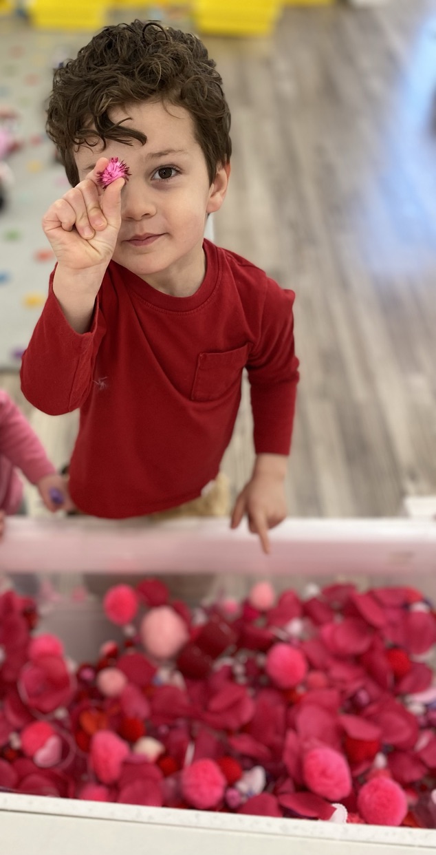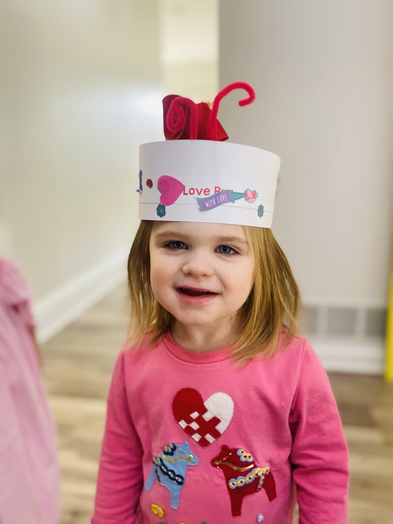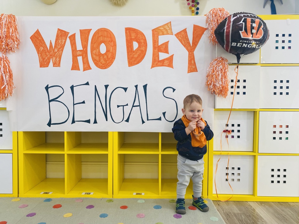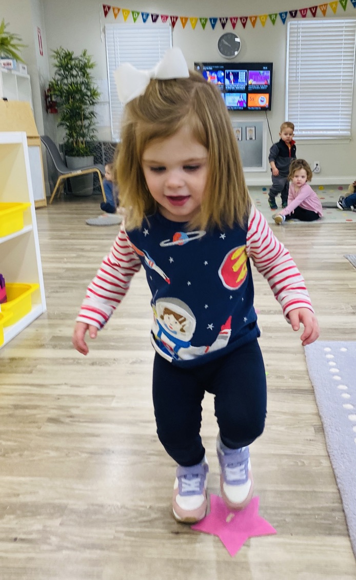 The studio toddlers had a fantastic February.  We focused on the color pink and heart shape in honor of Valentine’s Day.  Pink hearts were repeated during games, finger plays, crafts, sensory bins, songs, stories, and more.  The toddlers practiced fine motor skills making love bug hats, lacing hearts, and  painting bags during our Valentine’s Day party.  We also incorporated purposeful play throughout our study of space.  The toddlers loved dressing up as astronauts, blasting off rockets, an astronaut obstacle course, stamping letters to spell their names on rockets, puzzles, books and scooping in our space sensory bins. The Bengals heading to the Super Bowl was all the rage in Cincinnati so we had a class pep rally learning about Bengal tigers and creating a keepsake craft.  A fun February for all!