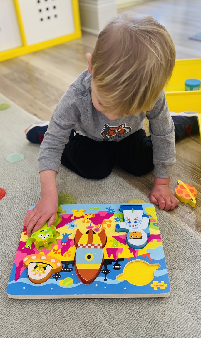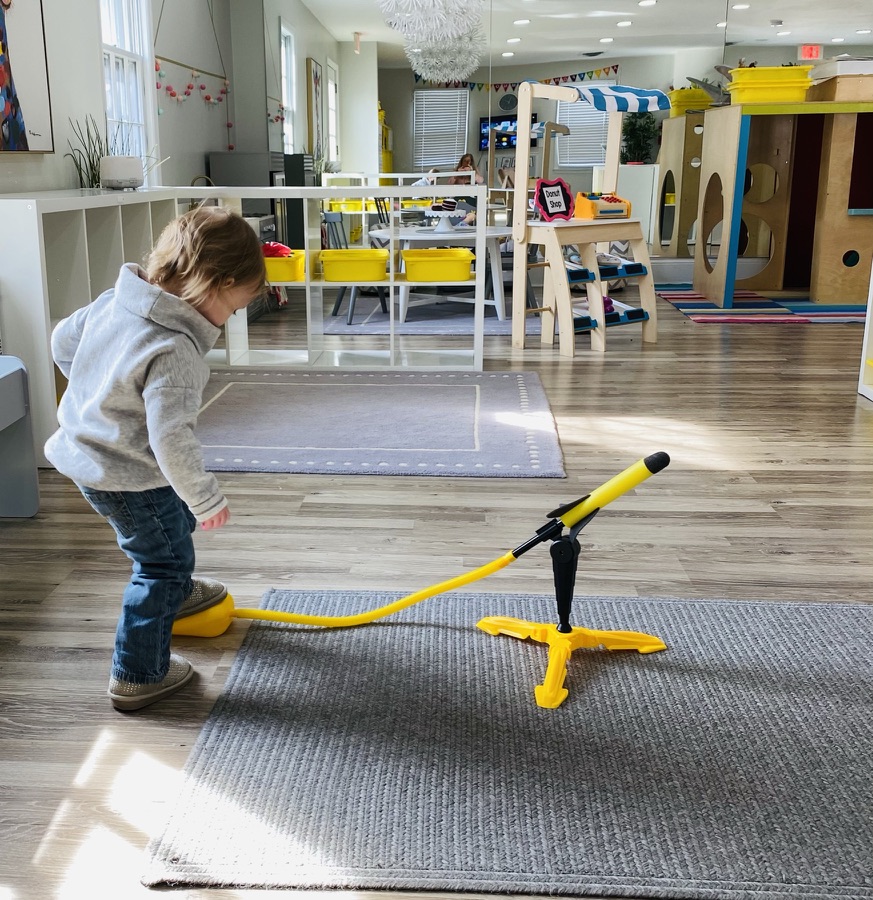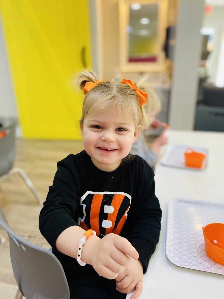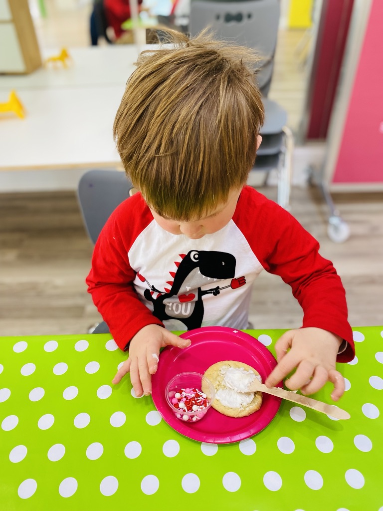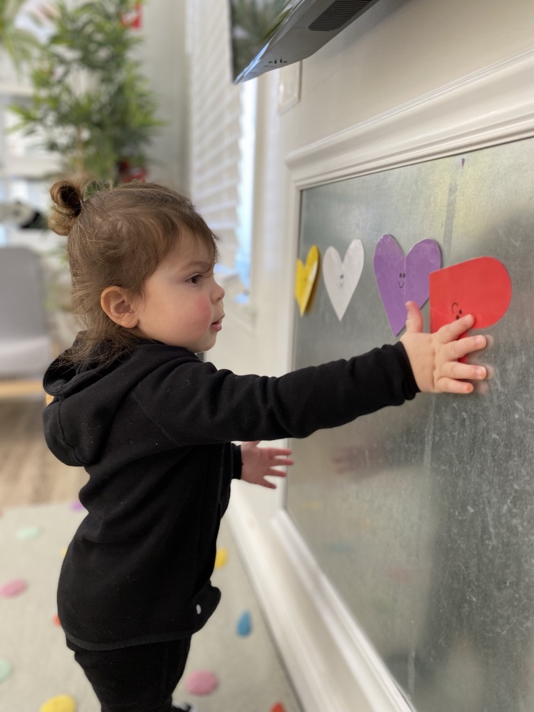 The studio toddlers had a fantastic February.  We focused on the color pink and heart shape in honor of Valentine’s Day.  Pink hearts were repeated during games, finger plays, crafts, sensory bins, songs, stories, and more.  The toddlers practiced fine motor skills making love bug hats, lacing hearts, and  painting bags during our Valentine’s Day party.  We also incorporated purposeful play throughout our study of space.  The toddlers loved dressing up as astronauts, blasting off rockets, an astronaut obstacle course, stamping letters to spell their names on rockets, puzzles, books and scooping in our space sensory bins. The Bengals heading to the Super Bowl was all the rage in Cincinnati so we had a class pep rally learning about Bengal tigers and creating a keepsake craft.  A fun February for all!