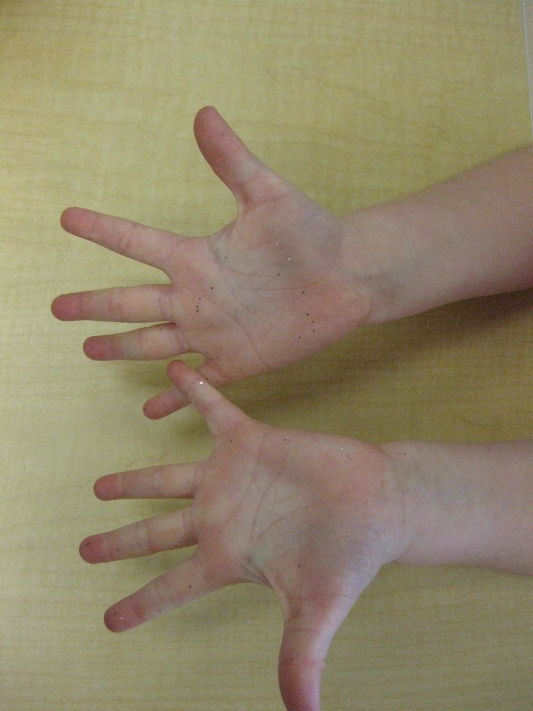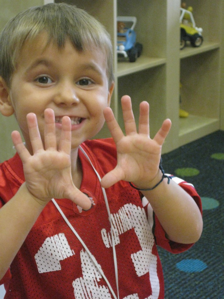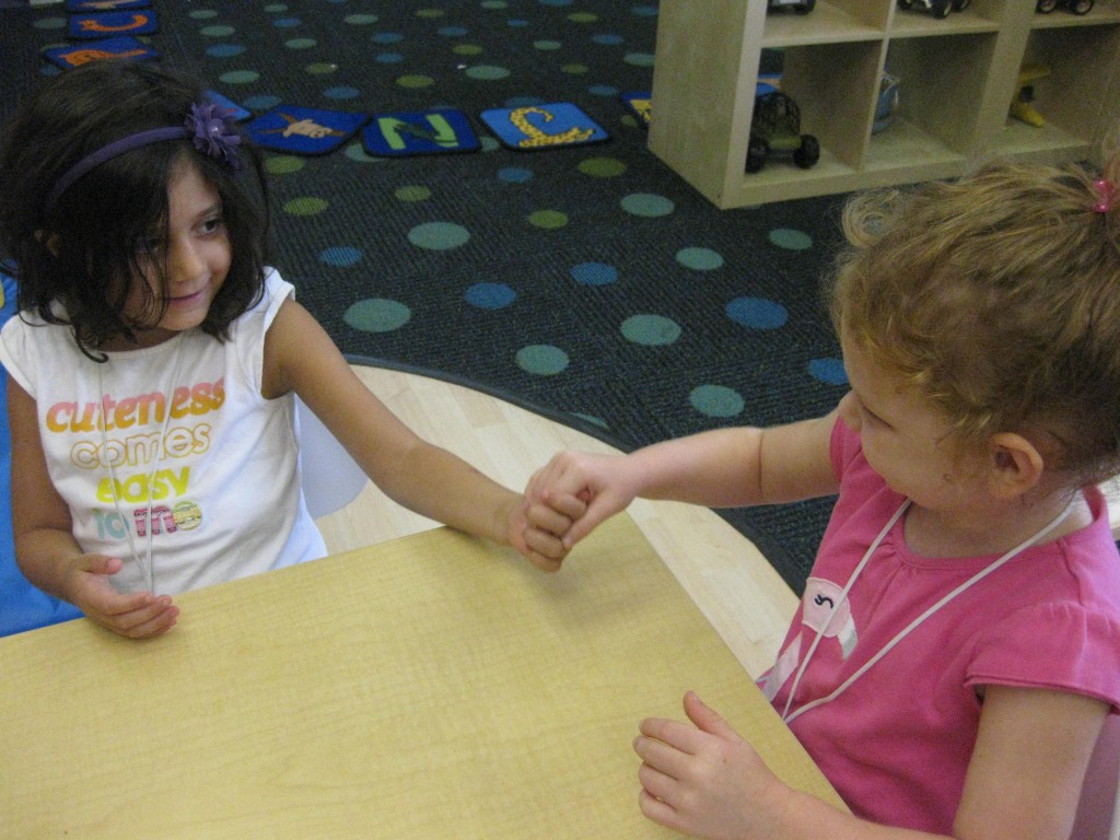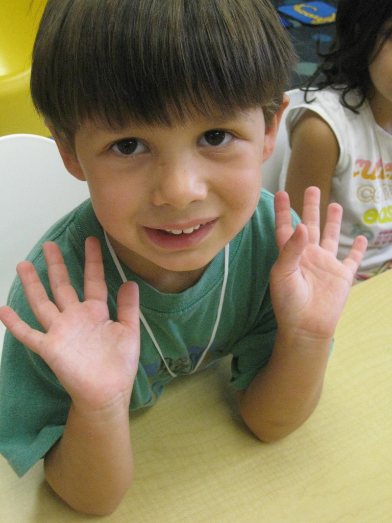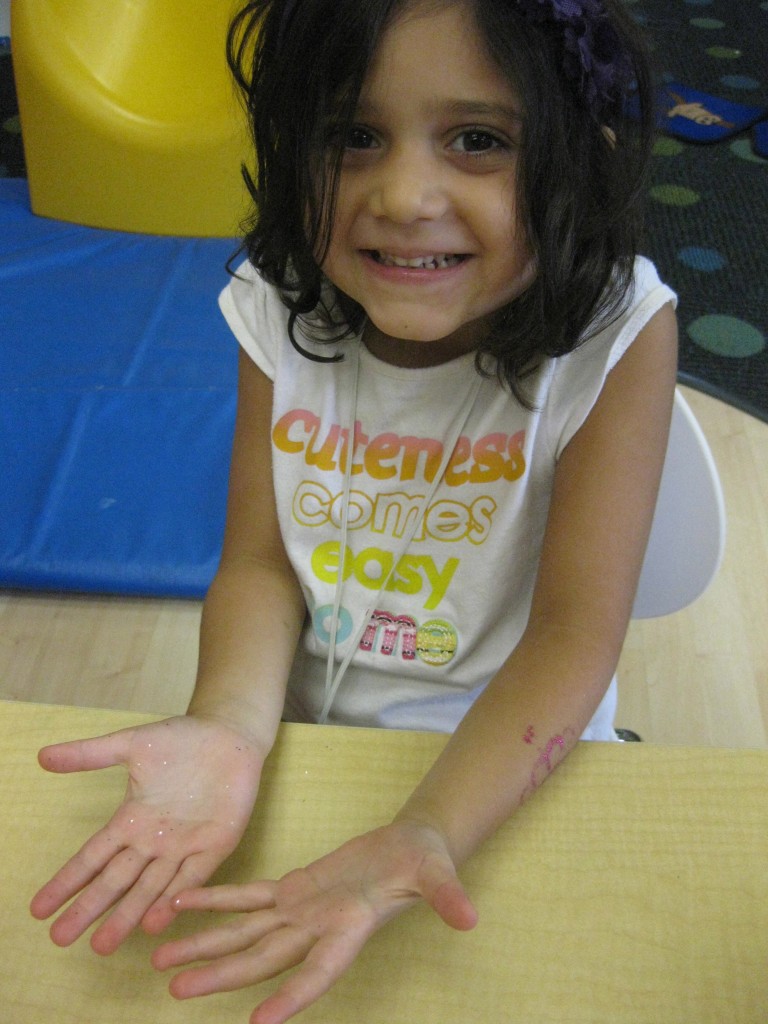 We quickly realized with our glitter hand sanitizer that germs are easily spread through touch! Greetings and hand holding are an important part of school and friendship, but we learned that keeping our hands clean is also an important part of being a good friend. The glitter spread as we shook hands around our greeting circle. We learned that germs can spread in the same way and it is important to scrub our hands clean before and after we play, before we eat and after we use the potty!