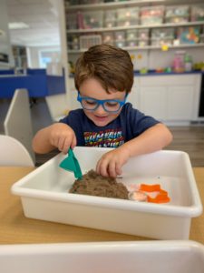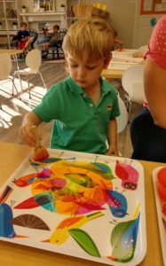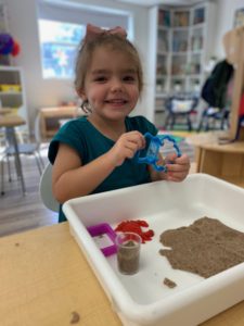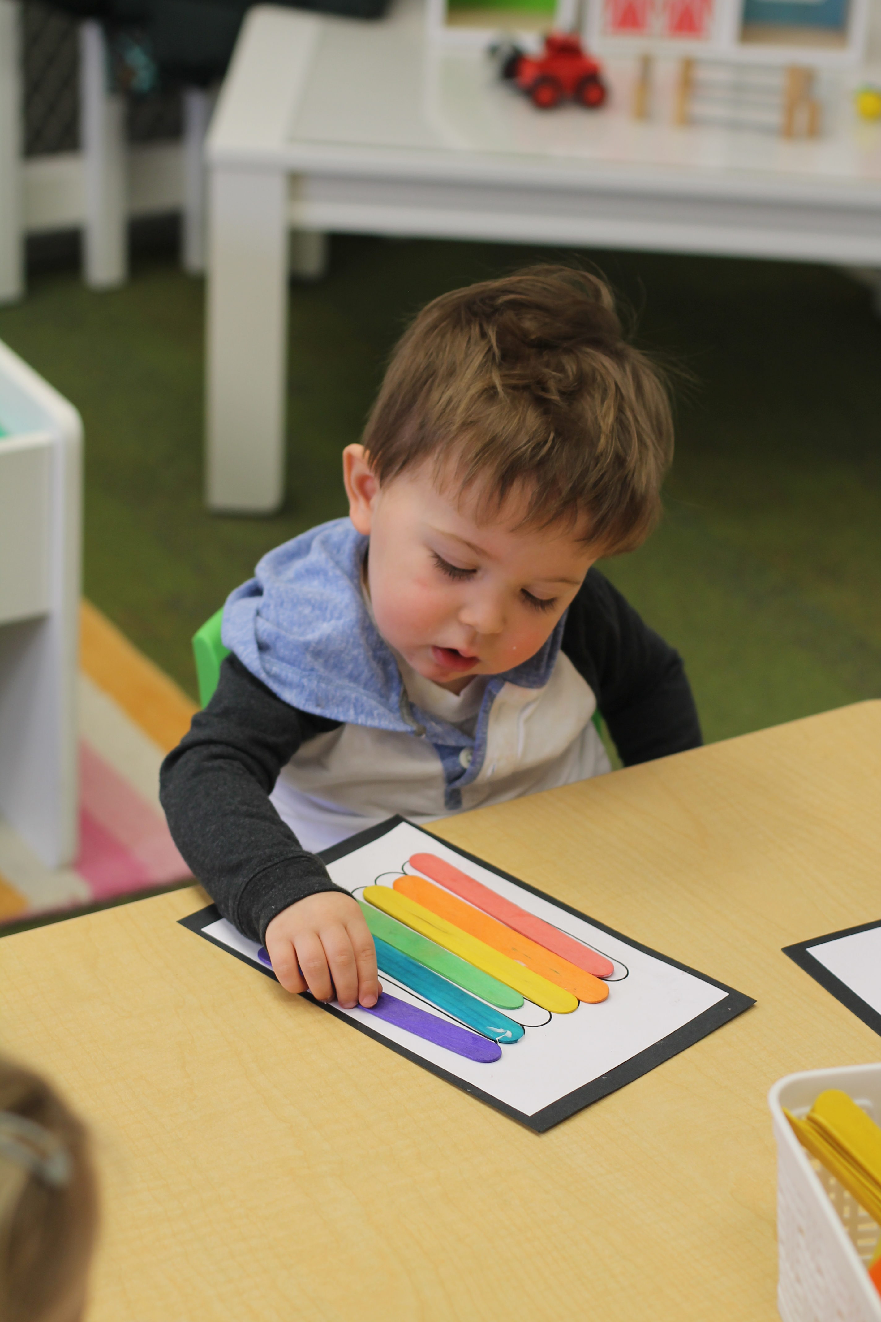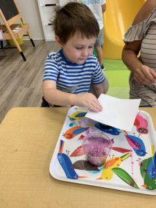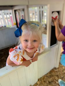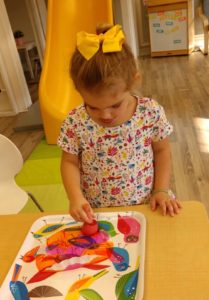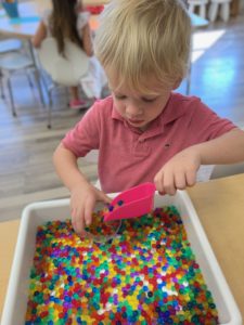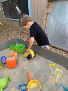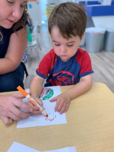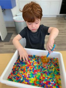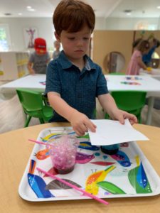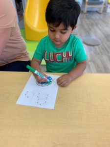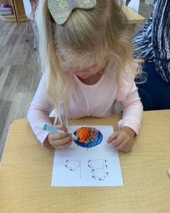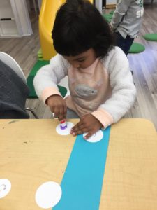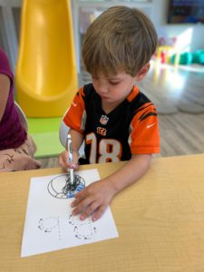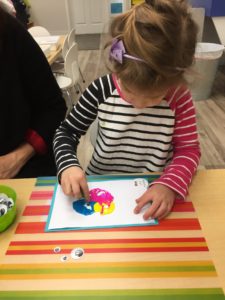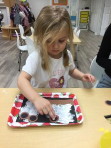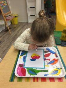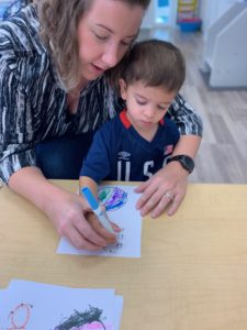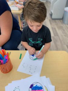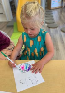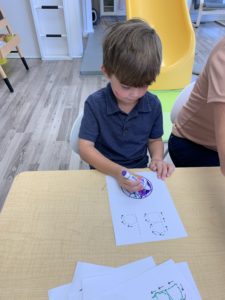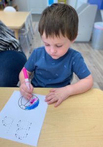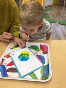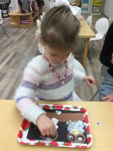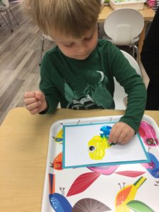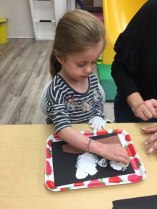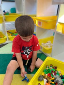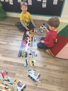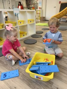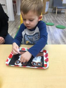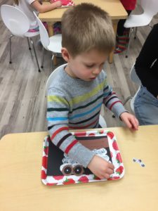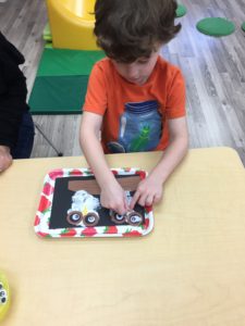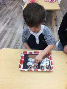 Our students love playing in some of our farm-themed centers. In the sensory tub, they have been hiding the farm animals under the rice and then digging them out! Farm animal noises can be heard a lot during our center time 🙂
