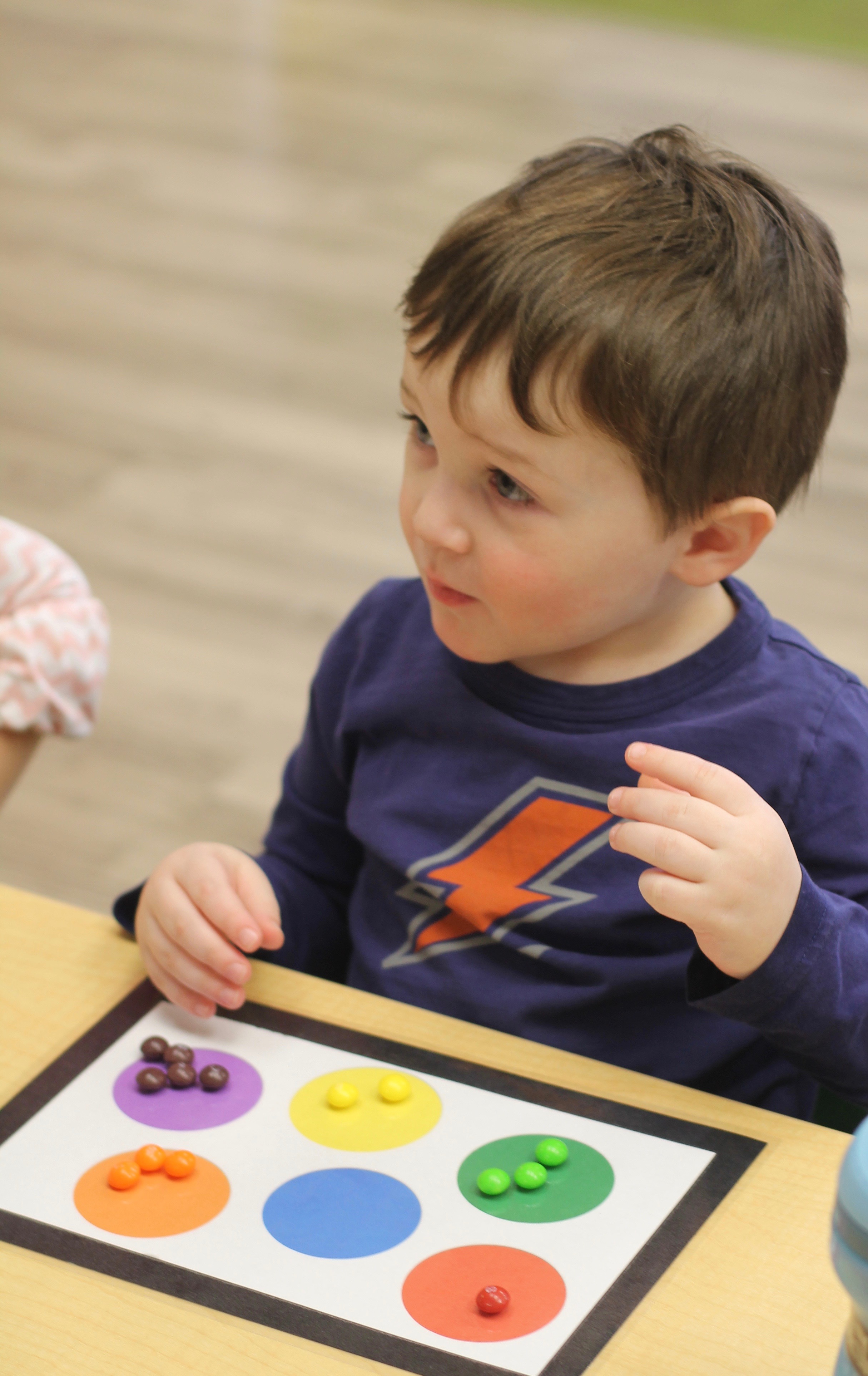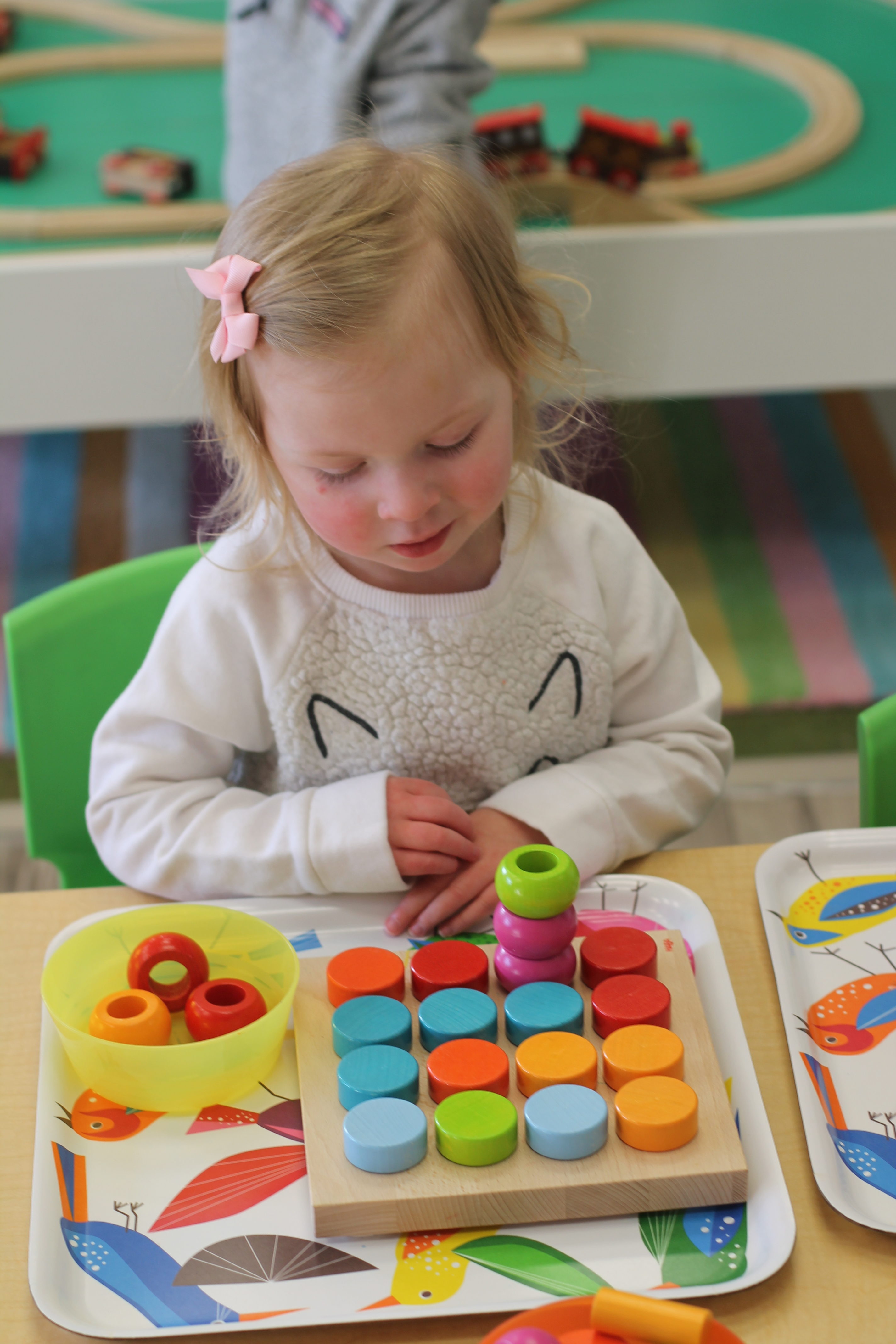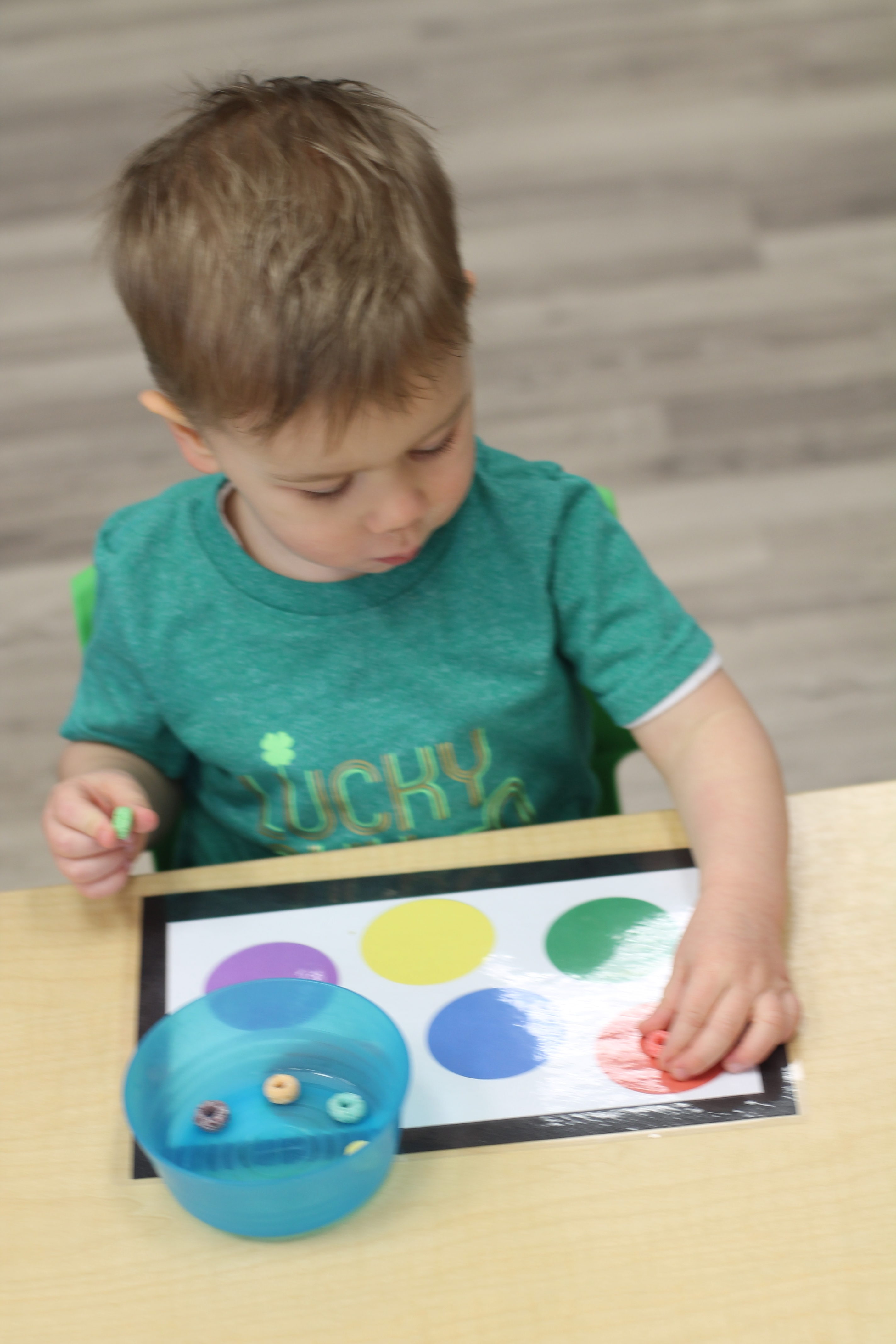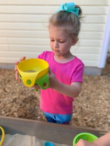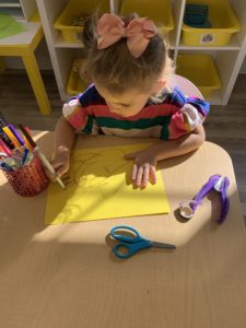 Our students love playing in some of our farm-themed centers. In the sensory tub, they have been hiding the farm animals under the rice and then digging them out! Farm animal noises can be heard a lot during our center time 🙂
