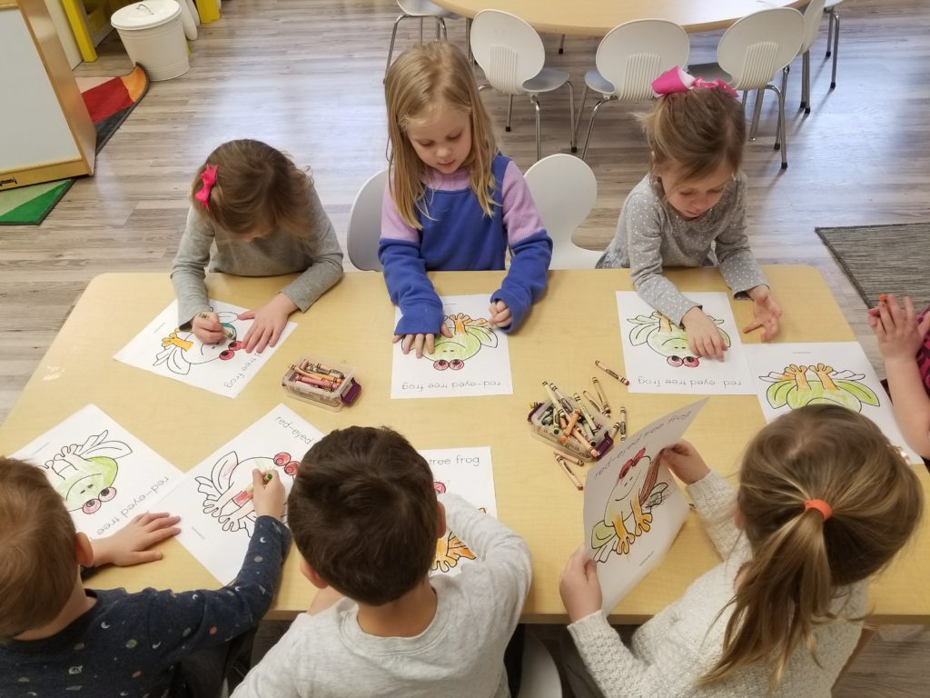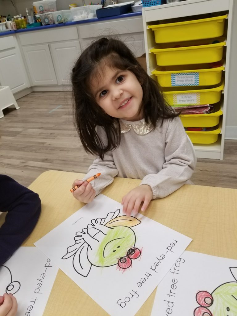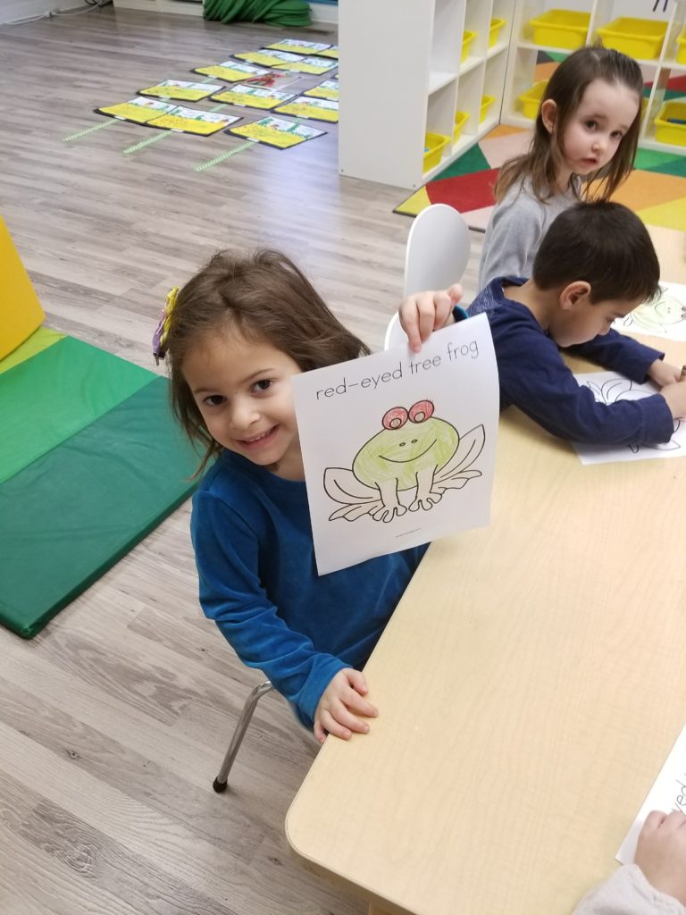 He is a very small frog that lives in the trees and is a bright green with blue and yellow striped sides, orange feet, and bright red eyes!  We read a story about the frog and his habitat and then practiced using real life colors to color our own Red Eyed Tree Frog to take home!