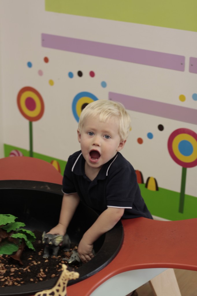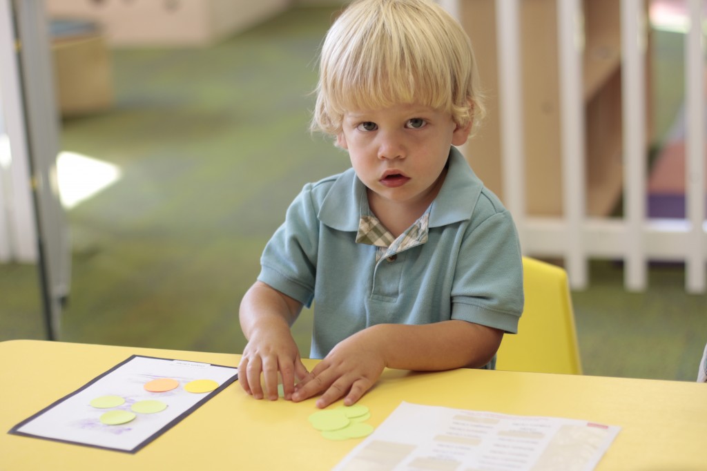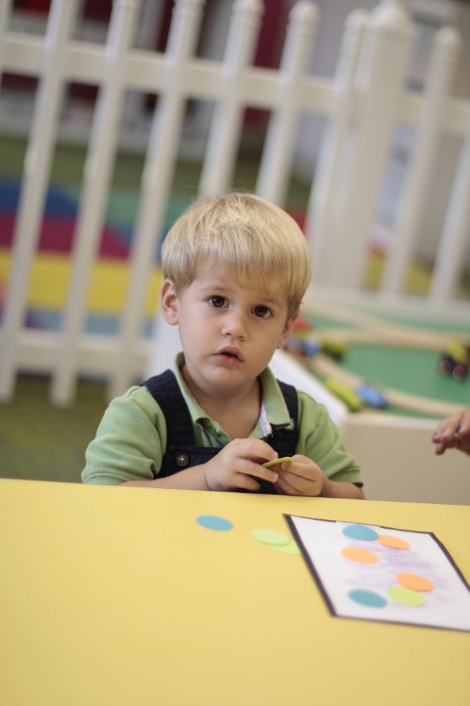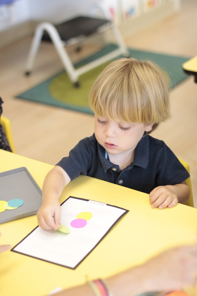 We had a great second day in the early 3’s class! We worked on lining up –and they are quickly learning how to do this! I’m so proud of them! We practiced listening for a “quiet signal” prompt and responding correctly. In small group time, one group of children painted on foil –a fun sensory art activity. Another group of children learned how to play at the kitchen center –knowing how to properly use the center will advance their dramatic play development. The other group learned how to use the learning activities in the Early 3’s center. One of the activities we focused on is a sorting colors and shapes activity.