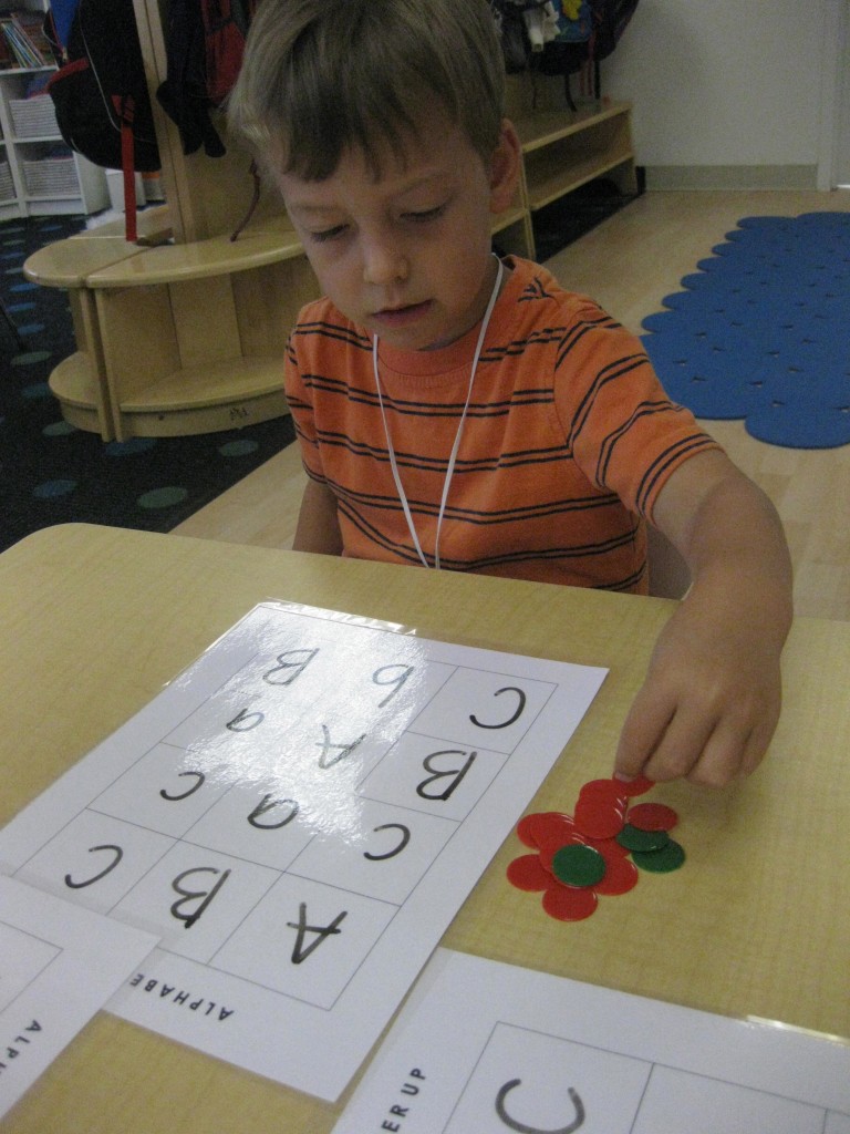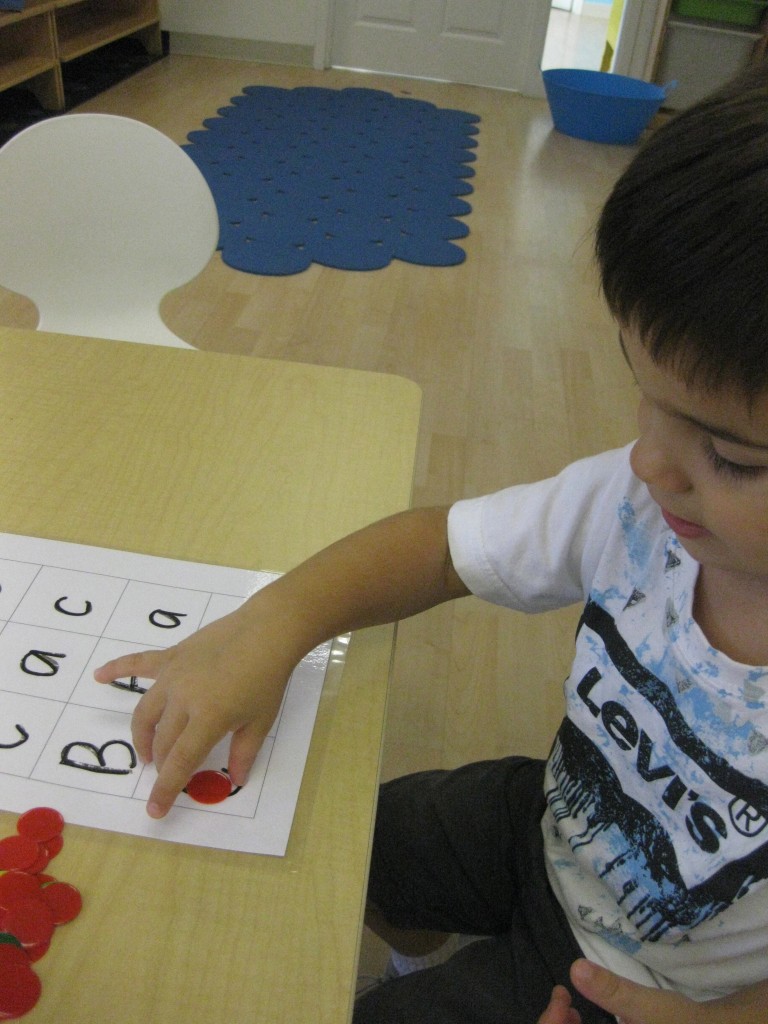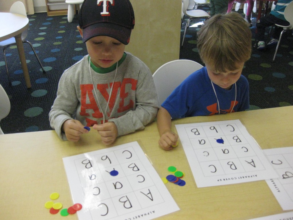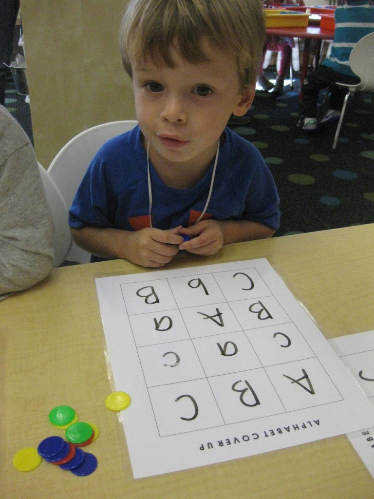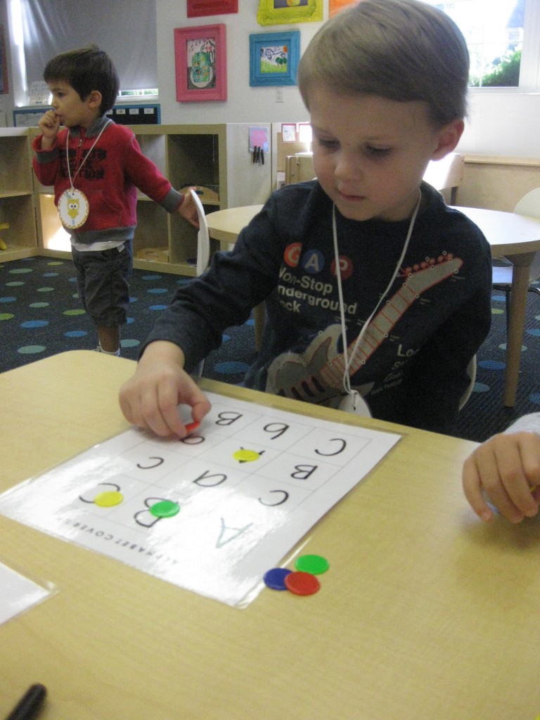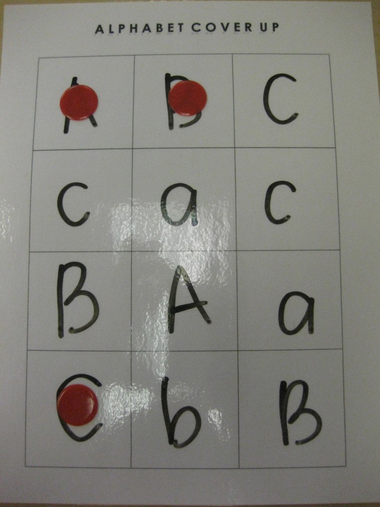 This month in preschool we are focusing on the letters Aa, Bb, Cc. Today during small groups we played Alphabet Coverup to practice our letters. Each preschooler has a Alphabet Coverup game board in their homework folder. This is a great tool for all kinds of learning fun. This morning, I wrote A, a, B, b, C, c on the board. This is an easy way to practice letter recognition and letter sounds. Have fun with your preschooler practicing letters!