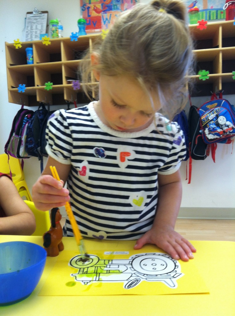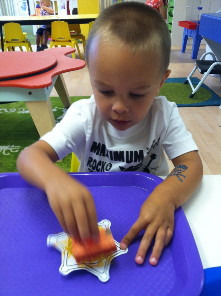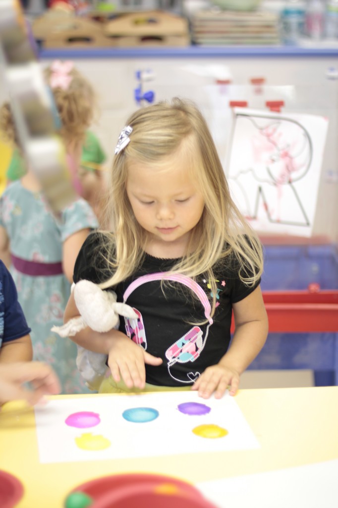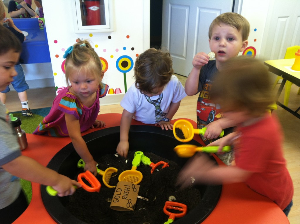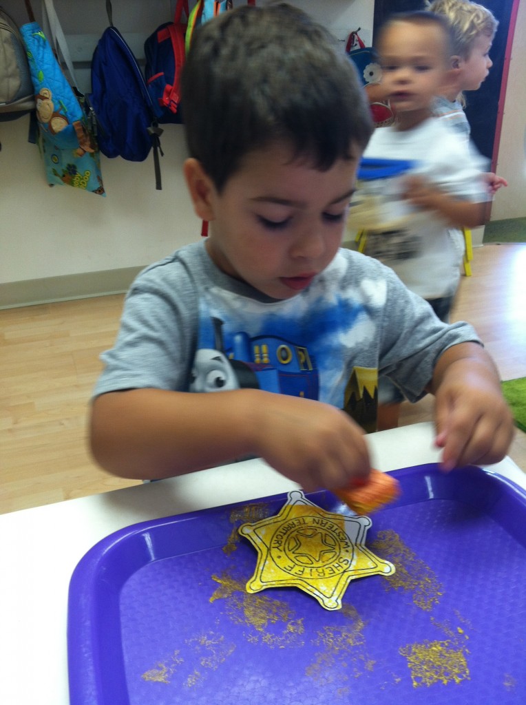 This week the Toddlers are exploring the Wild West. We have lots of fun things planned as the week goes on! On Monday, we sang, “Shoo Fly Don’t Bother Me” at group time and did a fun (and messy) art project to go along with it. In the sensory tub, the boys and girls can search for gold! The children are making new friends and loving all of the new centers we have put out for this week.