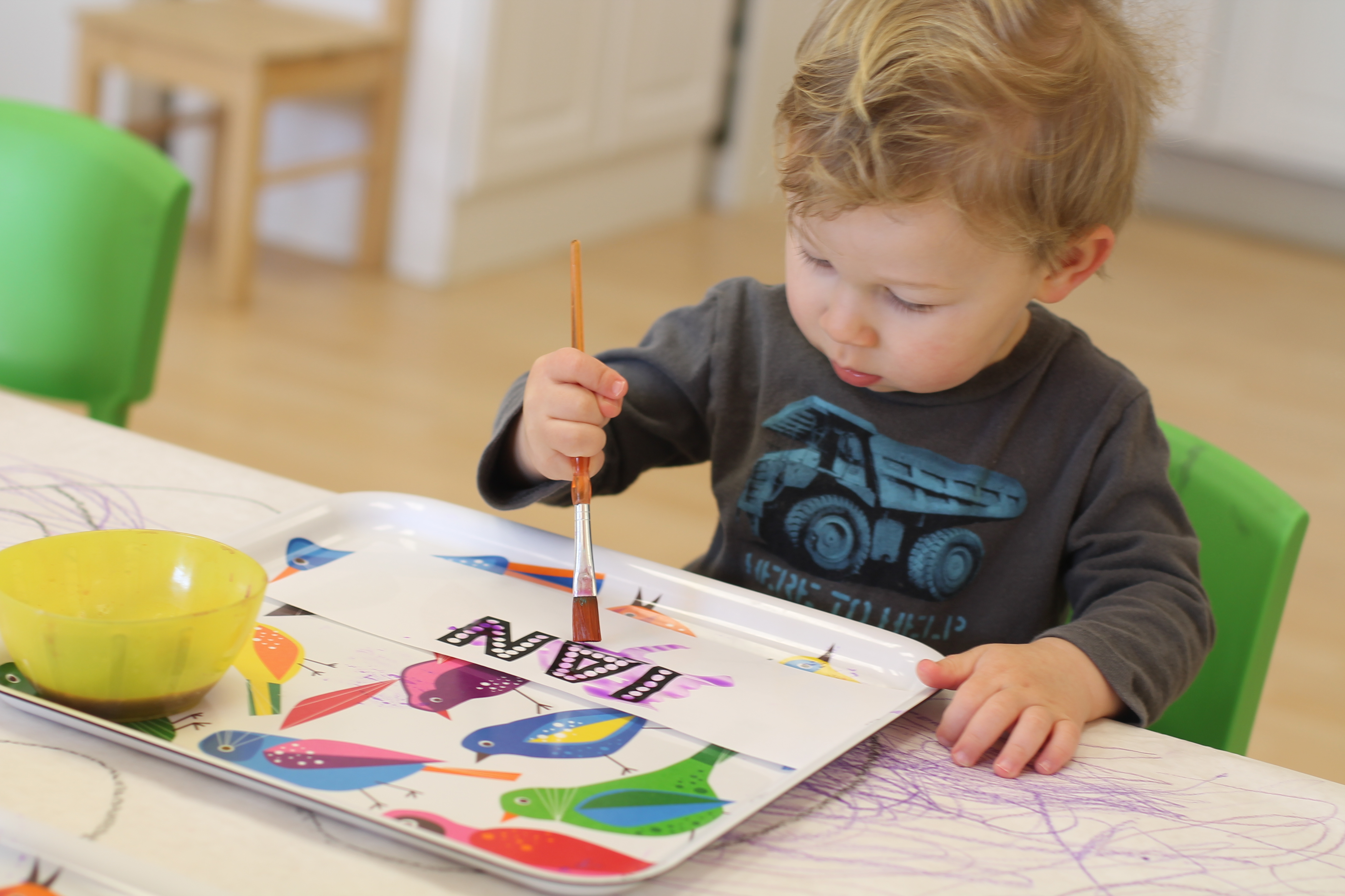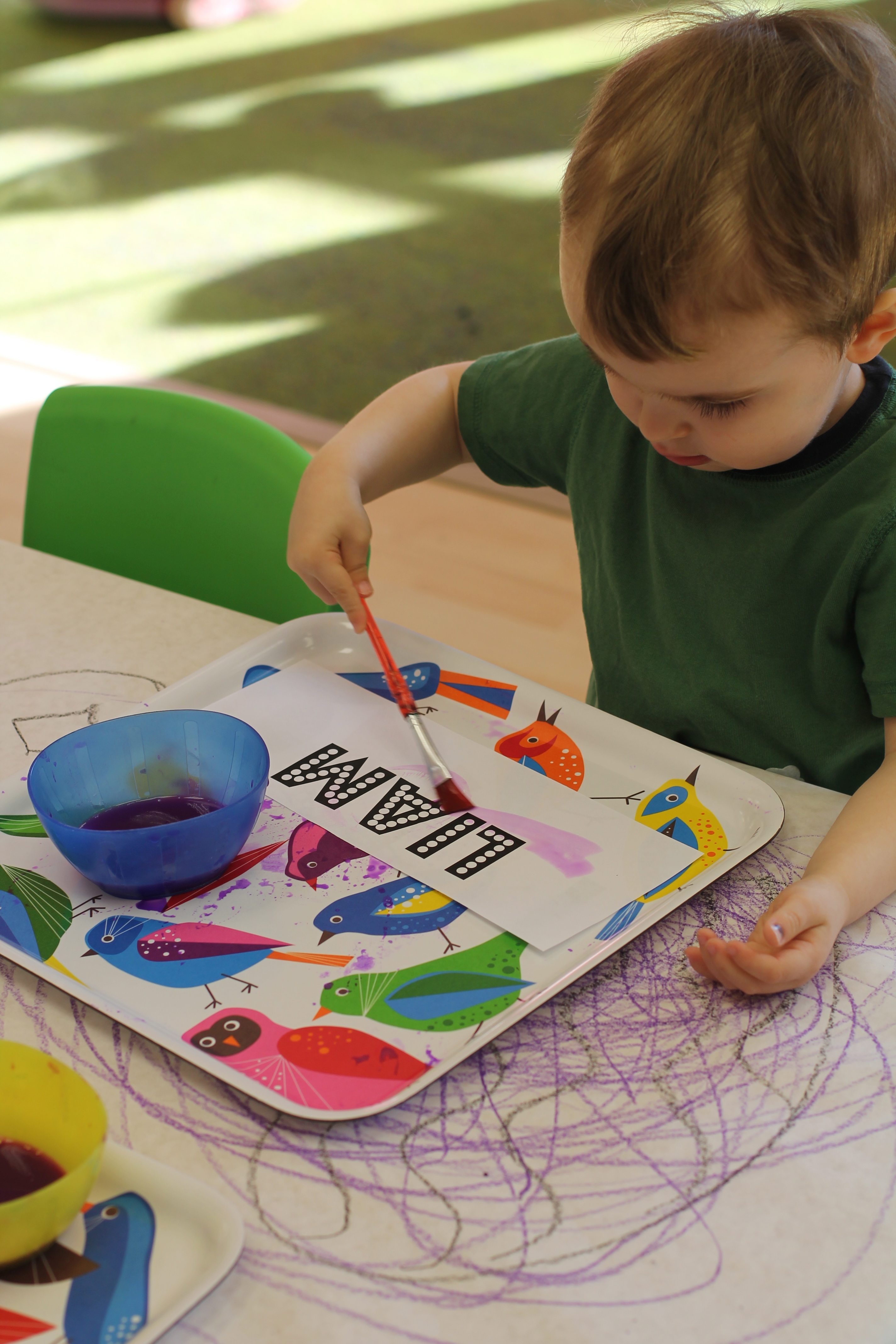 This activity is all about exploring their names to help the boys and girls begin to recognize them. Recognizing their names is the first step to early literacy.  Their names have meaning and value to them…it’s personal.  One of the best places to start early letter recognition is through name activities.  Be sure to make it fun…write it with chalk when you’re playing outside…write it in the sandbox or even in the steam on the bathroom mirror after bath time.  If you’re feeling adventurous use play dough to spell it!  The great thing about play-based, name recognition activities is they won’t even know their learning…they’ll just know their spending time with you!