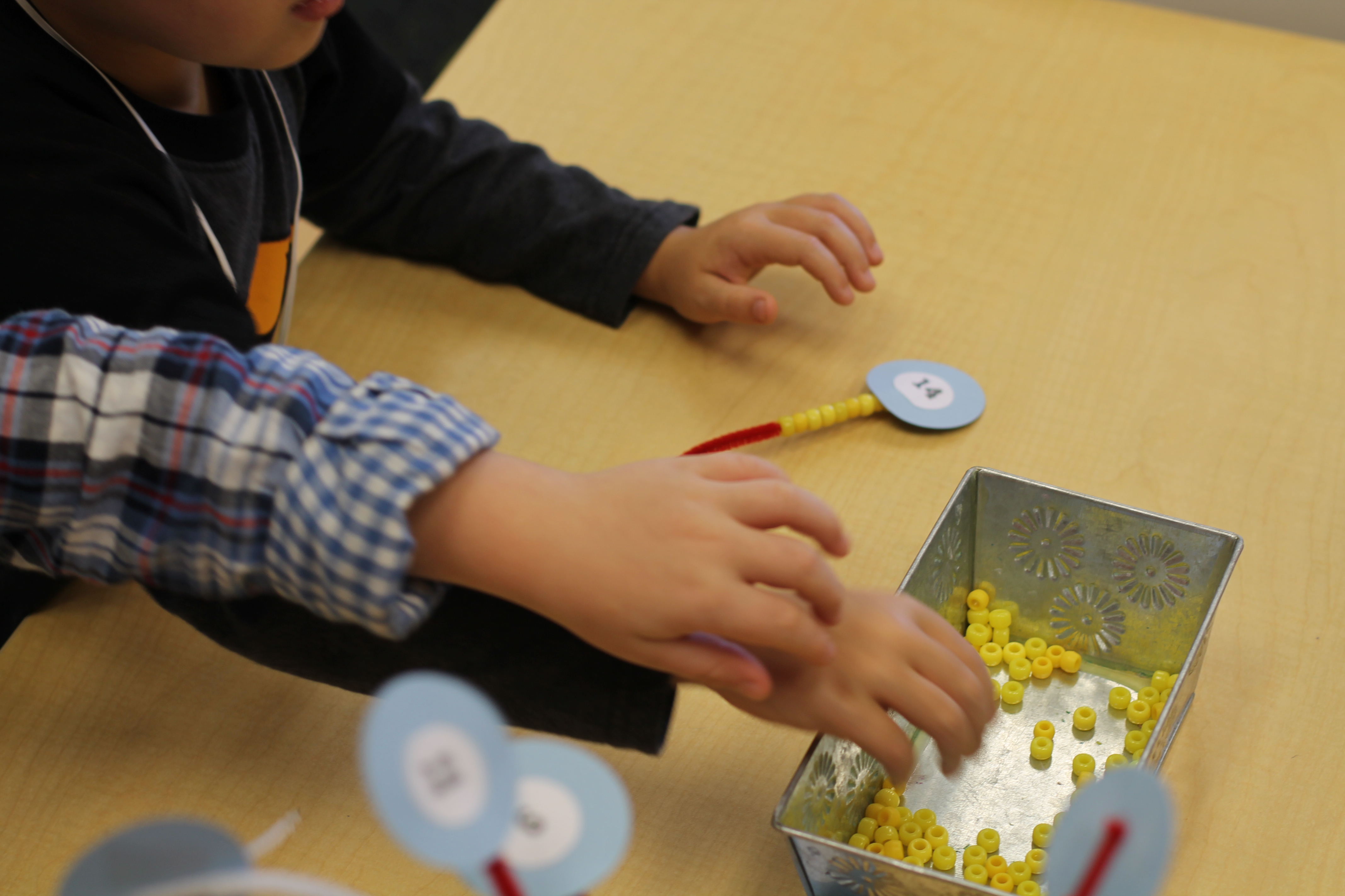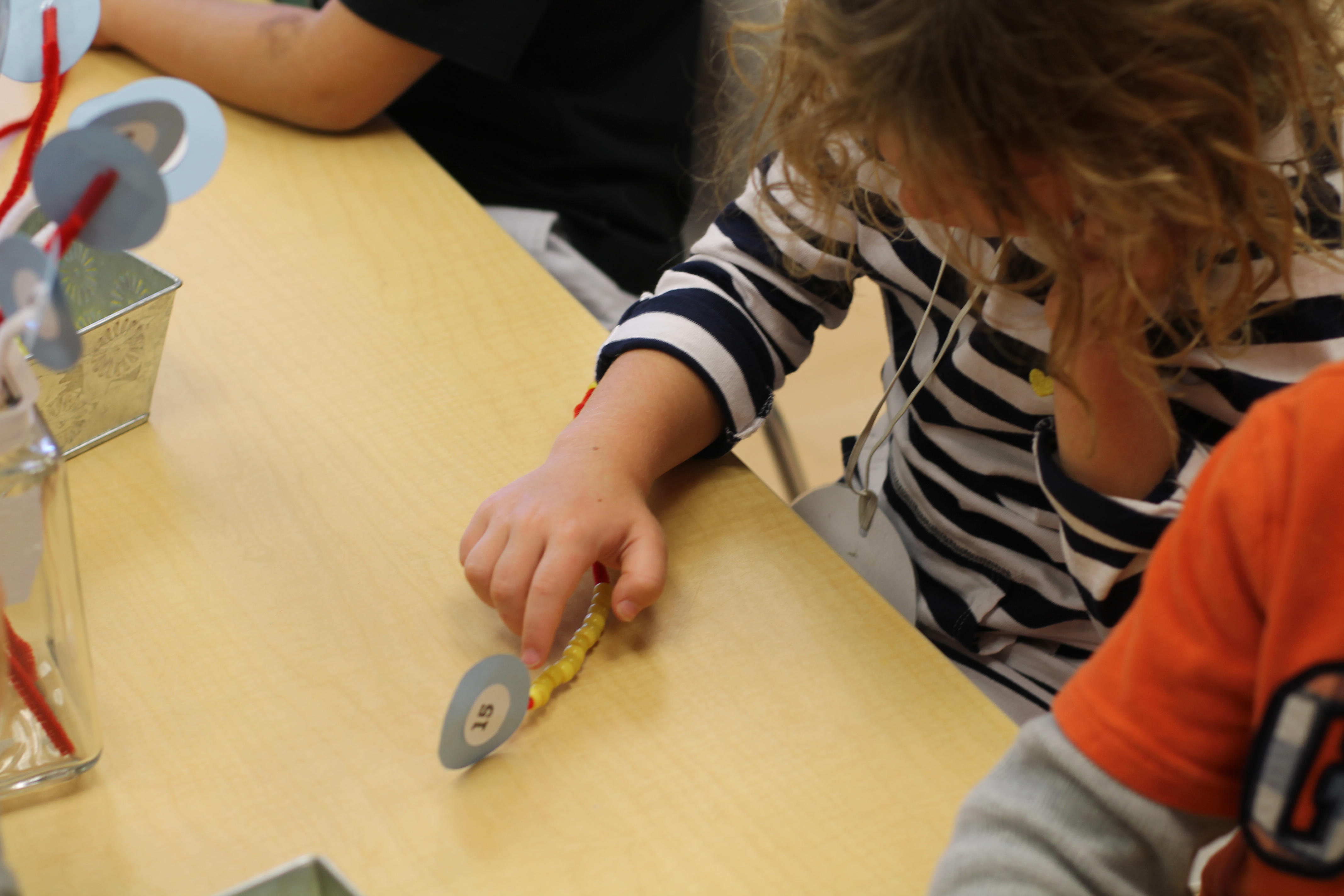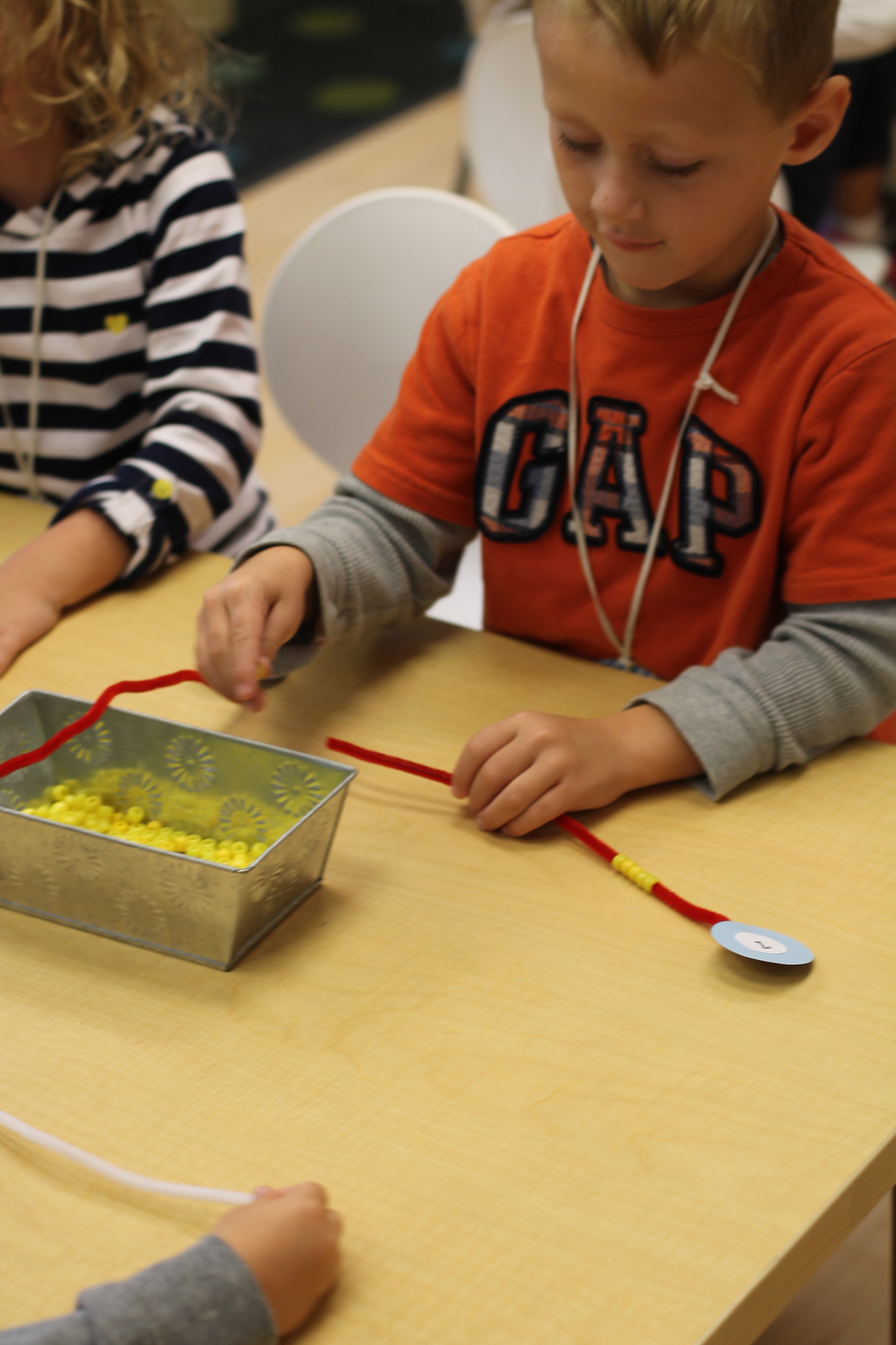 We counted beads onto pipe cleaners! This helped us practice some fine motor skills!