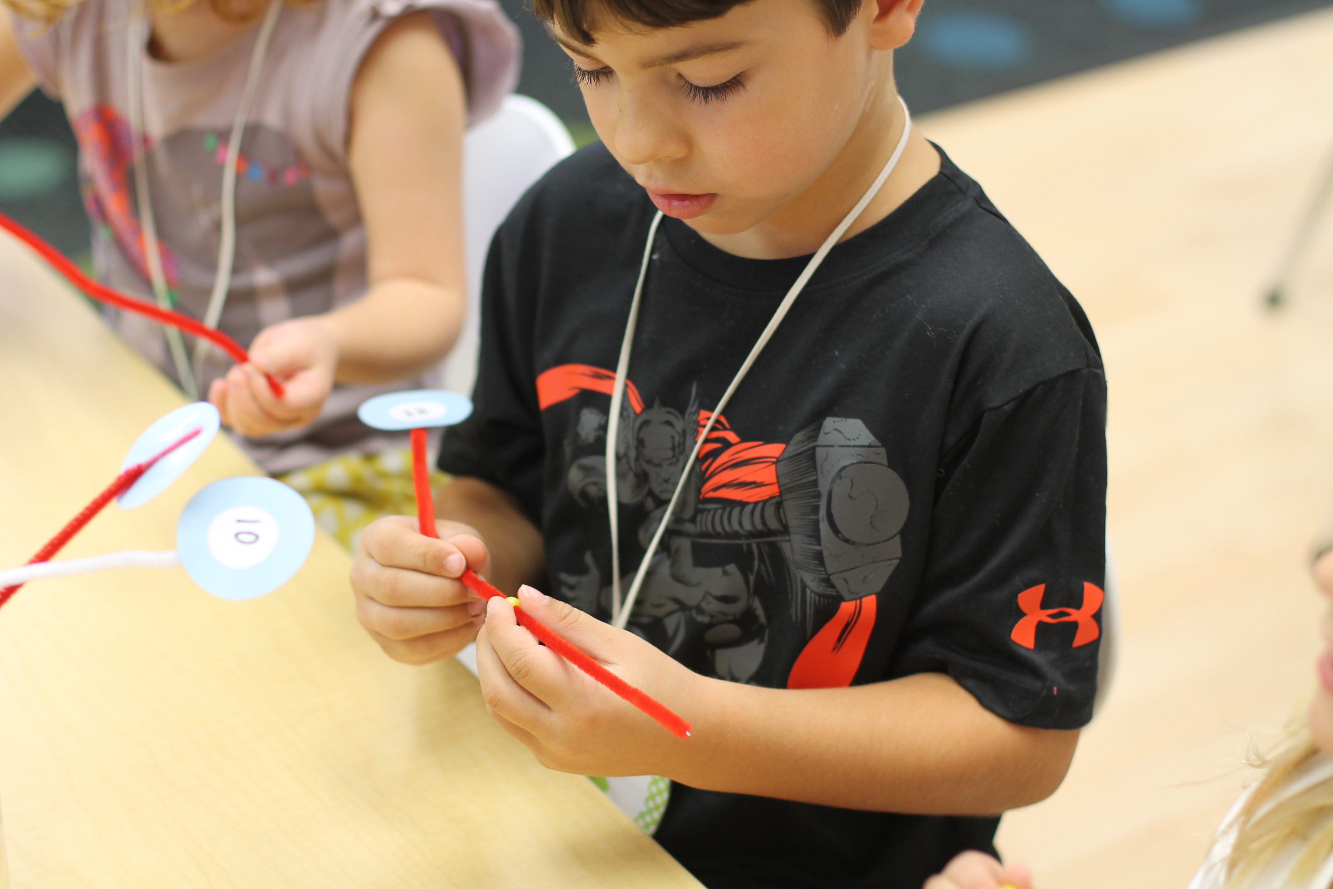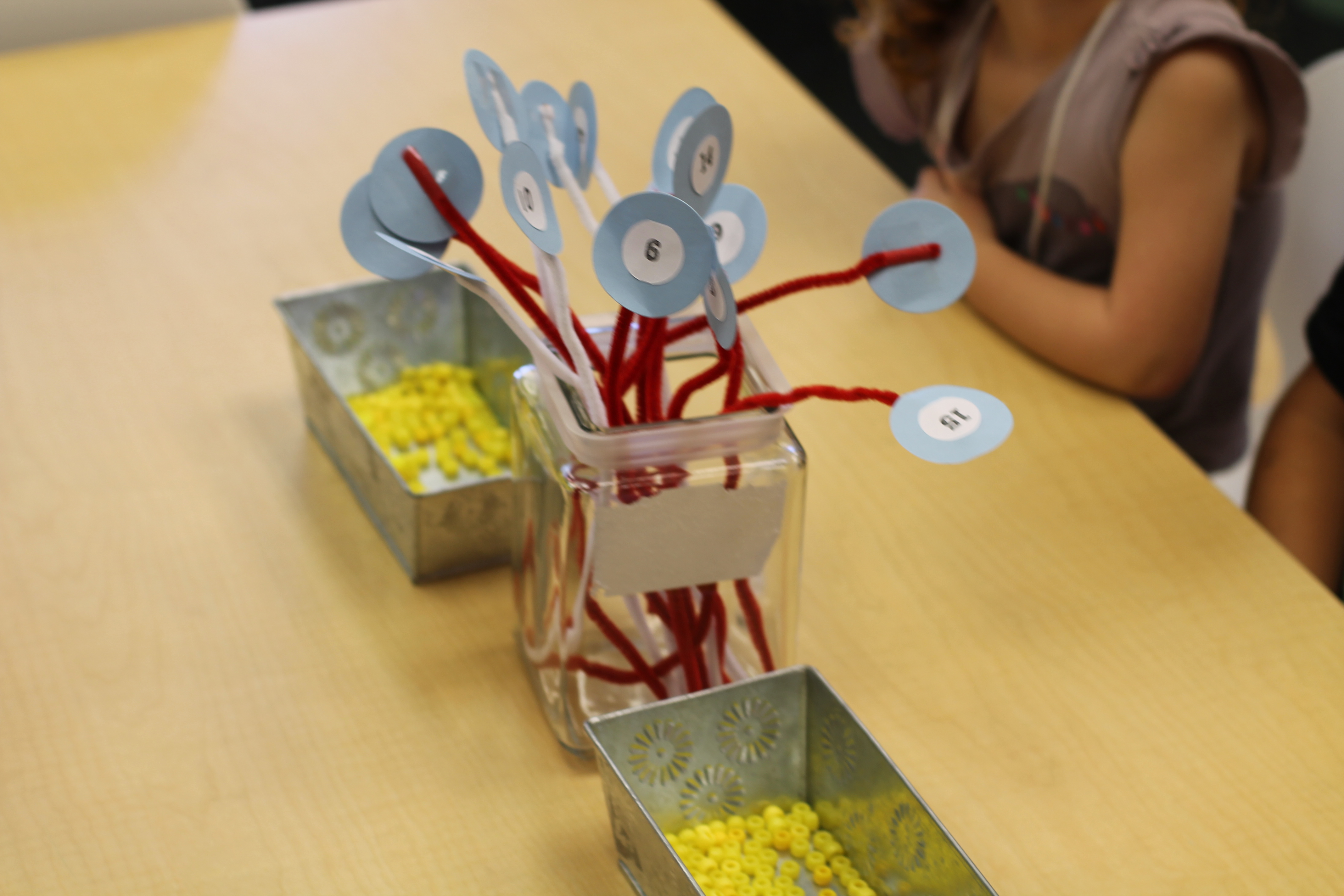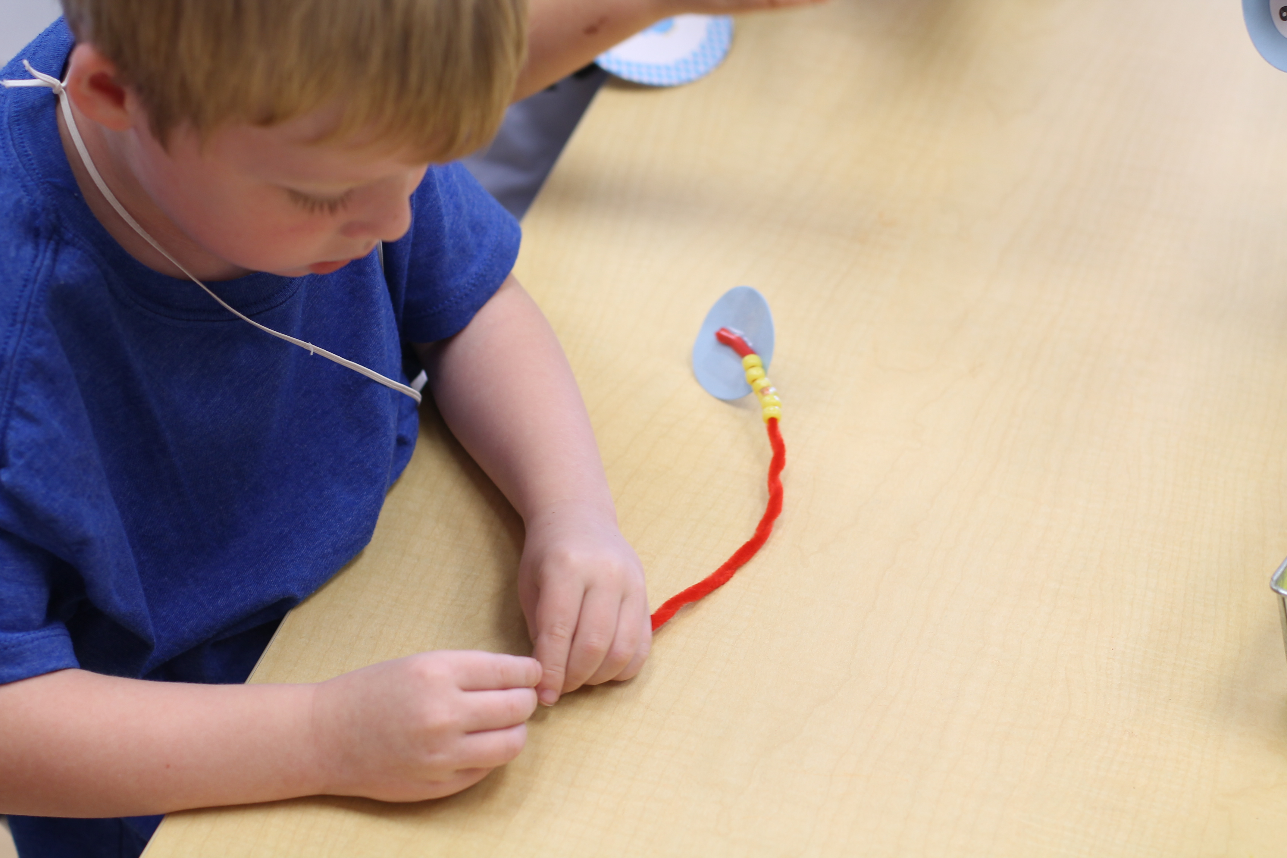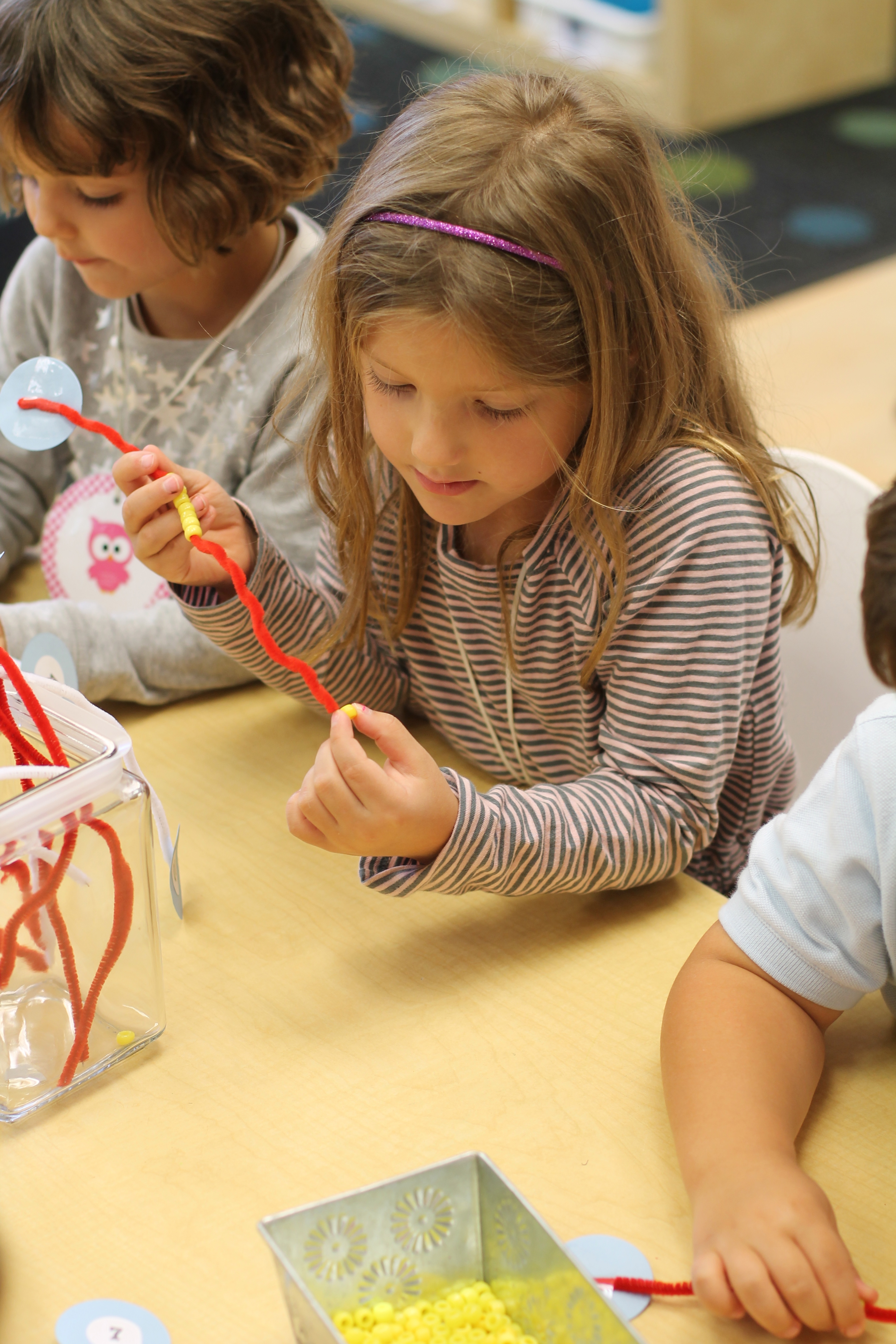 We counted beads onto pipe cleaners! This helped us practice some fine motor skills!