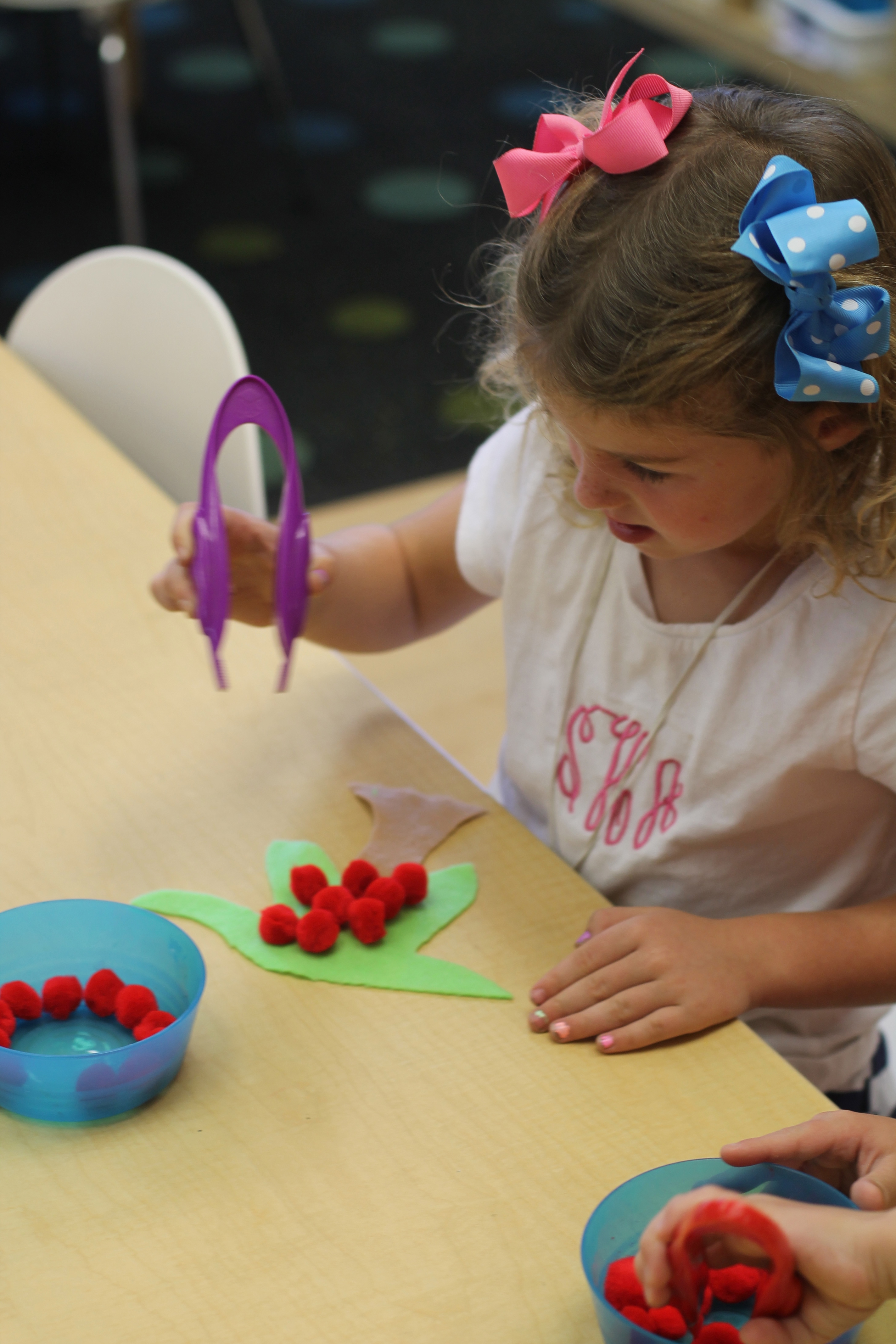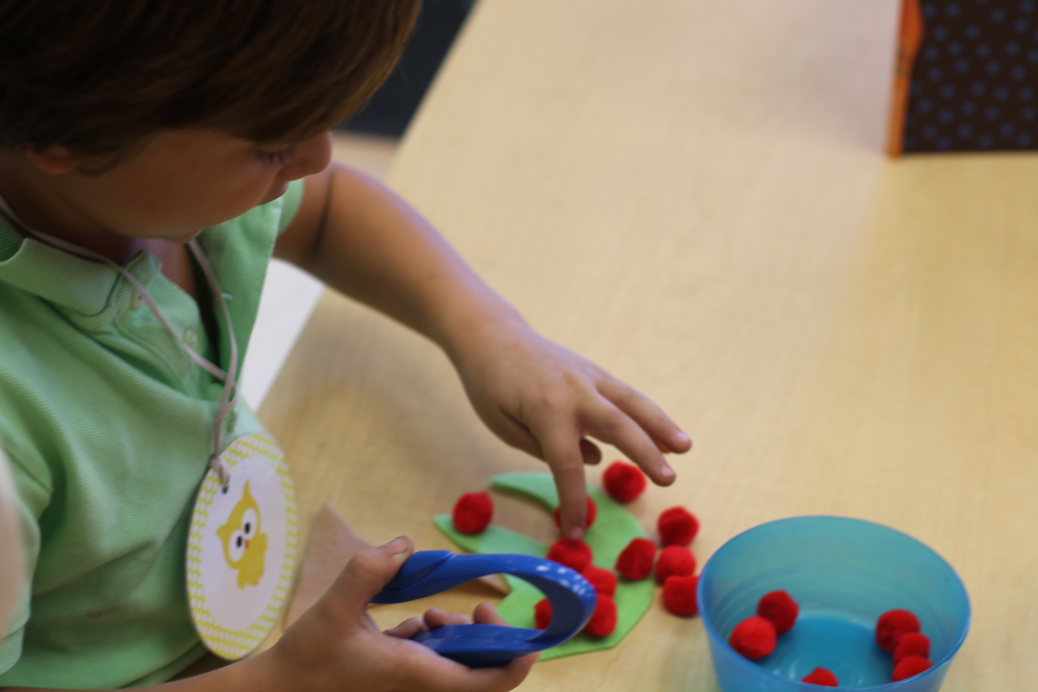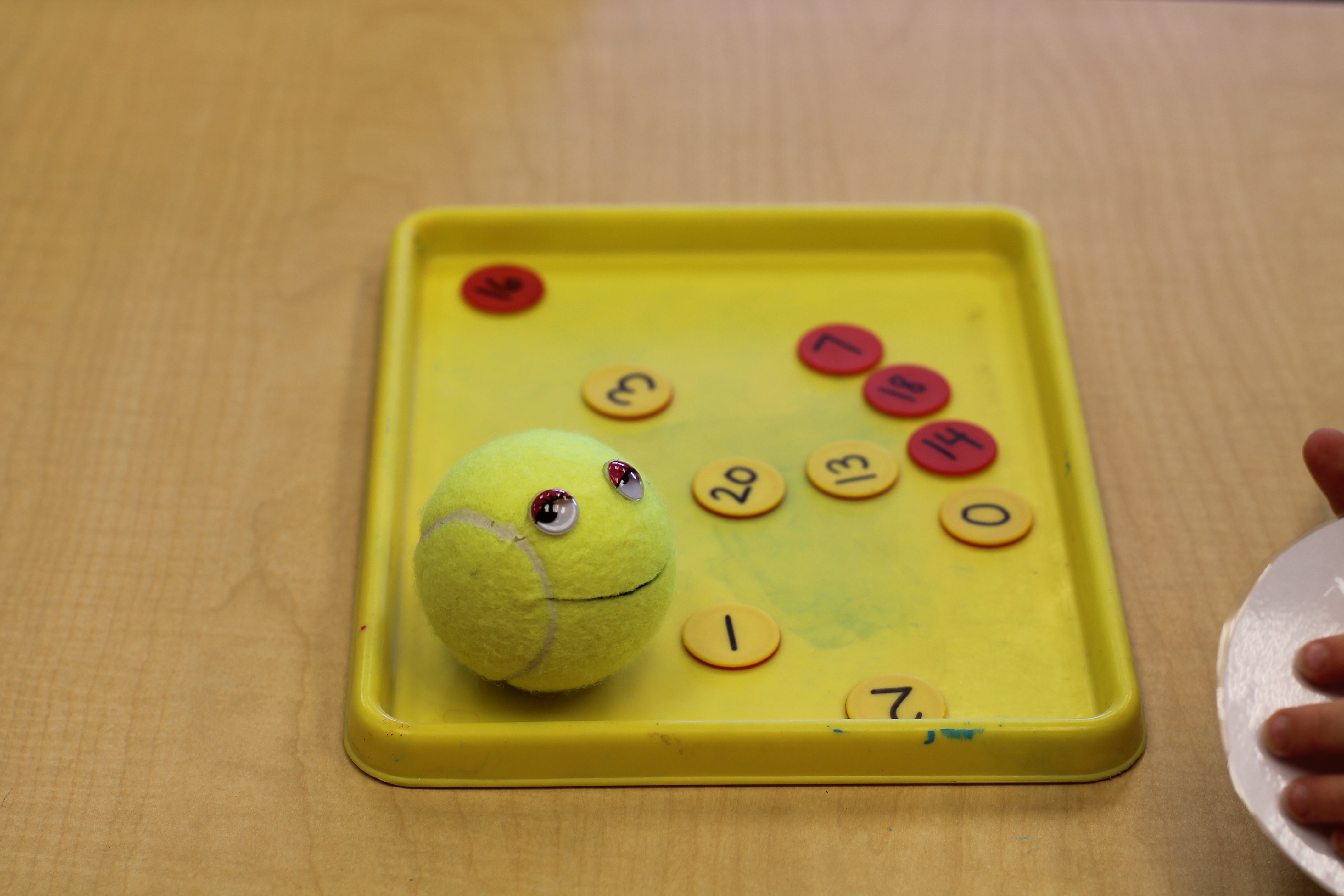 The students practiced number recognition and counting by rolling a set of dice, counting the dots on the dice and feeding their tennis ball friend a chip with that number on it! This game is great for our fine motor skills and is fun too!