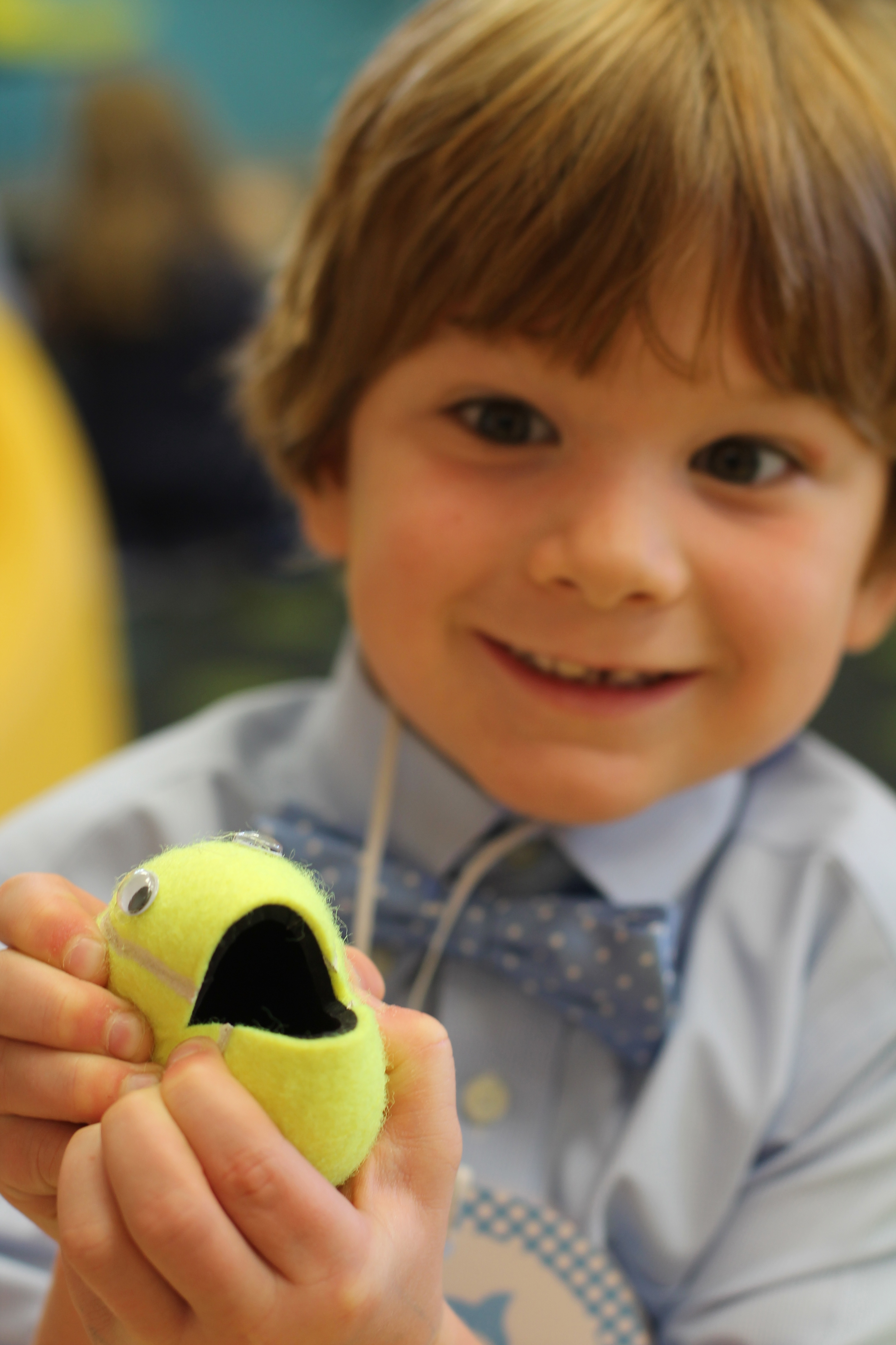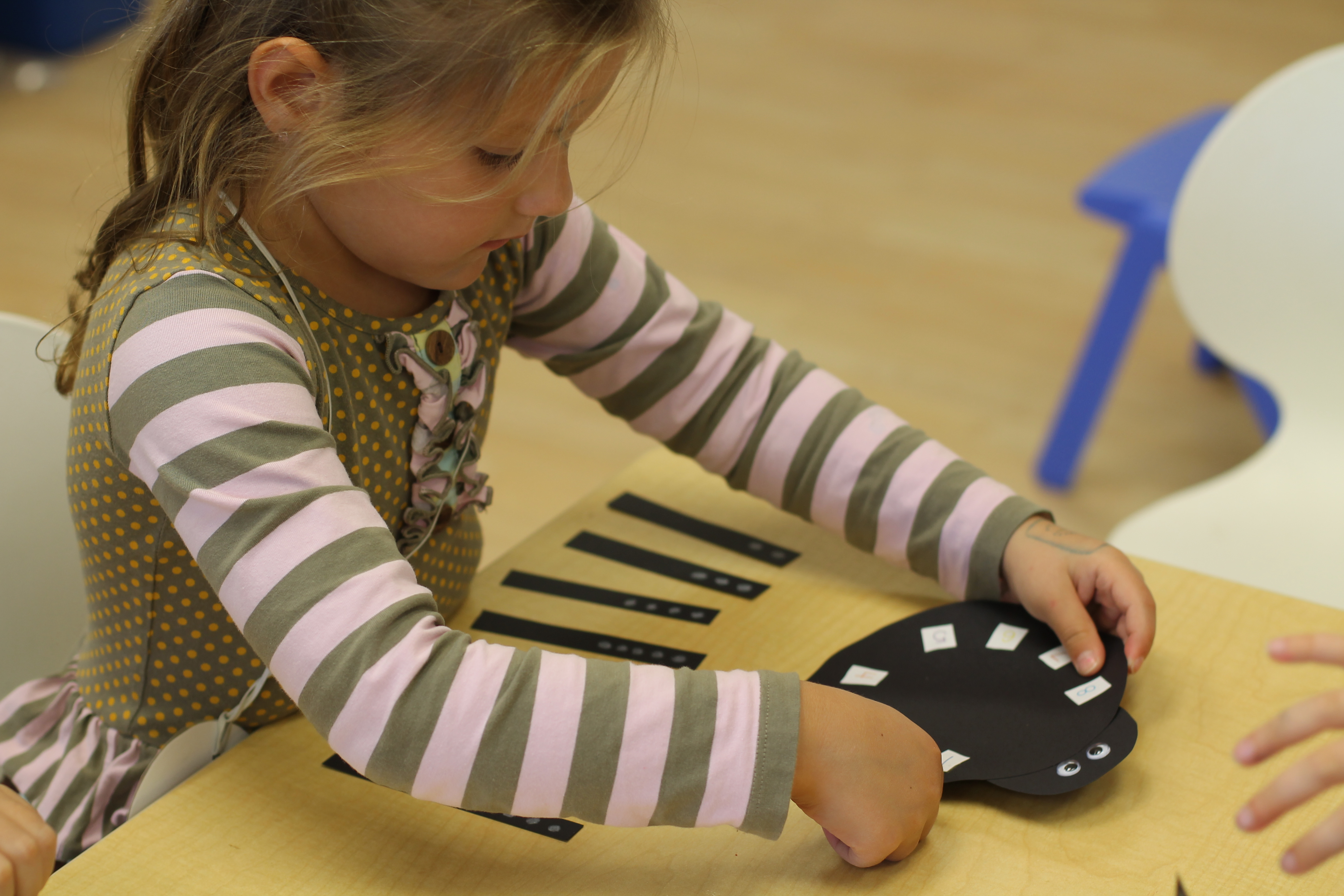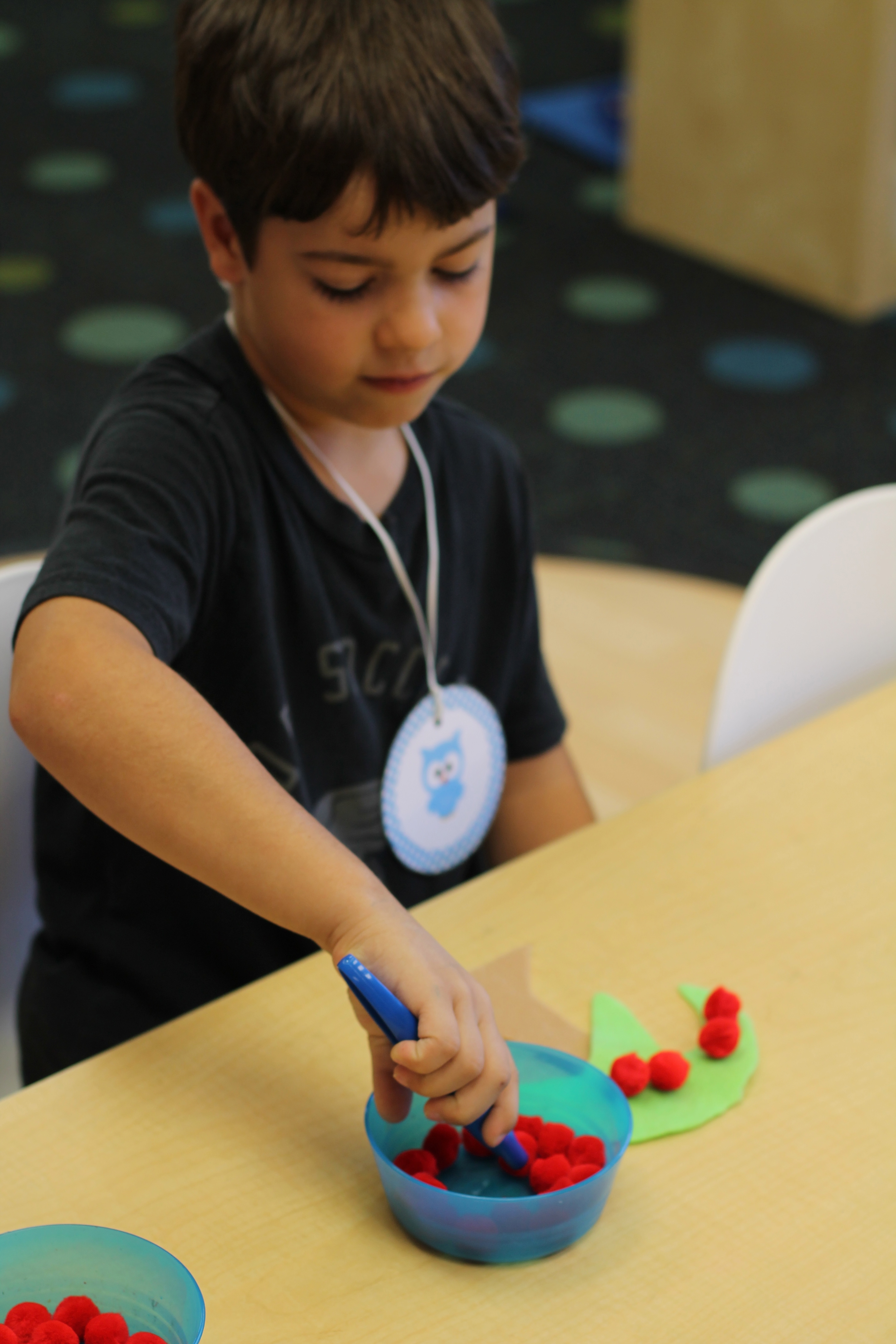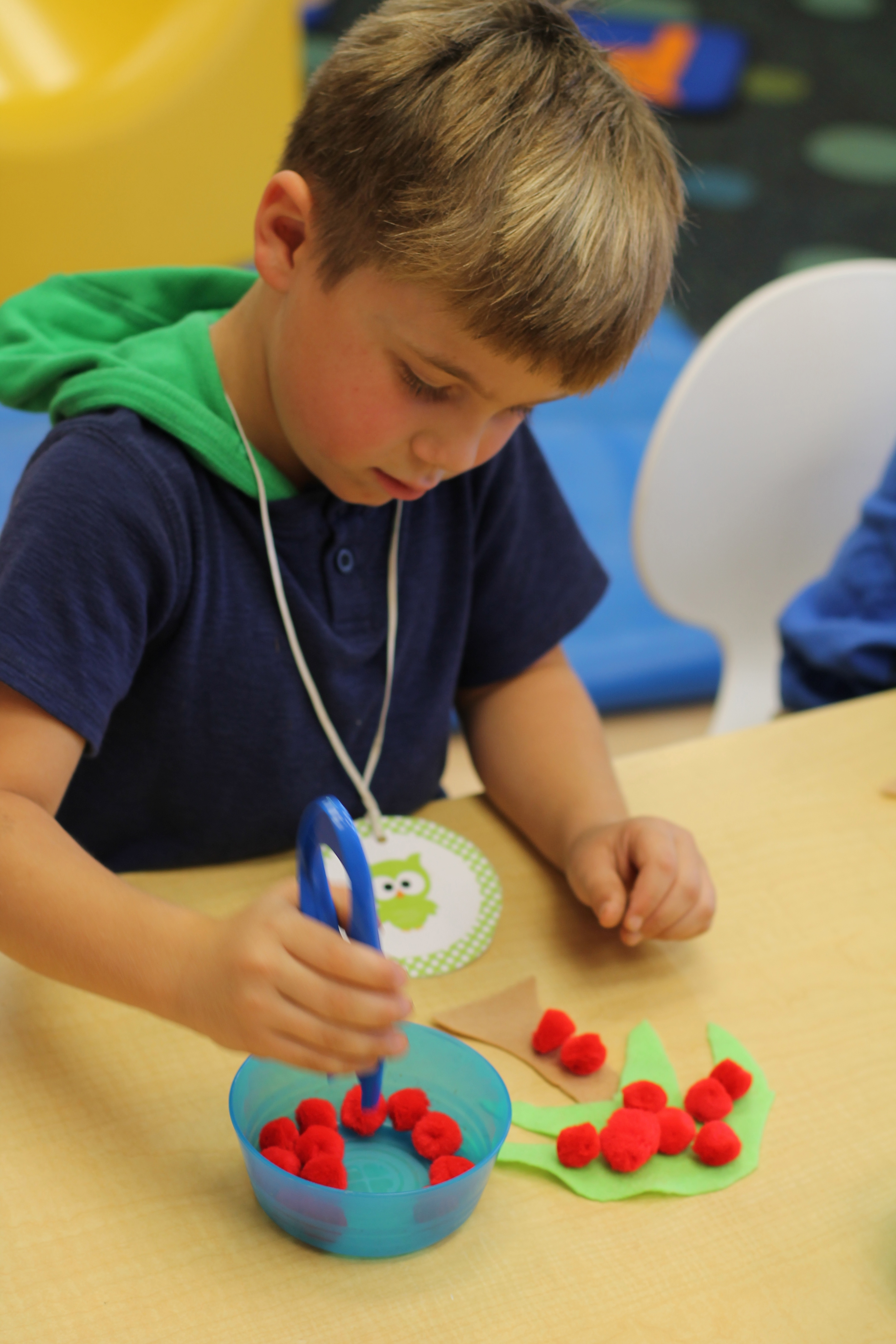 The students practiced number recognition and counting by rolling a set of dice, counting the dots on the dice and feeding their tennis ball friend a chip with that number on it! This game is great for our fine motor skills and is fun too!